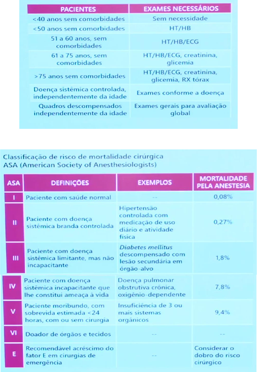 RISCO CIRÚRGICO Fatores preditivos de risco • Cirurgia de grande porte ou emergência • Doenças preexistentes • Neoplasias • Nutrição inadequada • Déficits de mobilidade Exames pré operatórios Risco cirúrgico anestésico – risco do paciente morrer pelo evento anestésico FUMANTE É ASA 2 INDEPENDENTE DE DOENÇA Risco cirúrgico cardiológico • Escore de Goldman • Escore de Lee Bibliografia Medcel Sanar CardioPapers
