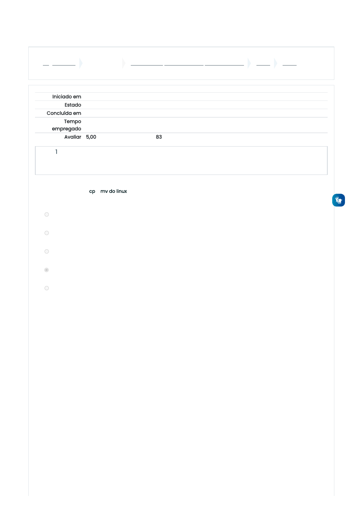 04/10/2022 01:02 Prova: Revisão da tentativa https://ead.ifms.edu.br/mod/quiz/review.php?attempt=1365245&cmid=700767 1/4 Página Inicial Meus cursos Curso FIC - Operador de Computador - 2022.2 Prova Prova Iniciado em segunda, 3 out 2022, 23:53 Estado Finalizada Concluída em segunda, 3 out 2022, 23:59 Tempo empregado 5 minutos 57 segundos Avaliar 5,00 de um máximo de 6,00(83%) Questão 1 Correto Atingiu 1,00 de 1,00 Sobre os comandos cp e mv do linux, podemos afirmar que: Escolha uma opção: a. A única diferença entre os comandos cp e mv é que mv deve ser executado em modo administrativo (com o comando sudo como prefixo) b. O comando cp é utilizado para copiar um arquivo, enquanto que o comando mv é utilizado para copiar uma pasta c. O comando cp é utilizado para abrir/acessar uma pasta, enquanto que o comando mv é utilizado para copiar/mover um arquivo ou pasta d. O comando cp é utilizado para copiar um arquivo ou pasta, enquanto que o comando mv é utilizado para recortar/mover um arquivo ou pasta e. A única diferença entre os comandos cp e mv é que cp deve ser executado em modo administrativo (com o comando sudo como prefixo) Sua resposta está correta. A resposta correta é: O comando cp é utilizado para copiar um arquivo ou pasta, enquanto que o comando mv é utilizado para recortar/mover um arquivo ou pasta https://ead.ifms.edu.br/ https://ead.ifms.edu.br/course/view.php?id=28387 https://ead.ifms.edu.br/course/view.php?id=28387§ion=9 https://ead.ifms.edu.br/mod/quiz/view.php?id=700767 04/10/2022 01:02 Prova: Revisão da tentativa https://ead.ifms.edu.br/mod/quiz/review.php?attempt=1365245&cmid=700767 2/4 Questão 2 Correto Atingiu 1,00 de 1,00 Questão 3 Correto Atingiu 1,00 de 1,00 Questão 4 Correto Atingiu 1,00 de 1,00 O fato do Ubuntu 20.04 ser uma versão LTS implica que: Escolha uma opção: a. Esta versão é mais leve que as versões normais do Ubuntu (Light Tracing System) b. Esta é uma versão estável que terá suporte da Canonical (empresa que mantém o Ubuntu) por alguns anos c. Não haverá outra versão do Ubuntu nos próximos 10 anos d. Esta versão performa de forma mais rápida que as versões normais do Ubuntu (Light Transference System) e. Esta é uma versão estável que terá suporte da Canonical (empresa que mantém o Ubuntu) até que chegue a versão 20.10 Sua resposta está correta. A resposta correta é: Esta é uma versão estável que terá suporte da Canonical (empresa que mantém o Ubuntu) por alguns anos O atalho correto para abrir o Windows Explorer, que é o gerenciador de pastas e arquivos do Windows 10, é: WINDOWS + E Sua resposta está correta. A resposta correta é: O atalho correto para abrir o Windows Explorer, que é o gerenciador de pastas e arquivos do Windows 10, é: [WINDOWS + E] Para limpar a tela do terminal no linux, podemos utilizar o comando . clear Sua resposta está correta. A resposta correta é: Para limpar a tela do terminal no linux, podemos utilizar o comando [clear]. 04/10/2022 01:02 Prova: Revisão da tentativa https://ead.ifms.edu.br/mod/quiz/review.php?attempt=1365245&cmid=700767 3/4 Questão 5 Incorreto Atingiu 0,00 de 1,00 Questão 6 Correto Atingiu 1,00 de 1,00 Sobre o pendrive bootável, podemos afirmar que: Escolha uma opção: a. Ele pode ser utilizado para instalar sistemas LTS e BIOS em computadores b. Ele pode ser executado automaticamente assim que o computador for iniciado, carregando algum sistema operacional c. Ele pode instalar a Canonical em um computador d. Ele pode instalar uma BIOS em um computador e. Ele pode instalar o Rufus em um computador Sua resposta está incorreta. A resposta correta é: Ele pode ser executado automaticamente assim que o computador for iniciado, carregando algum sistema operacional Sobre a tecla WINDOWS, que está presente nos teclados ABNT (teclados brasileiros), é correto afirmar que: Escolha uma opção: a. Ela pode ser utilizada no Ubuntu, desde que seja realizada uma pré-configuração b. Em computadores com o Ubuntu, esta tecla é substituída por uma tecla com a logo do Ubuntu c. No Ubuntu, ela é utilizada para exibir as janelas de programas abertas Uhuu, parabéns. d. Em computadores com o Ubuntu, esta tecla é inutilizada e. Ela possui funções apenas quando utilizamos o sistema operacional Windows 10 Sua resposta está correta. A resposta correta é: No Ubuntu, ela é utilizada para exibir as janelas de programas abertas Atividade anterior ◄ AO7 Seguir para... Próxima atividade Prova de Recuperação ► Manter contato Moodle EAD IFMS https://ifms.edu.br https://ead.ifms.edu.br/mod/quiz/view.php?id=700765&forceview=1 https://ead.ifms.edu.br/mod/quiz/view.php?id=700769&forceview=1 https://ifms.edu.br/ 04/10/2022 01:02 Prova: Revisão da tentativa https://ead.ifms.edu.br/mod/quiz/review.php?attempt=1365245&cmid=700767 4/4 Resumo de retenção de dados Obter o aplicativo para dispositivos móveis https://ead.ifms.edu.br/admin/tool/dataprivacy/summary.php https://download.moodle.org/mobile?version=2020061503.02&lang=pt_br&iosappid=633359593&androidappid=com.moodle.moodlemobile