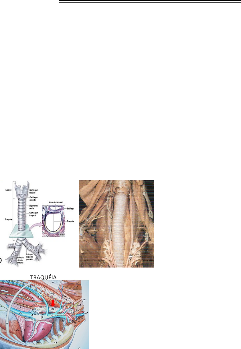 Sistema Respiratório II Traquéia: Medicina Veterinária – UNICSUL – 08/09 Função: · Transporte do ar para os pulmões. · Formada por anéis cartilaginosos (anéis traqueais) – completos e incompletos · Tubo íntegro e fechado para a passagem de ar · Tubo flexível e cartilaginoso que se estende desde a nasofaringe até o mediastino médio · Como conduz o ar, tem a capacidade de se expandir e os brônquios também. Possibilitando a expansão dos pulmões Termo de direção: · A laringe encontra-se cranialmente em relação a traqueia; A traqueia encontra-se caudalmente em relação à laringe. · A traquéia faz sintopia com a laringe (grudadas uma na outra). · Une a laringe aos brônquios. Localização: · Caudal a laringe · Adentra mediastino (mediastino médio é onde se localiza o coração) · Bifurcação terminal sobre o coração, originando dois brônquios . · A traqueia possui duas porções, de acordo onde fica localizada: · Porção cervical - pescoço · Porção torácica – cavidade torácica De cranial para caudal: · Laringe, traqueia, esôfago (ao lado, fazendo sintopia com a traqueia) · 22- músculo do diafragma · Delimita o termino da cavidade torácica e o início da cavidade pélvica. · Cavidade torácica, coração · Imagem de Radiografia · A traqueia fica preta por causa da passagem de ar. Traqueia das diferentes espécies: · A traquéia é formada por vários anéis traqueais, não são totalmente fechados dorsalmente aos animais. · Em preto = músculo traqueal. · Carnívoros= músculo traqueal dorsal aos anéis · Suíno, bovinos e equinos= músculo traqueal ventral aos anéis · Pulmões e traqueia (músculo traqueal) de um cão. Traqueia – AVES E RÉPTEIS: · Formada por anéis cartilaginosos completos (anéis traqueais). Sobre a Traqueia: · A traqueia divide-se em dois brônquios principais com a estrutura semelhante a traquéia. · Particularidade anatômica: em suínos e ruminantes – possuem o Brônquio traqueal (emergido cranialmente aos brônquios principais) – sai pelo lado direito do pulmão. Traqueia e Brônquios: Carina Traqueal: · Local de bifurcação da traqueia = carina traqueal Número de anéis: · O número de anéis e o comprimento do órgão é variado tanto em uma espécie quanto entre as espécies. Árvore Brônquica · A traqueia é o tronco da árvore. · Os brônquios maiores formam estruturas menores . Os brônquios apresentam estrutura semelhante à da traqueia, porém em cada divisão sucessiva as cartilagens de sustentação tornam-se menores e mais irregulares, enquanto que o músculo se expande de modo a envolver todos os lados. Os brônquios são divididos em: Brônquios principais – visto a olho nu · Bifurcação da traquéia – a Carina traqueal, originando os os brônquios direito e esquerdo. Brônquios menores ou brônquios lobares – visto a olho nu · Distribuídos nos lobos pulmonares · Dão origem aos Brônquios segmentares Bronquíolos – microscopicamente visíveis · Conduzem o ar até os alvéolos. Brônquios: · A partir da bifurcação da traqueia: · Brônquios principais direito e esquerdo. · Os brônquios principais possuem a mesma estrutura da traqueia. · Já nos brônquios menores os anéis são substituídos por placas cartilagíneas irregulares. Lobo acessório é visto com mais facilidade se virá-lo (é a parte “de trás” dos brônquios). Bronquíolos: Pulmões: · Órgãos parenquimatosos · “Fixam-se” à parede torácica e ao diafragma pela pleura · Os movimentos respiratórios dependem do diafragma e de músculos da parede torácica · A hematose = trocas gasosas entre o ar inspirado e o sangue do indivíduo, que ocorre nos alvéolos pulmonares, visto apenas microscopicamente. · O diafragma fica fixado nas paredes da cavidade torácica Pulmões e Pleura: Pleura= serosa que envolve os pulmões · Visceral – em contato/sintopia com as vísceras animais. · Parietal – em contato com a parede da cavidade torácico, mais externamente Topografia do PULMÃO: · Ápice: entrada do tórax · Base: cranial ao diafragma · Superfície costal: parede torácica lateral · Superfície medial: mediastino Pulmões: · Seu tamanho e formato obedecem as mudanças nas dimensões do tórax. · A coloração varia de vermelho intenso a rosa pálido, dependendo da quantidade de sangue Os animais de centros urbanos possuem pulmões mais acinzentados. O Pulmão das diferentes espécies: · Cão- mais arredondado · Felinos – o pulmão é um pouco mais esticado. · Lobo acessório: Discretamente deslocado para a direito do lobo medial direito · Há uma divisão no lobo cranial direito · Não possui lobo medial ao lado direito do pulmão – particularidade dos equinos Pulmão e suas características: Músculos que atuam na respiração: · Inspiração sem esforço: diafragma e músculos intercostais caudais. · Inspiração forçada: diafragma, músculos intercostais (todos), músculos escalenos, mm. Toraco-apendiculares e a musculatura relacionada às vertebras. · Expiração sem esforço: relaxamento da musculatura (exceção dos equinos). · Expiração forçada (dificuldade para respirar, ofegante): músculos abdominais e intercostais.