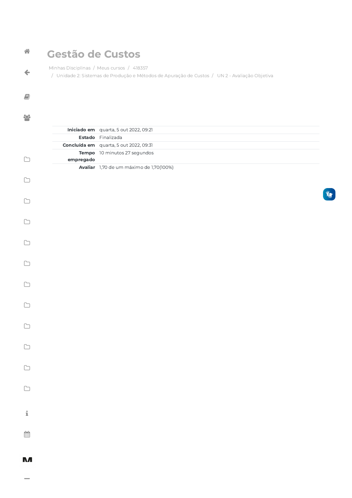 05/10/2022 09:31 UN 2 - Avaliação Objetiva: Revisão da tentativa https://avap.multivix.edu.br/mod/quiz/review.php?attempt=2045633&cmid=1259095 1/6 Minhas Disciplinas / Meus cursos / 418357 / Unidade 2: Sistemas de Produção e Métodos de Apuração de Custos / UN 2 - Avaliação Objetiva Gestão de Custos Iniciado em quarta, 5 out 2022, 09:21 Estado Finalizada Concluída em quarta, 5 out 2022, 09:31 Tempo empregado 10 minutos 27 segundos Avaliar 1,70 de um máximo de 1,70(100%)                     https://avap.multivix.edu.br/my/ https://avap.multivix.edu.br/course/view.php?id=19108 https://avap.multivix.edu.br/course/view.php?id=19108§ion=3 https://avap.multivix.edu.br/mod/quiz/view.php?id=1259095 https://avap.multivix.edu.br/my/ https://avap.multivix.edu.br/course/view.php?id=19108 https://avap.multivix.edu.br/user/index.php?id=19108 https://avap.multivix.edu.br/course/view.php?id=19108§ion=1 https://avap.multivix.edu.br/course/view.php?id=19108§ion=2 https://avap.multivix.edu.br/course/view.php?id=19108§ion=3 https://avap.multivix.edu.br/course/view.php?id=19108§ion=4 https://avap.multivix.edu.br/course/view.php?id=19108§ion=5 https://avap.multivix.edu.br/course/view.php?id=19108§ion=6 https://avap.multivix.edu.br/course/view.php?id=19108§ion=7 https://avap.multivix.edu.br/course/view.php?id=19108§ion=8 https://avap.multivix.edu.br/course/view.php?id=19108§ion=9 https://avap.multivix.edu.br/course/view.php?id=19108§ion=10 https://avap.multivix.edu.br/course/view.php?id=19108§ion=11 https://avap.multivix.edu.br/course/view.php?id=19108§ion=12 https://avap.multivix.edu.br/mod/page/view.php?id=1252%2F%22%20target%3D%22_blank https://avap.multivix.edu.br/calendar/view.php/ https://avap.multivix.edu.br/local/staticpage/view.php?page=biblioteca https://portalweb.multivix.edu.br/gabaritos/login.aspx https://avap.multivix.edu.br/ 05/10/2022 09:31 UN 2 - Avaliação Objetiva: Revisão da tentativa https://avap.multivix.edu.br/mod/quiz/review.php?attempt=2045633&cmid=1259095 2/6 Questão 1 Correto Atingiu 0,34 de 0,34 A empresa TZL fabrica e comercializa um único tipo de produto – bolachas do tipo ‘Cream Cracker’ – e está presente no mercado há cerca de quinze anos. Mensalmente, a empresa fabrica 500.000 unidades (pacotes com 200g) deste produto, e seus custos de produção, para cada dez mil unidades, são dados da seguinte forma: Materiais = R$ 4.300; Mão-de-obra direta: R$ 1.000; Custos indiretos = R$ 900; Outros custos �xos = R$ 850. Recentemente, a TZL recebeu uma proposta da empresa líder no mercado, no sentido de terceirizar a sua produção; na verdade, a empresa líder fabricaria o produto, e a repassaria para a TZL a R$ 0,67 por pacote, que revenderia sob sua marca. É preciso, no entanto, enfatizar que 25% dos custos �xos não são abolidos, mesmo com a produção terceirizada, e o custo de frete seria igual a R$ 0,04 por unidade. Desta forma, considerando o conteúdo exposto, analise as a�rmações a seguir. I – O custo unitário para produção própria é igual a R$ 0,705. II – A decisão pela compra junto a terceiros implica na manutenção dos custos �xos em um montante igual a R$ 0,064, que deverá ser repassado ao produto. III – O negócio não é interessante para a empresa TZL, pois o custo de aquisição junto à concorrência é igual a R$ 0,774. É correto o que se a�rma em Escolha uma opção: a. I, II e III. b. I e II, apenas. c. I, apenas.  d. III, apenas. e. II, apenas.                     https://avap.multivix.edu.br/my/ https://avap.multivix.edu.br/course/view.php?id=19108 https://avap.multivix.edu.br/user/index.php?id=19108 https://avap.multivix.edu.br/course/view.php?id=19108§ion=1 https://avap.multivix.edu.br/course/view.php?id=19108§ion=2 https://avap.multivix.edu.br/course/view.php?id=19108§ion=3 https://avap.multivix.edu.br/course/view.php?id=19108§ion=4 https://avap.multivix.edu.br/course/view.php?id=19108§ion=5 https://avap.multivix.edu.br/course/view.php?id=19108§ion=6 https://avap.multivix.edu.br/course/view.php?id=19108§ion=7 https://avap.multivix.edu.br/course/view.php?id=19108§ion=8 https://avap.multivix.edu.br/course/view.php?id=19108§ion=9 https://avap.multivix.edu.br/course/view.php?id=19108§ion=10 https://avap.multivix.edu.br/course/view.php?id=19108§ion=11 https://avap.multivix.edu.br/course/view.php?id=19108§ion=12 https://avap.multivix.edu.br/mod/page/view.php?id=1252%2F%22%20target%3D%22_blank https://avap.multivix.edu.br/calendar/view.php/ https://avap.multivix.edu.br/local/staticpage/view.php?page=biblioteca https://portalweb.multivix.edu.br/gabaritos/login.aspx https://avap.multivix.edu.br/ 05/10/2022 09:31 UN 2 - Avaliação Objetiva: Revisão da tentativa https://avap.multivix.edu.br/mod/quiz/review.php?attempt=2045633&cmid=1259095 3/6 Questão 2 Correto Atingiu 0,34 de 0,34 A empresa MQP realizou, para o mês de janeiro de 2018, um desembolso de R$ 18.000 com a cobertura de seus custos de produção. Sabe-se que os custos do material direto foram iguais a 35% do total, que devem ser somados a outros 25%, relativos à mão-de-obra; os gastos com materiais indiretos compõem o restante dos desembolsos. Estes gastos foram 15% superiores ao encontrado em 2017. Um dos objetivos estipulados pelos acionistas e pelos gestores �nanceiros, trata-se da expectativa de que esses gastos em 2019 sejam apenas de R$ 21.600, ou seja, 20% superiores aos gastos de 2018. Assim sendo, a partir do conteúdo exposto, e considerando seus conhecimentos sobre a temática proposta, assinale a opção correta. Escolha uma opção: Escolha uma opção: a. Os custos de produção em 2019 devem ser 38% superiores aos gastos obtidos em 2017.  b. O custo da mão de obra em 2019 será 2,63 vezes maior do que em 2017. c. O gasto com material indireto previsto para 2019 será inferior a R$ 9.900,00. d. Em 2017, os custos com mão-de-obra foram iguais a R$ 5.125,00. e. Os gastos com material direto realizados em 2017 