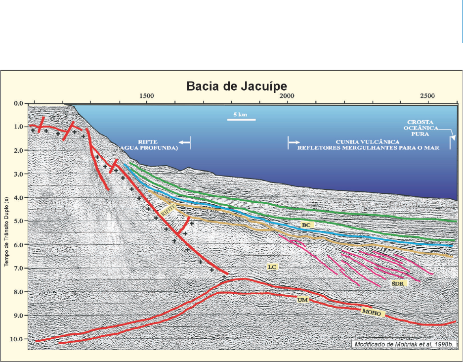 III. Bacias Sedimentares da Margem Continental Brasileira 143 Figura III.53 – Interpretação da seção sísmica na Bacia de Jacuípe, mostrando expressiva erosão afetando os blocos de rifte em águas profundas e ocorrência de refletores mergulhantes para o mar acima de expressivo refletor profundo Figure III.53 – Interpretation of the seismic section in the Jacuípe Basin, showing expressive erosion affecting the syn-rift blocks in the deep water region, and occurrence of seaward-dipping reflector wedges above an expressive deep seismic reflector Margem Leste, Sudeste e Sul (segmento divergente) Na Margem Leste e Sudeste destaca-se a ocorrência de evaporitos de idade aptiana, que formam grandes diápiros e muralhas de sal na região entre as bacias de Camamu e Santos. De uma maneira geral, a plataforma continental, assim como a área de ocorrência da megasseqüência sinrifte, é relativa- mente estreita na margem nordeste, mas alarga-se na direção sul, até a região das bacias de Campos e Santos. Ao adentrar- se a Bacia de Pelotas, ao sul do lineamento de Florianópolis, desaparecem os evaporitos aptianos, e a megasseqüência sinrifte é caracterizada por falhamentos antitéticos. A Fig. III.26 apresenta a sucessão de colunas estratigráficas simplificadas para as principais bacias da Margem Sudeste e Sul. Bacia de Camamu A Bacia de Camamu situa-se no litoral do Estado da Bahia, abrangendo a planície costeira, plataforma, talude e sopé continental, com cerca de 125 km de comprimento na direção N–S e 70 km de largura na direção E–W. Sua área total, até a cota batimétrica de 2.000 m, é de cerca de 9.000 km2, sendo 2.000 km2 em terra e 7.000 km2 no mar. A bacia limita-se ao sul com a bacia de Almada, pelo Alto de Itacaré, e ao norte com as bacias de Jacuípe e do Recôncavo, pelas zonas de transferência de Itapoã e da Barra, esta última com características de falha de transferência, com direção E–W (Netto et al. 1994). A bacia apresenta grande espessura sedimentar, que pode atingir 8.000 m nos depocentros (Gonçalves et al. 2000), podendo ser individualizadas quatro megasseqüências, correspondentes às fases pré-rifte, sinrifte, transicional e pós- rifte. A fase pré-rifte caracteriza-se por pequeno estiramento litosférico, gerando uma ampla sinéclise na qual se registram sedimentos marinhos da Formação Afligidos (Permiano), com uma seção basal areno-evaporítica e uma seção superior pelítica e sedimentos siliciclásticos das formações Aliança, Sergi e Itaípe (Jurássico Superior e Cretáceo Inferior). As formações Aliança e Sergi são compostas basicamente por arenitos fluviais, e a Formação Itaípe (Cretáceo Inferior) por folhelhos lacustres. A megasseqüência sinrifte caracteriza-se por intensos falhamentos normais e formação de um lago profundo, confinado e preenchido por uma espessa seqüência alúvio- flúvio-deltaica-lacustre, composta basicamente de folhelhos Parte I – Geologia144 e arenitos do Cretáceo Inferior, associados às formações Morro do Barro e Rio de Contas. As primeiras incursões marinhas na bacia, no Aptiano, resultaram numa megasseqüência transicional em golfos restritos onde se depositaram os evaporitos, carbonatos e siliciclásticos da Formação Taipus Mirim, que engloba o Membro Serinhaém (siliciclásticos) e o Membro Igrapiúna (evaporitos). A megasseqüência pós-rifte ou marinha é caracterizada por uma fase transgressiva e uma fase regressiva. Com o estabelecimento de um mar raso (Albiano), formou-se uma plataforma carbonática, com a deposição dos calcarenitos e calcilutitos da Formação Algodões. A partir do Cretáceo Superior, em mar aberto, depositaram-se os folhelhos de talude da Formação Urucutuca, cuja deposição se estende até o Recente. O contato basal da Formação Urucutuca se dá com os carbonatos da Formação Algodões por importante discordância regional de caráter erosivo (Netto et al. 1994). A partir do Oligoceno, registram-se fácies litorâneas e plataformais (arenitos da Formação Rio Doce e carbonatos de plataforma da Formação Caravelas), que na direção da bacia profunda transicionam para os pelitos da Formação Urucutuca. A Fig. III.54 apresenta uma seção geológica através da plataforma continental e atingindo a região do talude, sopé continental e bacia profunda. Próximo do limite distal da província de diápiros de sal caracteriza-se notável anomalia magnética, provavelmente relacionada à formação de crosta oceânica. Bacia de Almada A Bacia de Almada está localizada no litoral do Estado da Bahia, abrangendo parte da planície costeira e avançando através da plataforma, talude e sopé continentais. Possui cerca de 80 km de comprimento na direção N–S e aproximadamente 50 km de largura na direção E–W. Sua área total, considerando-se a cota batimétrica máxima de 2.000 m, é de 4.000 km2, com pequena ocorrência de sedimentos na parte terrestre. Limita-se ao norte com a Bacia de Camamu, pelo Alto de Itacaré, e ao sul com a Bacia de Jequitinhonha, pelo Alto de Olivença (Netto et al. 1994). Seu arcabouço estrutural consiste de um compartimento de embasamento raso, adjacente à costa, no bloco alto da falha de Aritaguá; um compartimento intermediário, no bloco baixo desta falha; e a região além da quebra do talude, onde a seção sedimentar pode atingir até 8.000 m de espessura (Netto et al. 1994). No sul da bacia, destaca-se uma expressiva escavação submarina, denominada cânion de Almada, que atravessa os compartimentos intermediário e de embasamento raso, na direção NW–SE, estendendo-se também pelo continente adentro. À semelhança da Bacia de Camamu, o arcabouço estratigráfico é formado por 4 megasseqüências, corres- pondentes às fases de incipiente afinamento crustal (pré- rifte), de ruptura (sinrifte), transicional e pós-rifte, caracterizada por subsidência térmica durante a fase de deriva cont