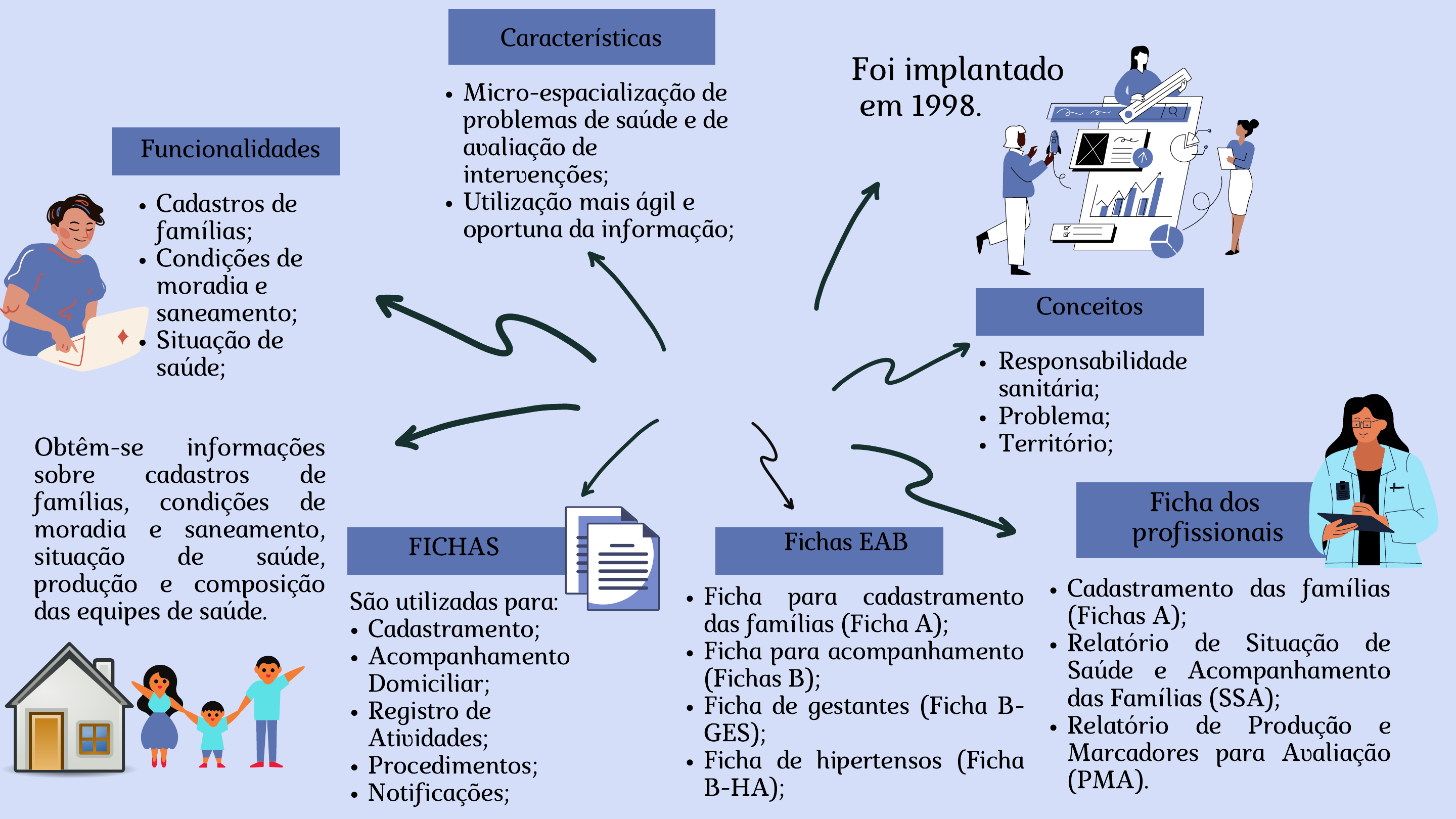 SIAB Responsabilidade sanitária; Problema; Território; Conceitos Ficha para cadastramento das famílias (Ficha A); Ficha para acompanhamento (Fichas B); Ficha de gestantes (Ficha B- GES); Ficha de hipertensos (Ficha B-HA); Fichas EAB Foi implantado em 1998. Cadastros de famílias; Condições de moradia e saneamento; Situação de saúde; Funcionalidades Micro-espacialização de problemas de saúde e de avaliação de intervenções; Utilização mais ágil e oportuna da informação; Características Obtêm-se informações sobre cadastros de famílias, condições de moradia e saneamento, situação de saúde, produção e composição das equipes de saúde. Cadastramento; Acompanhamento Domiciliar; Registro de Atividades; Procedimentos; Notificações; FICHAS São utilizadas para: Cadastramento das famílias (Fichas A); Relatório de Situação de Saúde e Acompanhamento das Famílias (SSA); Relatório de Produção e Marcadores para Avaliação (PMA). Ficha dos profissionais