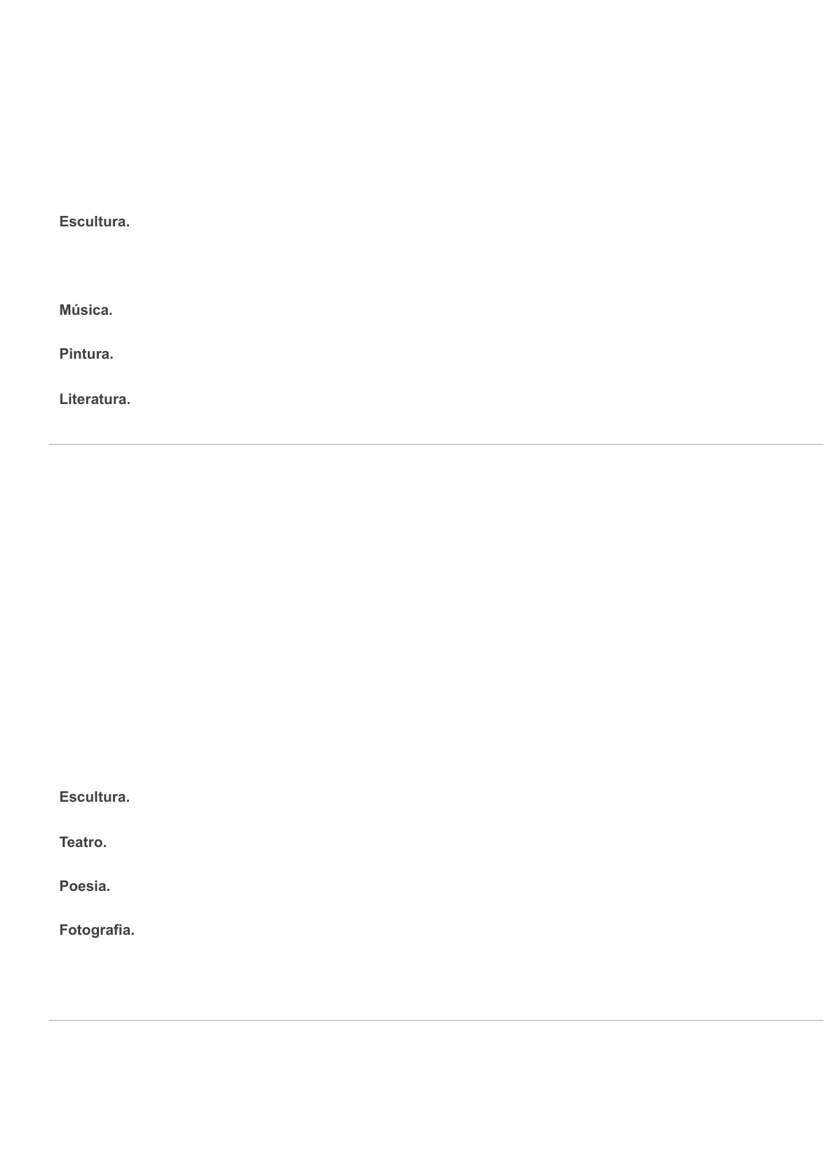 06/10/2022 19:57 Comentários https://sereduc.blackboard.com/ultra/courses/_113244_1/outline/assessment/_5849831_1/overview/attempt/_20462857_1/review/inline-feedback… 1/5 Ocultar opções de resposta Ocultar opções de resposta Essa forma de arte vem de uma palavra de origem grega e significa escrever com a luz, sendo que foto quer dizer luz e grafia exprime a noção de escrita. É uma arte que se utiliza de máquinas para captar imagens por meio de reações obtidas através da iluminação. De que tipo de arte estamos falando? Escultura. Resposta corretaFotografia. Música. Pintura. Literatura. Pergunta 2 1 / 1 É uma forma de arte que surgiu após a invenção da fotografia, como desdobramento dela. Utilizando várias imagens - fotografias - que são projetadas muito rapidamente em uma tela, nosso olho enxerga essa sequência de fotos como um filme, ou seja, com movimento. Falamos de? Escultura. Teatro. Poesia. Fotografia. Resposta corretaCinema. Pergunta 3 1 / 1 06/10/2022 19:58 Comentários https://sereduc.blackboard.com/ultra/courses/_113244_1/outline/assessment/_5849831_1/overview/attempt/_20462857_1/review/inline-feedback… 2/5 Ocultar opções de resposta Ocultar opções de resposta Conhecida como uma das formas de arte mais antigas de que se tem registro, pois já era realizada desde a Antiguidade Clássica. Além disso, é uma linguagem artística em que as pessoas, no caso os atores e atrizes, representam uma história para um público. De que forma de arte estamos falando?. Escultura. Literatura. Pintura. Poesia. Resposta corretaTeatro. Pergunta 4 1 / 1 Tipo de arte conhecida como a arte do movimento corporal. Usa o corpo como instrumento, as pessoas podem exteriorizar seus sentimentos fazendo gestos cadenciados por um ritmo. Estamos falando de qual linguagem artística? Fotografia. Cinema. Resposta corretaDança. Música. Teatro. Pergunta 5 1 / 1 06/10/2022 19:58 Comentários https://sereduc.blackboard.com/ultra/courses/_113244_1/outline/assessment/_5849831_1/overview/attempt/_20462857_1/review/inline-feedback… 3/5 Ocultar opções de resposta Ocultar opções de resposta A __________ é a linguagem subjetiva, carregada de emoção e sentimento, com ritmo, melodia constante, beleza e tão indefinível quando o mundo interior do poeta, objetivando a um efeito estético. Qual alternativa preenche corretamente o espaço? Literatura. Filosofia. Arte. Cultura. Resposta corretaPoesia. Pergunta 6 1 / 1 Forma de arte que se caracterizava no período da Pré-História, como desenhos nas paredes? Sabe-se que até hoje, os pesquisadores e historiadores tentam entender quais foram as intenções que levaram os seres humanos a produzi- las. Resposta corretaArte rupestre. Arte românica. Arte arcaica. Arte egípcia. Arte romana. Pergunta 7 1 / 1 06/10/2022 19:58 Comentários https://sereduc.blackboard.com/ultra/courses/_113244_1/outline/assessment/_5849831_1/overview/attempt/_20462857_1/review/inline-feedback… 4/5 Ocultar opções de resposta Ocultar opções de resposta Mostrar uma obra de arte, discutir suas características e pedir que cada aluno faça o mesmo desenho no caderno não é propor uma releitura. Isso é uma simples reprodução ou cópia de materiais. Na releitura, parte-se de uma obra para criar outro trabalho (ou seja, o estudante transforma e interpreta). De que mito pedagógico sobre o ensino de arte estamos falando? A Arte estimula a criatividade. As grandes linguagens artísticas são apenas quatro. Só se reproduz trabalhos artísticos com material. Resposta corretaReprodução e releitura. A arte só é produzida por artistas. Pergunta 8 1 / 1 Conforme nosso material de estudos, essa forma de arte é a técnica de depositar pigmentos coloridos – que podem ser pastosos, líquidos ou em pó – sobre uma superfície, gerando imagens figurativas ou abstratas. Falamos da: Fotografia. HQ. Escultura Cinema. Resposta corretaPintura. Pergunta 9 1 / 1 06/10/2022 19:58 Comentários https://sereduc.blackboard.com/ultra/courses/_113244_1/outline/assessment/_5849831_1/overview/attempt/_20462857_1/review/inline-feedback… 5/5 Ocultar opções de resposta Ocultar opções de resposta Essa forma de arte se diferencia das outras na forma como é organizada. Basicamente, é formada por programas nos quais as pessoas interagem com objetos virtualmente, tendo que ultrapassar desafios, cumprindo metas e se divertindo. De que forma de arte falamos? Cinema. Resposta corretaJogos eletrônicos. Música. Teatro. Fotografia. Pergunta 10 1 / 1 Segundo o texto, “na arte contemporânea, as ________________ podem se reunir em obras que também utilizam a linguagem verbal. Isso ocorre porque a arte pode ser considerada como um elemento humano e ao mesmo tempo vivo, que recria a realidade inspirada nos anseios e sentimentos individuais dos seres humanos.” Qual alternativa preenche corretamente o espaço? Técnicas artísticas. Linguagens artísticas. Artes. Resposta corretaLinguagens visuais. Formas de arte.