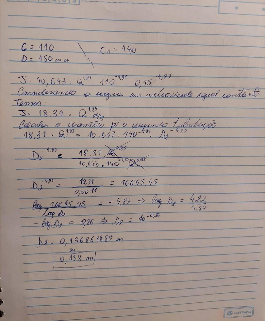 Vale 10 Atividade 1 Considere que sua empresa foi qualificada para substituir uma outra equipe e trabalhar numa instalação que irá captar água numa represa e trazê-la, por gravidade, até uma estação geradora para acionar uma turbina e, assim, gerar eletricidade, conforme o esquema a seguir: Fonte: Elaborada pelo autor. No cálculo realizado pela empresa anterior, uma tubulação de aço rebitado novo, com C = 110, estava já dimensionada, com diâmetro de 150 mm, quando foi constatada a inexistência daquele material na região. A tubulação que substituirá aquela já calculada tem C = 140. Sua empresa deverá reavaliar o mesmo dimensionamento e estabelecer o novo diâmetro que terá a nova tubulação para atender as mesmas exigências hidráulicas da anterior. Resposta: