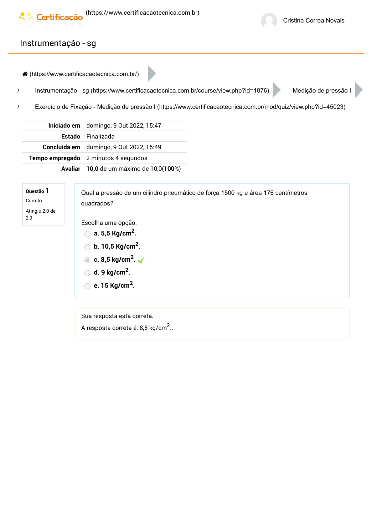 (https://www.certificacaotecnica.com.br) Cristina Correa Novais Instrumentação - sg Questão 1 Correto Atingiu 2,0 de 2,0 / / / Iniciado em domingo, 9 Out 2022, 15:47 Estado Finalizada Concluída em domingo, 9 Out 2022, 15:49 Tempo empregado 2 minutos 4 segundos Avaliar 10,0 de um máximo de 10,0(100%) Qual a pressão de um cilindro pneumático de força 1500 kg e área 176 centímetros quadrados? Escolha uma opção: a. 5,5 Kg/cm . b. 10,5 Kg/cm . c. 8,5 kg/cm . d. 9 kg/cm . e. 15 Kg/cm . Sua resposta está correta. A resposta correta é: 8,5 kg/cm .. (https://www.certificacaotecnica.com.br/) Instrumentação - sg (https://www.certificacaotecnica.com.br/course/view.php?id=1876) Medição de pressão I Exercício de Fixação - Medição de pressão I (https://www.certificacaotecnica.com.br/mod/quiz/view.php?id=45023) 2 2 2 2 2 2 https://www.certificacaotecnica.com.br/ https://www.certificacaotecnica.com.br/ https://www.certificacaotecnica.com.br/course/view.php?id=1876 https://www.certificacaotecnica.com.br/mod/quiz/view.php?id=45023 Questão 2 Correto Atingiu 2,0 de 2,0 Questão 3 Correto Atingiu 2,0 de 2,0 O manômetro da figura abaixo é denominado: Escolha uma opção: a. Manômetro de membrana. b. Manômetro de tubo de bourdon. c. Manômetro eletrônico. d. Manômetro U. e. Manômetro de fole. Sua resposta está correta. A resposta correta é: Manômetro de tubo de bourdon.. A pressão medida nos manômetros é denominada: Escolha uma opção: a. Atmosférica. b. Manométrica. c. Diferencial. d. Absoluta. e. Vácuo. Sua resposta está correta. A resposta correta é: Manométrica.. (http://publica.sagah.com.br/publicador/objects/layout/2083312043/2019- 08-04-21-04-49-5A.jpg?v=416078457) http://publica.sagah.com.br/publicador/objects/layout/2083312043/2019-08-04-21-04-49-5A.jpg?v=416078457 Questão 4 Correto Atingiu 2,0 de 2,0 Questão 5 Correto Atingiu 2,0 de 2,0 O manômetro da figura abaixo mede baixas pressões e é denominado: Escolha uma opção: a. Manômetro de cápsula. b. Manômetro tubo U c. Manômetro de tubo de bourdon. d. Nenhuma das respostas acima. e. Manômetro de fole. Sua resposta está correta. A resposta correta é: Manômetro tubo U. Sendo F= P X A, a força é o produto da pressão pela área. Para um cilindro hidráulico de área 78,5 centímetros quadrados, em uma pressão de 150 Kg por centímetro quadrado, qual é a força que o mesmo desenvolve? Escolha uma opção: a. 17500 Kg. b. 117 kg. c. 11775 Kg. d. 1177 Kg. e. 1775 Kg. Sua resposta está correta. A resposta correta é: 11775 Kg.. (http://publica.sagah.com.br/publicador/objects/layout/945492207/2019- 08-04-21-04-49-4.jpg?v=709734775) http://publica.sagah.com.br/publicador/objects/layout/945492207/2019-08-04-21-04-49-4.jpg?v=709734775