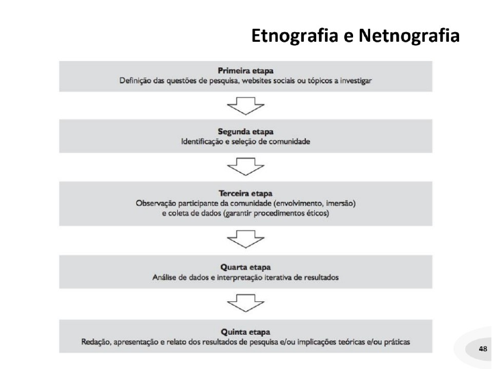 FICHAMENTO DO TEXTO KOZINETS, Robert. Netnografia: Realizando Pesquisa Etnográfica Online. Penso, 2014. Capitulo 4: Método da Netnografia · Etnografia - é um conjunto de metodologias que compartilham da suposição de que o engajamento pessoal com o sujeito é fundamental para compreender uma determinada cultura ou ambiente social. · Netnografia - é pesquisa observacional participante baseada em trabalho de campo online, usando comunicações mediadas por computador como fonte de dados para chegar à compreensão e a representação etnográfica de um fenômeno cultural ou comunal. Retirado da internet. No livro se encontra na p. 63. DIFERENCIANDO A PESQUISA DE COMUNIDADES ONLINE DA PESQUISA ONLINE EM COMUNIDADES Pesquisa de “comunidades online” · Estuda alguns fenômenos diretamente relacionados às comunidades eletrônicas e a cultura online em si, uma determinada manifestação delas, ou um de seus elementos. · Um estudo de um determinado grupo de notícias, de um determinado mundo virtual, de um tipo de comportamento em um website de rede social, de um padrão linguístico em um microblog, de um determinado tipo de padrão de vinculação em blogs. · Comunidades online, identidade online, padrões sociolinguístico online, cibercultura(s), relacionamentos que emergem por meio de CMC e vários outros elementos interativos sociais humanos online serão construtos centrais essenciais que a pesquisa tenta explicar. Pesquisa “online em comunidades” · Examinam algum fenômeno social geral cuja existência social vai muito além da internet e das interações online, ainda que essas interações possam desempenhar um papel importante com a afiliação ao grupo. · Tomam um determinado fenômeno social ou comunal como sua área focal de interesse e depois estendem isso, argumentando ou presumindo que, por meio do estudo da comunidade online, algo significativo pode ser aprendido sobre a comunidade ou cultura focal mais ampla, e depois generalizado para o todo. MESCLANDO ETNOGRAFIA E NETNOGRAFIA · Integração versus Separação de Mundos Sociais. Quão intimamente relacionados são os comportamentos online e os de situações face a face? Existe uma relação direta, ou eles são comportamentos diferentes, separados? · Observação versus Verbalização de Dados Relevantes. Quão importante é a repetida observação de comportamentos fisicamente manifestos em vez de verbalmente articulados? É provável que exista nova informação útil que será comunicada ou não online? Existem ricas representações virtuais do comportamento, talvez incluindo fotografias ou registros audiovisuais? · Identificação versus Desempenho dos Membros. Quão importante é a identificação adicional do membro individual da cultura, isto é, sua ligação com características como idade, raça, gênero e assim por diante? Ou são os desempenhos das ações capturadas e registradas na comunidade ou cultura online totalmente suficientes para a geração de teoria? Retirado da internet. No livro de encontra na p. 68 O CONTEXTO DO CAMPO DE TRABALHO MEDIADO POR COMPUTADOR · Alteração: significa simplesmente que a natureza da interação está alterada – tanto coagida quanto liberada – pela natureza e por regras especificas do meio tectonológico em que ela é realizada. · Quando uma pessoa está conectada, principalmente durante suas primeiras experiências online, aspectos técnicos do meio comunicativo criam uma experiência cultural nitidamente nova e, a princípio, importuna. · A interação online força o aprendizado de novos códigos e normas, abreviaturas, emoticons, sequências de teclas e outras habilidades técnicas para transferir informação emocional vital às relações sociais. · Depois de um certo tempo, contudo, as convenções linguísticas e técnicas começam a parecer uma segunda natureza, como as linguagens aculturadas tendem a fazer. · Anonimato: diferença amplamente analisada, particularmente relevante nos primeiros anos de interação online, mas ainda significativa hoje. · A autoapresentação tem graus de liberdade muito mais amplos, e a vida social online oferece muito mais oportunidades para experimentação de identidade. · Pode confundir e perturbar pesquisadores que pretendem fixar algum dado demográfico sobre produções textuais, ou de outro tipo, publicadas online. · O anonimato e o pseudoanonimato (o uso de pseudônimos em vez de nomes), torna a abordagem netnográfica necessariamente diferente da abordagem da etnografia face a face. · Acessibilidade: a ampla acessibilidade de muitos fóruns eletrônicos à participação de qualquer pessoa. · A ética participativa igualitária da internet, originou-se de seu contato com comunidades acadêmicas e de hackers cujo etos era “a informação deve ser gratuita”. · A acessibilidade mundial acarreta a potencial afiliação em massa, mas outros fatores acarretam fragmentação, como as diferenças linguísticas. · Arquivamento: registro automático das conversações e dos dados facilitado pelo meio online. · Mecanismos de busca eficientes tornam acessível toda interação ou toda postagem em um dado tópico em um grupo de discussão específico, ou toda postagem por um determinado indivíduo em qualquer grupo de discussão. · As técnicas de análise de conteúdo estão usufruindo um renascimento em sua aplicação à análise de conversas online.