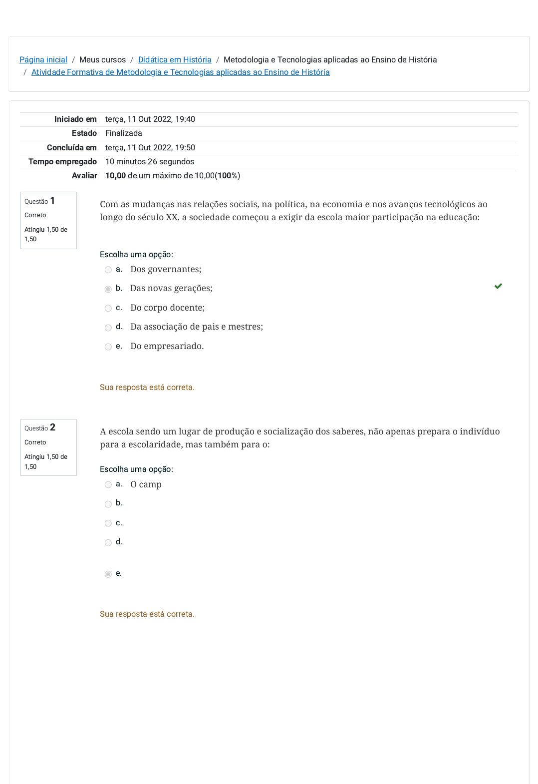 Questão 1 Correto Atingiu 1,50 de 1,50 Questão 2 Correto Atingiu 1,50 de 1,50 Iniciado em terça, 11 Out 2022, 19:40 Estado Finalizada Concluída em terça, 11 Out 2022, 19:50 Tempo empregado 10 minutos 26 segundos Avaliar 10,00 de um máximo de 10,00(100%) Página inicial / Meus cursos / Didática em História / Metodologia e Tecnologias aplicadas ao Ensino de História / Atividade Formativa de Metodologia e Tecnologias aplicadas ao Ensino de História Com as mudanças nas relações sociais, na política, na economia e nos avanços tecnológicos ao longo do século XX, a sociedade começou a exigir da escola maior participação na educação: Escolha uma opção: a. Dos governantes; b. Das novas gerações; c. Do corpo docente; d. Da associação de pais e mestres; e. Do empresariado. Sua resposta está correta. A escola sendo um lugar de produção e socialização dos saberes, não apenas prepara o indivíduo para a escolaridade, mas também para o: Escolha uma opção: a. O campo acadêmico; b. O campo prático; c. O campo teológico; d. O campo estético; e. O campo do trabalho. Sua resposta está correta. https://ead.fce.edu.br/ https://ead.fce.edu.br/course/view.php?id=290 https://ead.fce.edu.br/mod/quiz/view.php?id=2659 Questão 3 Correto Atingiu 2,00 de 2,00 Questão 4 Correto Atingiu 2,50 de 2,50 Questão 5 Correto Atingiu 2,50 de 2,50 A escola deve ensinar o aluno a produzir o conhecimento que de acordo com os teóricos da Escola Nova, se dá com a: Escolha uma opção: a. Prática de pesquisa; b. Prática social; c. Prática empresarial; d. Prática comunitária; e. Prática sociológica. Sua resposta está correta. Com o avanço das tecnologias de informação e comunicação na sociedade, no ambiente escolar muito se discute sobre as diferentes formas de utilização no: Escolha uma opção: a. Processo de informação; b. Processo tecnológico digital; c. Processo de ensino aprendizagem; d. Processo político pedagógico; e. Processo institucional. Sua resposta está correta. As mudanças políticas, econômicas e sociais ocorridas no final do século XX despertaram para a necessidade de um repensar no que se ensina nos (nas): Escolha uma opção: a. Bancos universitários; b. Bancos individuais; c. Empresas e escolas; d. Comunidades científicas; e. Gestão acadêmica. Sua resposta está correta. ◄ Artigo Indicado pelo Guia de Estudo Seguir para... Apostila de Memória, Cultura e Realidade Histórica ► https://ead.fce.edu.br/mod/resource/view.php?id=3892&forceview=1 https://ead.fce.edu.br/mod/resource/view.php?id=2660&forceview=1