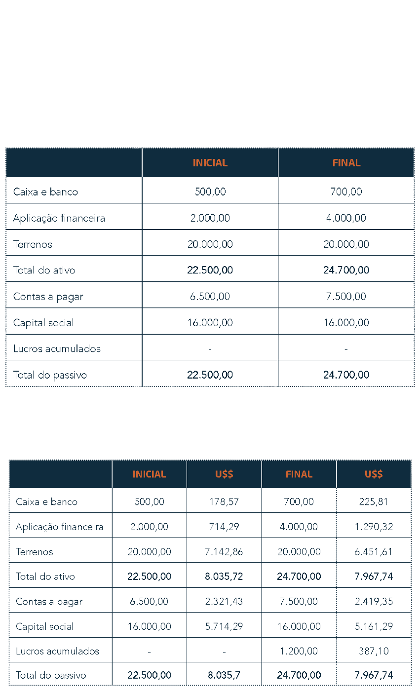 Considerando a correção monetária de balanço, apresente a aplicação da taxa de conversão da moeda sobre os valores iniciais e finais das respectivas contas apresentadas no demonstrativo contábil pelo método indireto.