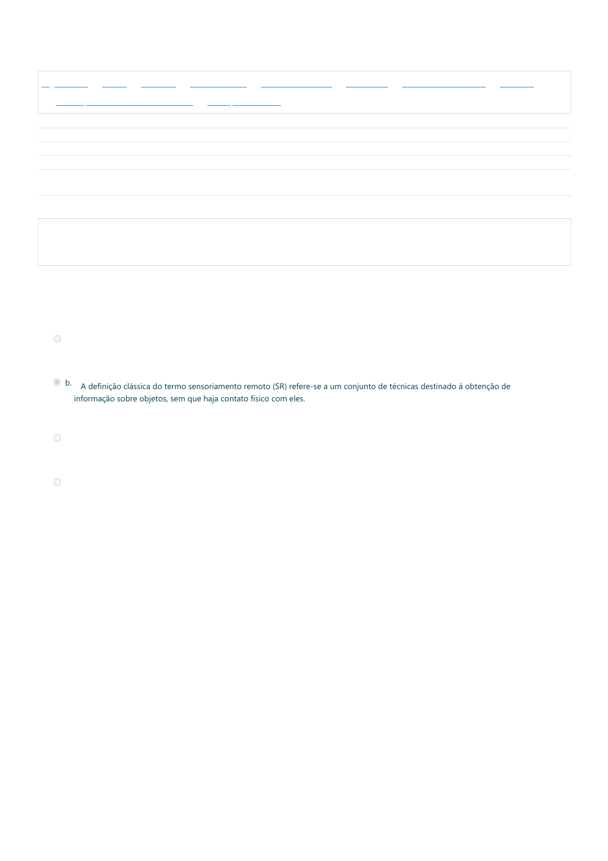 14/10/2022 09:31 Avaliação conectada: Revisão da tentativa https://etp.se.df.gov.br/ead1/mod/quiz/review.php?attempt=169761&cmid=22852 1/6 Página inicial / Cursos / EaD - ETP / Cursos Técnicos / Controle Ambiental / 2/2022 TCA / SEMESTRE 2- TCA 3A/B / ISR-TCA3 / Introdução ao Sensoriamento Remoto / Avaliação conectada Iniciado em Friday, 14 Oct 2022, 09:25 Estado Finalizada Concluída em Friday, 14 Oct 2022, 09:31 Tempo empregado 5 minutos 36 segundos Avaliar 30,00 de um máximo de 30,00(100%) Questão 1 Correto Atingiu 3,00 de 3,00 Marque a alternativa correta sobre o conceito de sensoriamento remoto. a. Nenhuma das alternativas b. A definição clássica do termo sensoriamento remoto (SR) refere-se a um conjunto de técnicas destinado à obtenção de informação sobre objetos, sem que haja contato físico com eles. c. A definição de sensoriamento remoto é Sistema de Informação Geográfico d. A definição clássica do termo sensoriamento remoto ( RS) refere-se a um conjunto de atividades destinadas ao processamento de informações por meio de softwares Sua resposta está correta. A resposta correta é: A definição clássica do termo sensoriamento remoto (SR) refere-se a um conjunto de técnicas destinado à obtenção de informação sobre objetos, sem que haja contato físico com eles. https://etp.se.df.gov.br/ead1/ https://etp.se.df.gov.br/ead1/course/index.php https://etp.se.df.gov.br/ead1/course/index.php?categoryid=1 https://etp.se.df.gov.br/ead1/course/index.php?categoryid=2 https://etp.se.df.gov.br/ead1/course/index.php?categoryid=39 https://etp.se.df.gov.br/ead1/course/index.php?categoryid=100 https://etp.se.df.gov.br/ead1/course/index.php?categoryid=103 https://etp.se.df.gov.br/ead1/course/view.php?id=648 https://etp.se.df.gov.br/ead1/course/view.php?id=648#section-0 https://etp.se.df.gov.br/ead1/mod/quiz/view.php?id=22852 Márcio Moura Realce 14/10/2022 09:31 Avaliação conectada: Revisão da tentativa https://etp.se.df.gov.br/ead1/mod/quiz/review.php?attempt=169761&cmid=22852 2/6 Questão 2 Correto Atingiu 3,00 de 3,00 Questão 3 Correto Atingiu 3,00 de 3,00 Marque a alternativa que apresenta os quatro elementos fundamentais das técnicas de SR, a. Fonte, sensor, radiação e radiômetro b. Fonte, alvo, sensor e radiação eletromagnética c. Fonte, alvo, GPS e radiação eletromagnética d. Fonte, alvo, Sensor e sol Sua resposta está correta. A resposta correta é: Fonte, alvo, sensor e radiação eletromagnética Os três princípios físicos do sensoriamento remoto que são essenciais para seu funcionamento são: a. Sensores ativos, objeto de estudo, e sensor b. Sensores passivos, sensores ativos, e radar c. Onda, infravermelho e radiação eletromagnética d. Objeto de estudo, Radiação Eletromagnética e um Sensor. Sua resposta está correta. A resposta correta é: Objeto de estudo, Radiação Eletromagnética e um Sensor. Márcio Moura Realce Márcio Moura Realce 14/10/2022 09:31 Avaliação conectada: Revisão da tentativa https://etp.se.df.gov.br/ead1/mod/quiz/review.php?attempt=169761&cmid=22852 3/6 Questão 4 Correto Atingiu 3,00 de 3,00 Questão 5 Correto Atingiu 3,00 de 3,00 Sobre SIG marque verdadeiro ou falso ( ) é um conjunto de sistemas de softwares e hardwares capazes de produzir, armazenar, processar, analisar e representar inúmeras informações sobre o espaço geográfico ( ) O SIG é uma ferramenta que vem sendo utilizada cada vez menos pelos órgãos públicos ( ) Exemplos de SIG são: Geoprocessamento, Sensoriamento Remoto e o GPS. Cada uma dessas três ferramentas tem uma função específica. ( ) SIG (sistema de inteligência geográfica) é um conjunto de Softwares hardwares, somente utilizado por órgão governamentais. a. F,V, V,V b. V,F,V,F c. V,F,F,V d. F,F,V,F Sua resposta está correta. A resposta correta é: V,F,V,F Programa CBERS nasceu de uma parceria inédita entre _______ e ________ no setor técnico-científico espacial a. Brasil e China b. EUA, Rússia c. EUA e China d. Brasil e Japão Sua resposta está correta. A resposta correta é: Brasil e China Márcio Moura Realce Márcio Moura Realce 14/10/2022 09:31 Avaliação conectada: Revisão da tentativa https://etp.se.df.gov.br/ead1/mod/quiz/review.php?attempt=169761&cmid=22852 4/6 Questão 6 Correto Atingiu 3,00 de 3,00 Questão 7 Correto Atingiu 3,00 de 3,00 Marque verdadeiro ou falso ( ) As técnicas de interpretação visual de imagens de satélite ou de fotointerpretação fazem parte do sistema de análise de dados em sensoriamento remoto ( ) Essa análise pode ser desenvolvida por diferentes técnicas, entre as quais, a fotointerpretação a e fotogrametria ( ) primeira é a identificação e a determinação de objetos por meio de fotografias, produzindo informações quantitativas ( ) Já a fotogrametria obtém medidas precisas de objetos, extraindo das fotografias informações geométricas e quantitativas. a. V,F,V,F b. F,V,V,F c. V,V,F,V d. F,F,V,F Sua resposta está correta. A resposta correta é: V,V,F,V A interpretação visual exige treinamento. Por isso, transpor passo a passo cada uma das etapas leva o usuário a se familiarizar com os critérios de observação e diminuir o caráter subjetivo da interpretação. EXCETO a. identificação b. elaboração c. determinação d. interpretação Sua resposta está correta. A resposta correta é: elaboração Márcio Moura Realce Márcio Moura Realce 14/10/2022 09:31 Avaliação conectada: Revisão da tentativa https://etp.se.df.gov.br/ead1/mod/quiz/review.php?attempt=169761&cmid=22852 5/6 Questão 8 Correto Atingiu 3,00 de 3,00 Questão 9 Correto Atingiu 3,00 de 3,00 As imagens de sensoriamento remoto permitem não só a simples detecção da vegetação, mas também a estimativa de propriedades e aspectos _______ da vegetação e que são relevantes em diversos __________, por exemplo: Altura da vegetação; Vigor vegetativo; Estágio sucessional; Estresse hídrico e de nutrientes; Biomassa e conteú