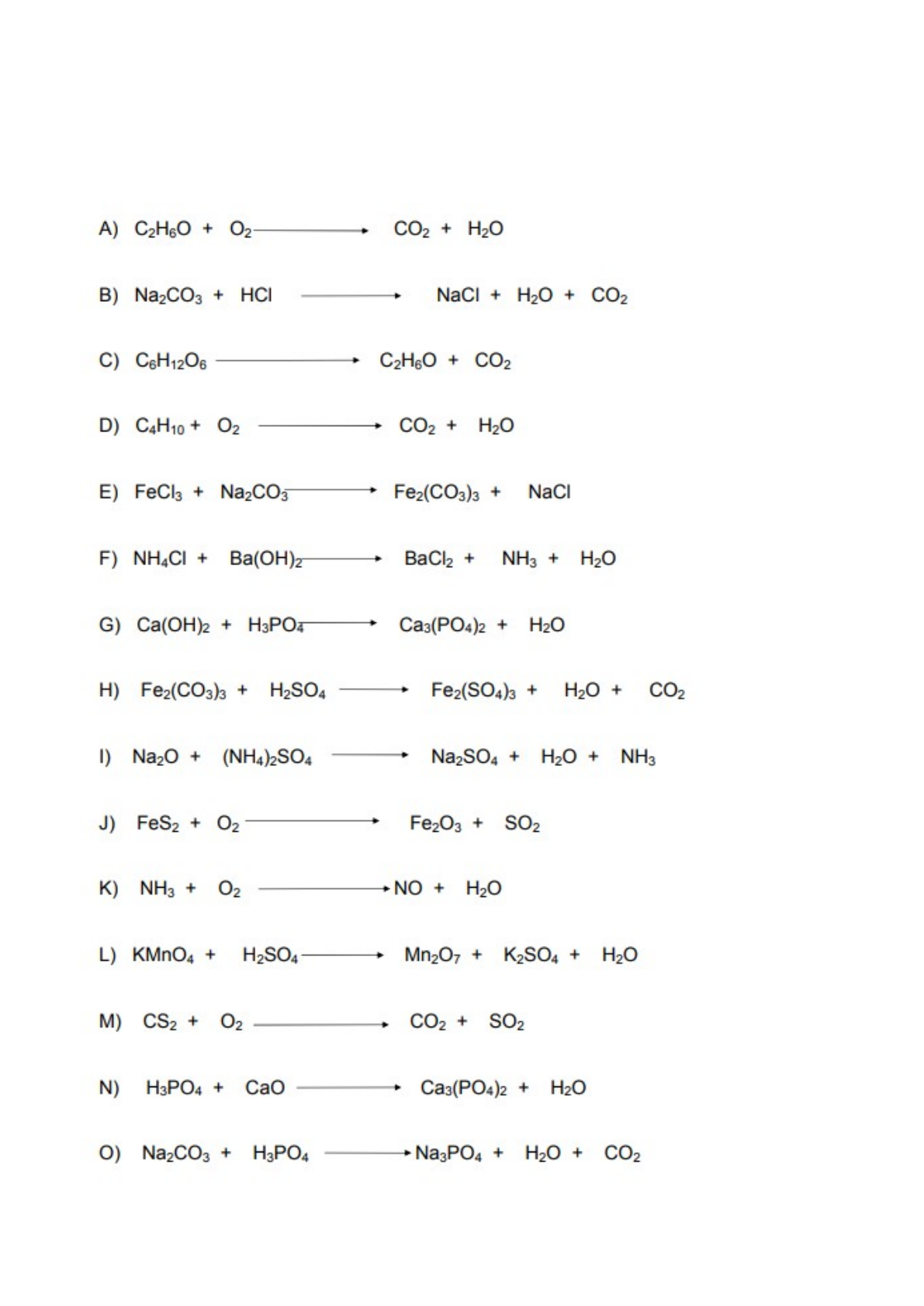 1. Ag2O → Ag + O2 2. Al + O2 → Al2O3 3. Al(OH)3 + H4SiO4 → Al4(SiO4)3 + H2O 4. BaCl2 + H2SO4 → HCl + BaSO4 5. BaO + As2O5 → Ba3(AsO4)2 6. C2H4 + O2 → CO2 + H2O 7. C3H2 + O2 → CO2 + H2O 8. Ca3(PO4)2 + SiO2 + C → CaSiO3 + CO + P4 9. CaO + P2O5 → Ca3(PO4)2 10. CH4 + O2 →CO2 + H2O 11. Cr + O2 → Cr2O3 12. Cu + O2 → CuO 13. Cu(OH)2 + H4P2O7 → Cu2P2O7 + H2O 14. Fe + H2O → Fe3O4 + H2 15. Fe3O4 + CO → Fe + CO2 16. FeS2 + O2 → Fe2O3 + SO2 17. H2 + Cl2 → HCl 18. H3PO3 → H2O + P2O3 19. HCl + Na3AsO3 →NaCl + H3AsO3 20. HNO2 → H2O + NO2 + NO 21. I2 + NaOH → NaI + NaIO3 + H2O 22. K2Cr2O7 + KOH → K2CrO4 + H2O 23. KClO2 → KCl + O2 24. KClO3 → KCl + O2 25. KClO4 → KCl + O2 26. KNO3 → KNO2 + O2 27. Mn3O4 + Al → Mn + Al2O3 28. N2O4 → NO2 29. N2O5 → NO2 + O2 30. NH3 + HCl → NH4Cl 31. NH4NO2 → N2 + H2O 32. NH4NO3 → N2O + H2O 33. P + O2 → P2O3 34. P + O2 → P2O5 35. P4 + O2 → P2O5 36. PBr5 + H2O → H3PO4 + HBr 37. PCl3 + H2O → H3PO3 + HCl 38. SO3 + NaOH → Na2SO4 + H2O Slide 1 Slide 2