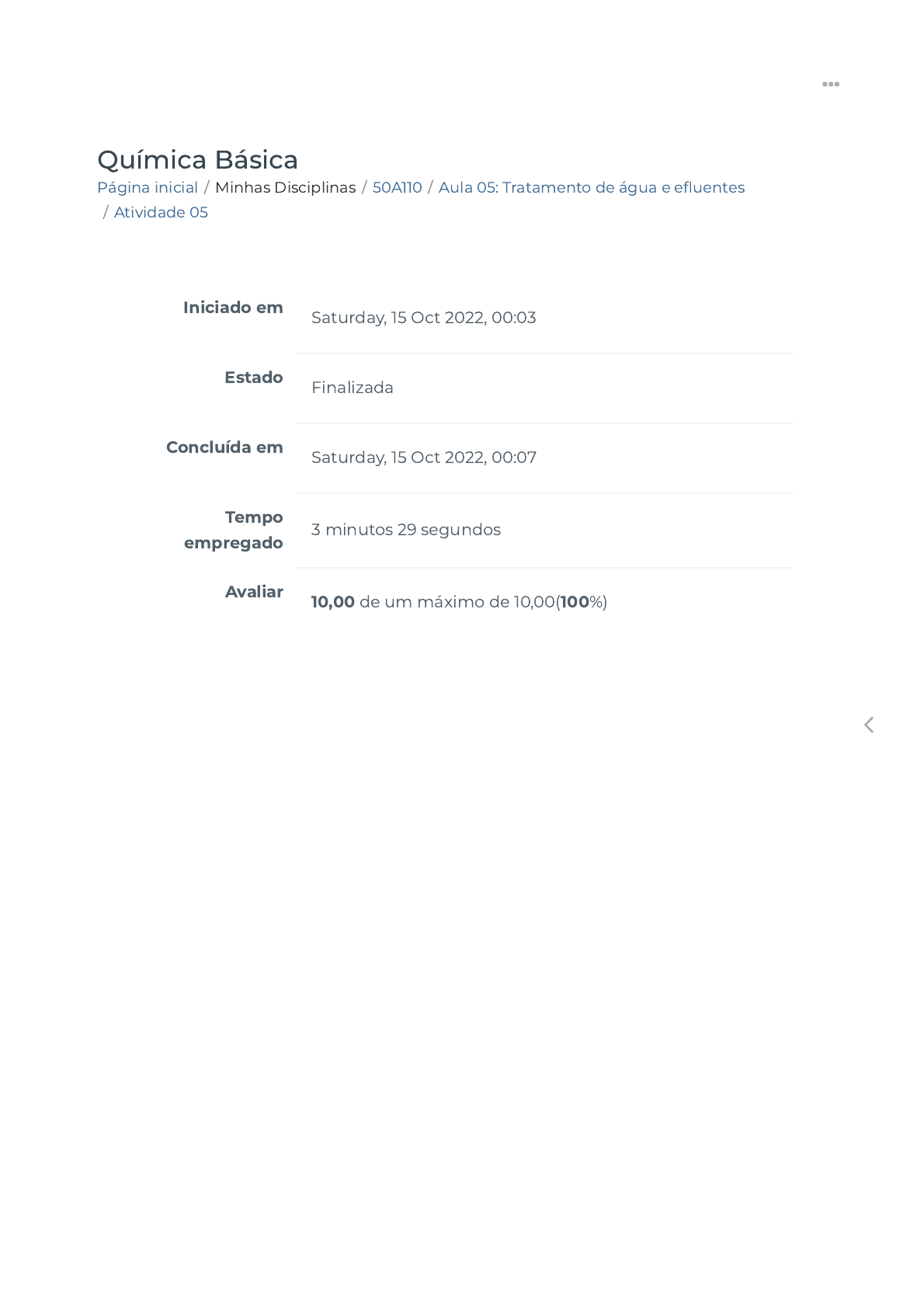 15/10/2022 00:07 Atividade 05 https://ava.politecnicabr.com.br/mod/quiz/review.php?attempt=3764859 1/6 Página inicial / Minhas Disciplinas / 50A110 / Aula 05: Tratamento de água e e�uentes / Atividade 05 Química Básica Iniciado em Saturday, 15 Oct 2022, 00:03 Estado Finalizada Concluída em Saturday, 15 Oct 2022, 00:07 Tempo empregado 3 minutos 29 segundos Avaliar 10,00 de um máximo de 10,00(100%) https://ava.politecnicabr.com.br/ https://ava.politecnicabr.com.br/course/view.php?id=1086 https://ava.politecnicabr.com.br/course/view.php?id=1086#section-7 https://ava.politecnicabr.com.br/mod/quiz/view.php?id=26274 https://ava.politecnicabr.com.br/ 15/10/2022 00:07 Atividade 05 https://ava.politecnicabr.com.br/mod/quiz/review.php?attempt=3764859 2/6 Questão 1 Correto Atingiu 3,00 de 3,00 O tratamento convencional é subdividido nas seguintes etapas: Escolha uma opção: a. Coagulação, Decantação, Filtração e Fluoretação. b. Aeração, Floculação, Decantação, Filtração eDesinfecção. c. Floculação, Decantação, Desinfecção e Fluoretação. d. Coagulação, Floculação, Decantação, Filtração, Desinfecção e Fluoretação. https://ava.politecnicabr.com.br/ 15/10/2022 00:07 Atividade 05 https://ava.politecnicabr.com.br/mod/quiz/review.php?attempt=3764859 3/6 Questão 2 Correto Atingiu 3,00 de 3,00 Com relação aos parâmetros químicos referente ao tratamento da água, marque a opção incorreta: Escolha uma opção: a. A alcalinidade in�ui no processo de coagulação, pois o sulfato de alumínio utilizado como agente coagulante reage com estes compostos originando o hidróxido de alumínio. b. águas super�ciais di�cilmente contêm cátions. Contudo, o mesmo é adicionado à água tratada, em concentrações de 0,9 a 5,9 mg/l, por medida de saúde pública, para auxiliar na prevenção da cárie dentária. c. A dureza normalmente é devida à presença dos cátions Ca , Mg , sob a forma de bicarbonatos e carbonatos. +2 +2 d. O oxigênio presente na água provém, principalmente, da atmosfera e da fotossíntese. https://ava.politecnicabr.com.br/ 15/10/2022 00:07 Atividade 05 https://ava.politecnicabr.com.br/mod/quiz/review.php?attempt=3764859 4/6 Questão 3 Correto Atingiu 2,00 de 2,00 Marque a alternativa correta referente ao tratamento de esgoto: Escolha uma opção: a. Troca de gás, gradeamento, sedimentação, �otação, �ltração, desinfecção, e oxidação biológica. b. Troca de gás, gradeamento, sedimentação, coagulação química, �ltração e oxidação biológica. c. Troca de gás, gradeamento, sedimentação, �otação, coagulação química, �ltração, desinfecção, e oxidação biológica. d. Troca de gás, �otação, coagulação química, �ltração, desinfecção, e oxidação biológica. https://ava.politecnicabr.com.br/ 15/10/2022 00:07 Atividade 05 https://ava.politecnicabr.com.br/mod/quiz/review.php?attempt=3764859 5/6 Questão 4 Correto Atingiu 2,00 de 2,00 No tratamento físico-químico há a remoção de sólidos em suspensão, enquanto que no tratamento biológico a remoção de material orgânico com características biodegradáveis se dá através da sua metabolização por bactérias, que ocorre por meio de dois processos distintos. Assinale a alternativa correta: Escolha uma opção: a. Aeróbio, Anaeróbio, Grades e Aeradores. b. Medidas de Vazão, Grades e Aeradores. c. Primário, Secundário e Terciário. d. Aeróbio e Anaeróbio. Entre em Contato https://www.politecnicabr.com.br 0800 084 2627 0800 084 2627 Links Úteis Dicas da nossa Diretora Acadêmica Planner de Estudos Declaração de Matrícula Orientações do AVA Abertura de Ticket Fale com o Tutor Cronograma de Estudos Manual de Estágio Manual de Competência https://www.politecnicabr.com.br/ https://soundcloud.com/user-501638417/sets/escola-politecnica-brasileira https://storage.googleapis.com/sirius-pubstore/semestre_plannerdeestudo%20poli.pdf https://storage.googleapis.com/sirius-pubstore/declaracao_matricula.pdf https://storage.googleapis.com/sirius-pubstore/orientacoes_ava.pdf https://storage.googleapis.com/sirius-pubstore/abertura_ticket.pdf https://storage.googleapis.com/sirius-pubstore/fale_com_tutor.pdf https://storage.googleapis.com/sirius-pubstore/cronograma_estudos.pdf https://storage.googleapis.com/sirius-pubstore/manual_estagio.pdf https://storage.googleapis.com/sirius-pubstore/manual_competencia.pdf https://ava.politecnicabr.com.br/ 15/10/2022 00:07 Atividade 05 https://ava.politecnicabr.com.br/mod/quiz/review.php?attempt=3764859 6/6 © 2022 - Escola Politécnica Brasileira Siga-nos nas redes sociais https://ava.politecnicabr.com.br/mod/quiz/0 https://www.facebook.com/politecnicabr https://www.instagram.com/politecnicabr_oficial https://ava.politecnicabr.com.br/