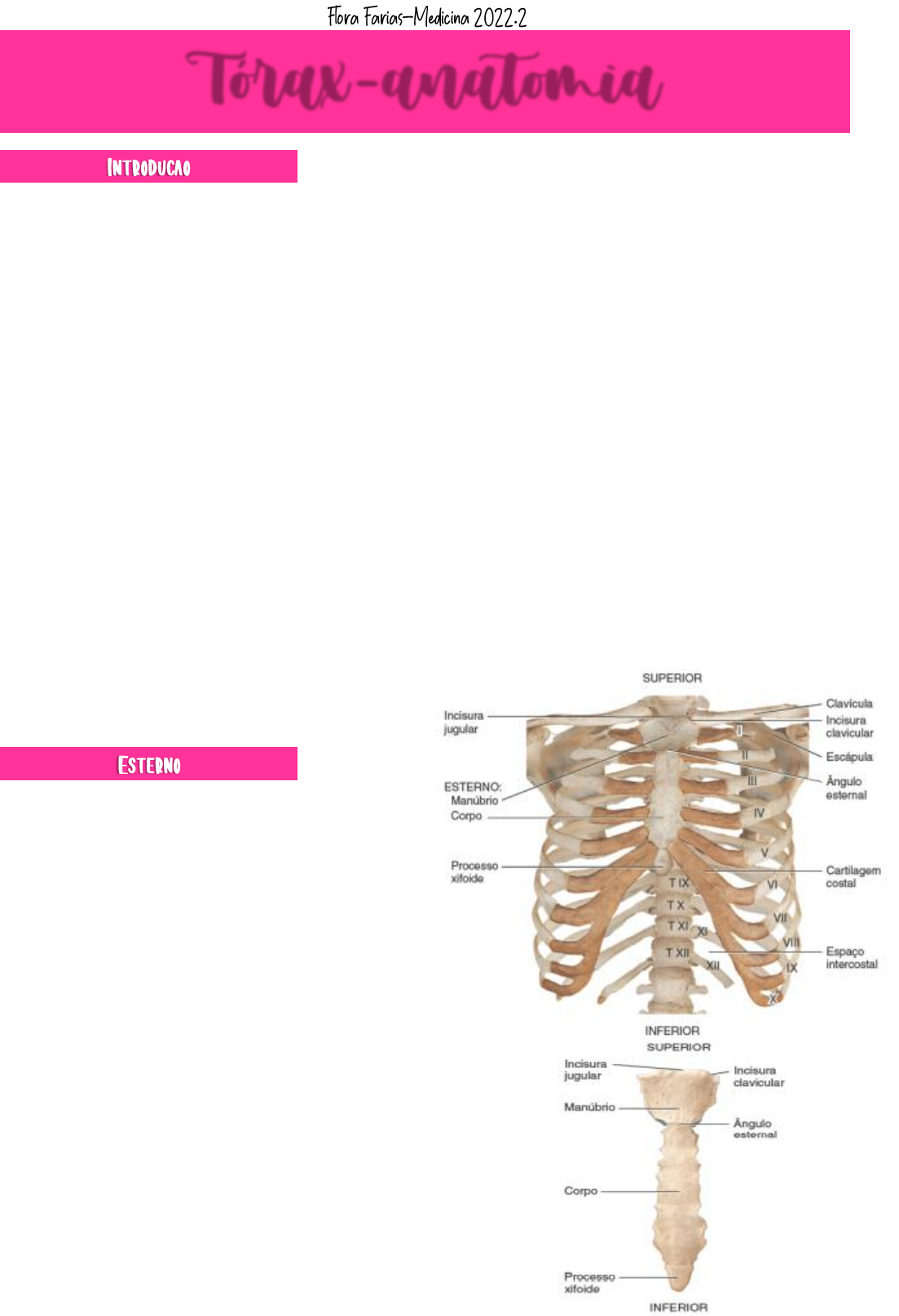 Caixa torácica: • Caixa torácica: → É mais estreita na extremidade superior → É mais larga na extremidade inferior → É achatada anteroposteriormente → Formada por: o Esterno o Costelas o Cartilagens costais→fixam as costelas ao esterno o Corpos das vértebras torácica → Função: o Encerra e protege os órgãos das cavidades torácica e abdominal superior o Fornece suporte para os ossos dos membros superiores o Participa na respiração • Ossos do tórax → Esterno → Costelas • É um osso plano e estreito • Localizado no centro da parede torácica anterior • Consiste em 3 partes: → Manúbrio (parte superior) → Corpo (parte medial e a maior delas) → Processo xifoide (parte inferior e menor delas) *Os segmentos do esterno se fundem até os 25 anos de idade e os pontos de fusão são marcados por cristas transversas* • Ângulo esternal: junção do manúbrio e do corpo • Incisura jugular: depressão da superfície superior do manúbrio • • • Incisuras claviculares: lateralmente à incisura jugular e se articulam com as extremidades mediais das clavículas para formar as articulações esternoclaviculares • O manúbrio se articula com as cartilagens costais da primeira e da segunda costelas • Corpo do esterno: se articula com as cartilagens costais da segunda á 10º costela • Processo xifoide é composto de: → Cartilagem hialina→ durante a infância e não se ossifica completamente antes dos 40 anos → Nenhuma costela se prende a ele → Oferece inserção para alguns músculos abdominais Tórax-anatomia • Existem 12 pares de costelas • Função: → Fornecem suporte estrutural para as paredes laterais da cavidade torácica • Aumentam de comprimento da primeira até a sétima e depois diminuem até a décima segunda • Cada costela se articula posteriormente com sua vértebra torácica correspondente • 1º até os 7º pares de costelas: → Se fixam anterior e diretamente ao esterno pela cartilagem costal • Cartilagens costais: → Contribuem para a elasticidade da caixa torácica → Evitam que impactos no tórax fraturem o esterno e as costelas • Costelas verdadeiras: costelas que apresentam cartilagens costais e que se prendem diretamente ao esterno • Articulações esternocostais: formadas entre as costelas verdadeiras e o esterno • Costelas falsas (Costelas vertebrocondrais- 5 pares restantes): suas cartilagens costais se fixam de maneira indireta ao esterno ou não se fixam a ele • Costelas flutuantes (costelas XI e XII): → São costelas falsas → As cartilagens costais nas extremidades anteriores nunca se fixam ao esterno → Presas apenas às vértebras torácicas posteriormente • Colo: parte estreitada da costela, lateral à cabeça • Tubérculo: estrutura protuberante na superfície posterior onde o colo se une ao corpo → Parte não articular: se fixa ao processo transverso de uma vértebra por um ligamento costotransversário lateral) → Parte articular: se articula com a fóvea costal do processo transverso de uma vértebra para formar articulações costovertebrais • Corpo (diáfise): parte principal da costela • Ângulo costal: ponto onde observa-se uma mudança abrupta na curvatura da diáfise • Sulco costal (face interna da costela): protege os vasos sanguíneos intercostais e um pequeno nervo • Espaços intercostais: ocupados por músculos intercostais, vasos sanguíneos e nervos • Os músculos da respiração alteram o tamanho da cavidade torácica para que a respiração possa acontecer • Diafragma: o músculo mais importante da respiração • Músculos intercostais: → Intercostais externos: elevam as costelas durante a inspiração para ajudar a expandir a cavidade torácica → Intercostais internos: tracionam costelas adjacentes durante a expiração forçada a fim de ajudar a diminuir o tamanho da cavidade torácica → Músculos que movimentam o cíngulo do membro superior (clavícula e escápula): estabilizam a escápula para atuar como origem fixa para a maioria dos músculos que movimentam o úmero → Mm. que movimentam o cíngulo do membro superior são classificados em 2 grupos: o Mm. torácicos anteriores (subclávio, peitoral menor e serrátil anterior) o Mm. torácicos posteriores (trapézio, levantador da escápula, romboide maior e o romboide menor) → M. Subclávio: estabiliza a clavícula durante os movimentos do cíngulo do membro superior → M. peitoral menor: movimenta a escápula e ajuda na expiração forçada → M. serrátil anterior: localizado entre as costelas e a escápula → M trapézio: é o músculo posterior mais superficial que recobre a região cervical posterior e a porção superior do tronco → M. levantador da escápula: levanta a escápula → M. romboide maior e menor: localizados profundamente em relação ao músculo trapézio → Músculos axiais (M. peitoral maior e o latíssimo do dorso): → M. deltoide (m. escapular): recobre a articulação do ombro e forma o contorno arredondado do ombro • Localizada anteriormente ao esôfago e se estende desde a laringe até a margem superior da vértebra T V, onde se divide em brônquios primários direito e esquerdo • Tubo semirrígido • 15-20 cartilagens traqueais • Carina da traqueia: crista cartilaginosa que separa os 2 orifícios dos brônquios e marca o fim da traqueia