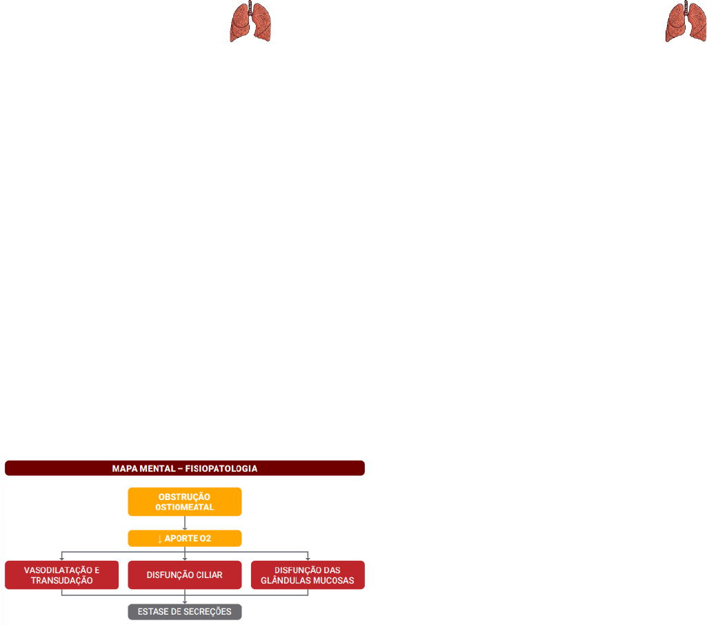 Rinossinusite e Asma Rinossinusite: Introdução: A rinossinusite (RS) consiste num processo inflamatório da mucosa de revestimento das cavidades nasais e seios nasais. Antigamente era chamada apenas de sinusite, no entanto, passou-se a adotar o novo termo pelo fato da concha nasal média se estender para os seios etmoidais. Além disso, dificilmente a inflamação sinusal ocorre sem a inflamação concomitante da mucosa nasal em continuidade. Fisiopatologia: A obstrução do ostiomeatal é o ponto de partida da doença e pode ocorrer por edema (secundário à IVAS, rinites, trauma), desvio de septo, alterações anatômicas, corpo estranho, tumor ou pólipo nasal. Essa obstrução causa uma diminuição do aporte de oxigênio nessas células. A partir daí, instala-se a disfunção ciliar, vasodilatação e disfunção das glândulas e, consequentemente, estase das secreções. A estase de secreções, além da formação de mais muco que o normal, favorece o crescimento bacteriano e o processo inflamatório na região. Classificação: A principal classificação utilizada é baseada na duração dos sintomas: a RS aguda ocorre quando a duração dos sintomas é de até 15 dias, sendo autolimitada, provável etiologia alérgica ou viral com rinorreia clara; já a RS crônica ocorre quando os sintomas persistem por mais de 1 mês, normalmente bacteriana (bactérias atípicas); ainda existe a classificação em RS subaguda que ocorre quando os sintomas persistem em um período de 15 dias a 1 mês, sendo um quadro de etiologia bacteriana, rinorreia amarelada-esverdeada, paciente se encontra prostrado e com febre. Manifestação clínica: A suspeita de uma rinossinusite aguda bacteriana deve ocorrer quando os sintomas de uma IVAS viral pioram após o 5º dia ou persistem por mais de 10 dias. É mais comum em adultos sintomatologia de congestão nasal, facialgia, cefaleia, tosse. Já em crianças é mais comum a sintomatologia de congestão nasal e tosse. Os sintomas persistem por mais de 7 dias (“gripe prolongada”) com piora a noite. A suspeita de uma rinossinusite crônica deve ocorrer quando o paciente apresenta sintomas de obstrução nasala, rinorreia, alteração do olfato (hiposmia ou anosmia), facialgia ou tosse persistentes. Diagnóstico: O diagnóstico é essencialmente clínico, podendo ser feito apenas com base nos sintomas, sem a necessidade de realização de exames complementares. O uso de radiografia simples dos seios paranasais não é indicada por não ser útil para o diagnóstico. Já a tomografia computadorizada (TC) dos seios paranasais não deve ser realizada de forma rotineira, mas se torna útil em casos de doença grave, estado imunocomprometido ou suspeita de complicações. A TC não possui relevância na diferenciação dos casos (viral ou bacteriano), porém, pode evidenciar alterações na mucosa do complexo ostiomeatal e/ou seios paranasais. O exame físico deve incluir a rinoscopia anterior que, apesar de ter um valor limitado, é útil para visualização dos pólipos nos casos em que estes estão presentes. Não existem sinais patognomônicos de RSC, mas podem ser vistas hipertrofias de conchas nasais, desvios septais ou degenerações de mucosa. Complicações: Tratamento: Recomenda-se a lavagem nasal com solução salina em todos os pacientes, com melhora na função ciliar, limpeza da cavidade e redução do edema de mucosa e dos mediadores inflamatórios. As diretrizes recomendam que nos primeiros 5 dias de doença não seja feito nenhum tratamento além do alívio sintomático (analgésicos, lavagem nasal), porque essa é a “janela” de tempo em que os quadros de RSA viral costumam se solucionar. Pacientes com RS pós-viral ou com RS bacteriana não complicada (sintomas leves, sem febre ou dor facial intensa) se beneficiam com o uso de corticoides tópicos nasais. Alguns exemplos são a budesonida, o furoato de mometasona e propionato de fluticasona, que aliviam a rinorreia, a congestão nasal, a dor facial, além de minimizar o uso indiscriminado de antibióticos. Devem ser usados por, no mínimo, 14 dias para melhora dos sintomas. O uso de corticoides orais é recomendado para adultos com RSA bacteriana e com intensa dor facial, desde que não apresente contraindicações. Devem ser utilizados por 3 a 5 dias, durante o quadro agudo. A preocupação com o tratamento das rinossinusites é o uso indiscriminado de antibióticos, que contribui para a resistência bacteriana. A maior parte das prescrições antibióticas para rinossinusites são desnecessárias, uma vez que a etiologia mais comum costuma ser infecção viral, levando a quadros autolimitados. O uso de antibióticos em infecções virais não altera o curso da doença. Por isso, nos casos de RSA leve e/ou pós-viral, o tratamento sintomático é o de escolha. No entanto, se não houver melhora após o tratamento sintomático ou se os sintomas piorarem, o uso de antibiótico (ATB) passa a ser indicado, em associação com o corticoide. Em geral, o ATB de escolha é a amoxicilina, caso o paciente tenha alergia à amoxicilina pode ser utilizado macrolídeos. A duração do tratamento com antibióticos varia entre 7 a 14 dias. Se não houver melhora com o uso de ATB em 48 horas ou houver suspeita de complicações, deve-se internar o paciente, colher culturas, realizar uma TC e iniciar ATB venoso, mantendo o corticoide oral. Asma: Introdução: A asma é uma síndrome caracterizada pelos sintomas oriundos da redução do calibre das vias aéreas por inflamação crônica da árvore brônquica a partir de uma reação imunomediada, a hiperresponsividade a alérgenos diversos. Como consequência desse processo, temos a sintomatologia clássica da crise asmática: tosse intermitente, sibilância e dispneia. Fisiopatologia: A asma pertence a um grupo de doenças pulmonares nas quais há obstrução do fluxo do ar, de forma recorrente e reversível, e hiperresponsividade da célula muscular 