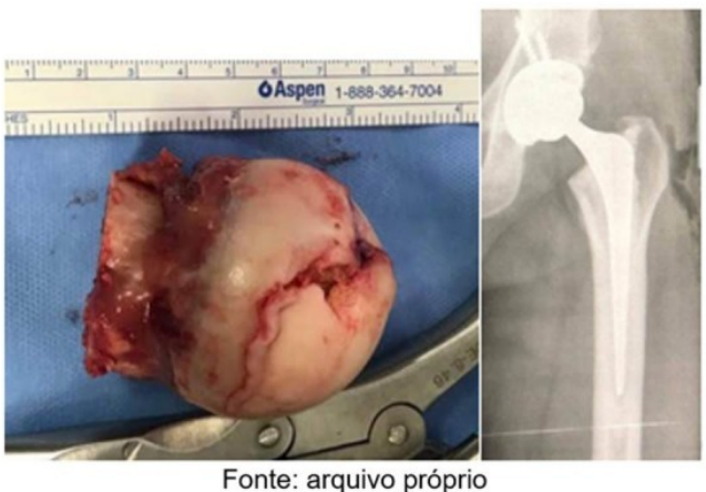 FISIOTERAPIA INTERDISCIPLINAR Pergunta 2 Paciente WLS, 42 anos, foi submetido a uma cirurgia de artroplastia total de quadril à esquerda com colocação de prótese híbrida, devido à história de necrose avascular da cabeça de fêmur (imagem da cabeça do fêmur retirada na cirurgia abaixo), a qual foi descoberta após o paciente relatar dores na parte anterointerna de quadril, associada à claudicação na marcha e quando permanecia por longos períodos na posição sentada. Na época teve que interromper a prática de corrida devido à dor e mesmo fazendo a fisioterapia não obteve melhora. Foi então que o ortopedista lhe solicitou a ressonância magnética na qual foi confirmado o diagnóstico de necrose avascular, sendo encaminhado para a cirurgia. Você foi indicado para atender este paciente a domicílio e iniciou a fisioterapia com ele na terceira semana de pós-operatório. Qual das alternativas abaixo descreve corretamente o tipo de cirurgia realizada e representa a conduta mais coerente com os cuidados pós- operatórios recomendados? Respostas: a. A prótese híbrida, conforme observada na radiografia, apresenta o encaixe femoral com cimento e o acetabular fixado com parafuso, requer nesta fase descarga parcial de peso e deambulação com muletas. A fisioterapia deverá mobilizar passivamente o quadril do paciente em todas as direções conforme amplitude tolerada pelo paciente e realizar exercícios isométricos para MMII. b. A prótese híbrida, conforme observada na radiografia, apresenta o encaixe femoral e acetabular fixados com cimento, permite descarga total de peso e deambulação com bengala contralateral à cirurgia. A fisioterapia deverá mobilizar passivamente o quadril do paciente em todas as direções conforme amplitude tolerada pelo paciente e realizar exercícios isométricos para MMII. c. A prótese híbrida conforme observada na radiografia apresenta o encaixe femoral com cimento e o acetabular fixado com parafuso, requer nesta fase descarga parcial de peso e deambulação com muletas. A fisioterapia deverá mobilizar passivamente o quadril do paciente em flexão, extensão e abdução máximas de quadril conforme tolerância do paciente, sendo contraindicadas as amplitudes de adução e rotações e realizar exercícios isométricos para MMII. d. A prótese híbrida, conforme observada na radiografia, apresenta o encaixe femoral e acetabular com cimento, requer nesta fase descarga parcial de peso e deambulação com muletas. A fisioterapia deverá mobilizar passivamente o quadril do paciente em flexão até 90 graus, extensão e abdução máximas de quadril conforme tolerância do paciente, sendo contraindicadas as amplitudes de adução e rotações e realizar exercícios isotônicos para MMII e apenas isometria para o glúteo médio. e. A prótese híbrida, conforme observada na radiografia, apresenta o encaixe femoral com cimento e o acetabular fixado com parafuso, requer nesta fase descarga parcial de peso e deambulação com muletas. A fisioterapia deverá mobilizar passivamente o quadril do paciente em extensão e abdução máximas de quadril conforme tolerância do paciente, sendo contraindicada as amplitudes de adução além da linha média, flexão maior que 90 graus e rotações, realizar exercícios isométricos ou isotônicos para MMII e apenas para glúteo médio manter isometria nesta fase.