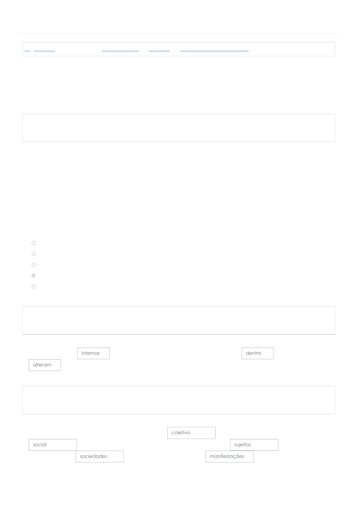 16/10/22, 23:16 1.5 Teste seus conhecimentos: Revisão da tentativa https://aprendamais.mec.gov.br/mod/quiz/review.php?attempt=1159411&cmid=21149 1/4 Página inicial / Meus cursos / INTERCULT2022B / 1 Cultura / 1.5 Teste seus conhecimentos Iniciado em domingo, 16 out 2022, 23:09 Estado Finalizada Concluída em domingo, 16 out 2022, 23:16 Tempo empregado 7 minutos 8 segundos Avaliar 7,67 de um máximo de 10,00(77%) Questão 1 Correto Atingiu 1,00 de 1,00 Questão 2 Correto Atingiu 1,00 de 1,00 Questão 3 Correto Atingiu 1,00 de 1,00 Leia as afirmativas abaixo. I. A cultura que prevalece, ou seja, as manifestações humanas que são valorizadas e usadas no cotidiano, são aquelas que fazem parte do grupo humano vencedor. Portanto, nenhuma manifestação cultural desapareceu apesar das guerras e extermínios. II. A cultura deve ser entendida como algo diferente das características biológicas e naturais. Trata-se do resultado da interação do homem com as coisas e com os seres. III. O ambiente geográfico e aspectos biológicos influenciam, entretanto não determinam o comportamento dos seres humanos em sociedade. E a cultura ajudará na adaptação ou na transformação do ambiente, fazendo o ser humano se habituar ou interferir no ambiente natural. Quais estão corretas? a. Apenas II. b. Apenas III. c. Apenas I. d. Apenas II e III. e. Apenas I e III. As relações culturais são novas relações ou padrões que são produzidos do próprio grupo e as práticas e manifestações culturais internamente. internas dentro alteram Então, de maneira mais elaborada cultura é um processo que é produzido num grupo . Ela é fruto de padrões sociais que fazem parte da vida dos . A cultura organiza grupos ou e dá significado às práticas e sociais. coletivo social sujeitos sociedades manifestações https://aprendamais.mec.gov.br/ https://aprendamais.mec.gov.br/course/view.php?id=486 https://aprendamais.mec.gov.br/course/view.php?id=486#section-1 https://aprendamais.mec.gov.br/mod/quiz/view.php?id=21149 16/10/22, 23:16 1.5 Teste seus conhecimentos: Revisão da tentativa https://aprendamais.mec.gov.br/mod/quiz/review.php?attempt=1159411&cmid=21149 2/4 Questão 4 Correto Atingiu 1,00 de 1,00 Questão 5 Incorreto Atingiu 0,00 de 1,00 Questão 6 Correto Atingiu 1,00 de 1,00 Questão 7 Correto Atingiu 1,00 de 1,00 A intenção da indústria cultural é, necessariamente, produzir o que pode ser comercializado e gerar lucro. Escolha uma opção: Verdadeiro Falso Um exemplo de relação cultura interna é a dominação dos portugueses e espanhóis no período colonial na América e tem como exemplo é a mudança das línguas faladas pela língua dos colonizadores. Escolha uma opção: Verdadeiro Falso Sobre o conceito de cultura, assinale a alternativa correta: a. Tem o mesmo significado de cultivar a terra, pois a cultura é apenas o que aconteceu no passado. b. O conceito de cultura é inútil aos seres humanos, visto que não os beneficia sob nenhuma aspecto, a vida humana. c. É uma palavra complexa e que designa a forma como os seres humanos dão significado e valor a tudo que lhes envolve e identificando grupos sociais e sociedades. d. Há culturas mais e menos importantes. Algumas são elaboradas e contribuem com o conhecimento científico da sociedade, outras são inúteis. Complete corretamente a frase abaixo: “A cultura massa tem como característica a padronização do seu produto, para tentar atingir a maior quantidade de pessoas possível e dessa forma ampliar o consumo e o lucro.” 16/10/22, 23:16 1.5 Teste seus conhecimentos: Revisão da tentativa https://aprendamais.mec.gov.br/mod/quiz/review.php?attempt=1159411&cmid=21149 3/4 Questão 8 Correto Atingiu 1,00 de 1,00 Questão 9 Incorreto Atingiu 0,00 de 1,00 Questão 10 Parcialmente correto Atingiu 0,67 de 1,00 Atualmente a troca entre culturas é muito significativa . A mais comum, é promovida pelas relações comerciais . Que interferem principalmente nos hábitos de consumo , na política e na economia. Portanto, interfere na cultura . Em relação à cultura popular, assinale a alternativa incorreta. a. A cultura popular é aquela produzida academicamente, ou seja, a partir de estudo sistematizado e aprofundado em relação a determinado tema, por exemplo, a música de uma orquestra sinfônica. b. Quando falarmos em cultura popular, estaremos nos referindo apenas à maneira como uma manifestação é produzida. Porque nos interessa a produção da cultura e a maneira como ela se manifesta. c. A expressão cultura popular também é usada para se referir à cultura que se popularizou, ou seja, se tornou conhecida de muitos. d. A cultura popular se refere à produção cultural realizada por grupos sociais para manifestar desejos, valores e interesses. Produzir uma festa junina, por exemplo, envolve a comunidade interessada e parte-se de uma tradição popular com elementos desenvolvidos sem necessidade de estudos ou pesquisa. Sobre a indústria cultural e a cultura de massa, assinale as alternativas corretas. a. A cultura é influenciada pela indústria cultural, bem como é influenciada por ela. Os produtos criados por essa indústria são direcionados a públicos distintos. b. A indústria cultural produz de acordo com a necessidade do mercado e também cria necessidades. A intenção é necessariamente produzir o que pode ser comercializado e gerar lucro. c. A cultura de massa tem como característica a padronização do seu produto. d. A cultura de massa é transmitida por meios de comunicação alternativos e, por isso, tem um alcance restrito de difusão, ou seja, atingem poucas pessoas ao mesmo tempo. ◄ 1.4 Cultura de massa e indústria cultural Seguir para... 2.1 Formação étnica do brasileiro ► https://aprendamais.mec.gov.br/mod/page/view.php?id=21148&forceview=1 https://aprendamais.mec.gov.br/mod/page/view.php?id=21151&forceview=1 16/10/22, 23:16 1.5 Teste seus conhecimentos: Revisão da tentativa https://aprendama
