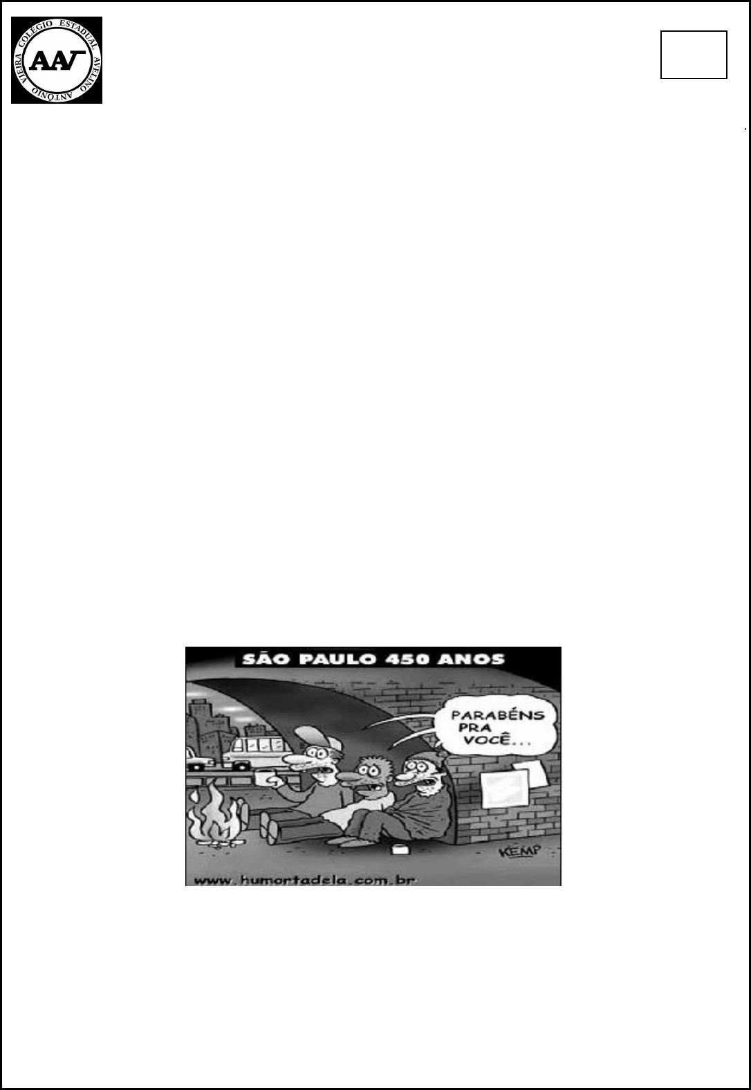 COLÉGIO AVELINO ANTONIO VIEIRA – EFM NOME: ................................................................................................................................ Nº: ............ SÉRIE: TURMA: D ATA:.........../......../......... PROVA DE: SOCIOLOGIA PROFESSOR (A): VIVIANE Orientações: Sua prova vale 3,0 pontos; Ao receber sua prova coloque nome e número; Não utilize corretivo. Questões rasuradas serão anuladas; As respostas devem ser a caneta ( azul/preta) Boa Prova!!!!!! NOTA: RECUPERAÇÃO – 2º Trimestre Sociologia Urbana e Questões de Gênero 1. (UFAL) Sobre o tema “Urbanização”, analise as afirmações a seguir. 1) A partir do final do século XIX, houve nos países desenvolvidos um processo de suburbanização da população de maior poder aquisitivo, que procurava distanciar-se das concentrações populacionais e industriais e dos problemas ambientais dos centros urbanos. 2) A partir da década de 1950, houve uma ampliação considerável da superfície ocupada pelas cidades nos países subdesenvolvidos, num ritmo muito mais intenso do que o verificado nos países onde a urbanização acontecera há mais tempo. 3) Toda cidade é uma forma de organização complexa, do ponto de vista socioespacial, pois seu desenvolvimento depende da infraestrutura administrativa, cultural e tecnológica. 4) A cidade surgiu com as primeiras civilizações da Antiguidade, mas foi a partir da Revolução Industrial que surgiu o maior desenvolvimento urbano de toda a História da humanidade. Está(ão) correta(s): a) 4 apenas b) 1 e 2 apenas c) 1, 2 e 4 apenas d) 2, 3 e 4 apenas e) 1, 2, 3 e 4. Resposta:_____ (valor 0,5) 2. (UEL) Analise a figura a seguir. Com base na charge e nos conhecimentos sobre exclusão social em grandes cidades, considere as afirmativas a seguir. I. A charge remete ao problema da exclusão social nas grandes cidades, cuja população afetada acaba fazendo das ruas seu local de moradia, expressão territorial das enormes desigualdades sociais dos países em desenvolvimento como o Brasil. II. A charge mostra a estupefação dos moradores de rua da metrópole paulistana, que foram obrigados a fazer parte do cenário de comemoração dos 450 anos da cidade, a fim de demonstrarem o quanto os recentes governos municipais estiveram comprometidos com sua causa. III. A charge faz referência à tendência de redução do número dos “sem teto”, um problema característico das regiões metropolitanas brasileiras, em função do processo de Globalização e da consequente formação de uma aldeia global. IV. A charge remete à segregação socioespacial nas grandes cidades e mostra que os moradores de rua têm poucos motivos para comemorar o aniversário das metrópoles onde moram, haja vista que sua sobrevivência tem sido constantemente ameaçada. Estão corretas apenas as afirmativas: a) I e III. b) I e IV. c) II e III. d) I, II e IV. e) II, III e IV. Resposta:_____ (valor 0,5) 3. (UENP 2011) A cultura contemporânea é marcada pelo medo do outro, pelo egoísmo e pela intolerância; é possível identificar, ainda, uma ideologia que é caracterizada pela ausência de fraternidade, pela desintegração dos laços humanos e pela solidão. Entre as principais críticas relacionadas a essa problemática (guerra civil, democracia e exclusão) estão as queixas ao sistema representativo, as queixas de direito e justiça, as queixas econômicas. Sobre o tema assinale a alternativa incorreta. A) O ceticismo quanto à política – sobretudo a democracia – acompanha esta mesma linha de raciocínio. As relações autônomas minoram a criação de uma identidade e os direitos já reconhecidos, poucas vezes são efetivados. A solidão cresce na mesma proporção da atitude cética. B) Embora haja medo do outro, as culturas de um modo geral estão se abrindo para acolher o diferente, e isso pode ser percebido tanto na Europa, com relação ao mulçumano, quanto no Brasil, com relação aos negros e indígenas, por exemplo. C) As queixas de representatividade se dirigem tanto às distorções de representação internas de cada Estado, quanto externas, voltadas a atacar as distorções de representatividade existentes na Organização das Nações Unidas, por exemplo. D) As queixas de direito e justiça ocorrem porque, a despeito de serem frequentemente reconhecidos nas constituições nacionais, não são efetivados especialmente no tocante aos grupos minoritários, isso tanto no mundo desenvolvido quanto no mundo subdesenvolvido, o que tem colaborado para o aumento do número de movimentos que têm por escopo a reivindicação de direitos, ou da efetivação dos já reconhecidos. E) Quanto às queixas econômicas, diga-se que estão relacionadas ao alcance da pobreza no mundo de hoje. Embora presente no mundo todo, ela é distribuída de forma desigual, de acordo com critérios de raça, etnia e gênero. Por exemplo, encontram-se no sul da Ásia e na África subsaariana aproximadamente 70% da população mundial que vivem com menos de um dólar por dia. Resposta:_____ (valor 0,5) 4. (UFPI) Com relação ao processo de urbanização do mundo contemporâneo, é correto afirmar: A) A rede urbana se organiza somente nos países industrializados porque se estabelece uma dependência dos serviços urbanos dos pólos industriais em relação às demais cidades periféricas. B) Uma rede urbana começa a se estabelecer a partir dos fluxos industriais mantidos entre um grupo de cidades. C) O processo de globalização possibilitou o estabelecimento de um conceito único de cidade para todos os países do mundo. D) A Revolução Industrial, momento essencial para o desenvolvimento do sistema capitalista, desencadeou grandes transformações sócio-espaciais nas cidades, elevando cada vez mais os índices de urbanização. E) A urbanização acelerada promove a ocupação dos espaços vazios no interior das cidades dos países subdesenvolvidos ou emergentes, principalment