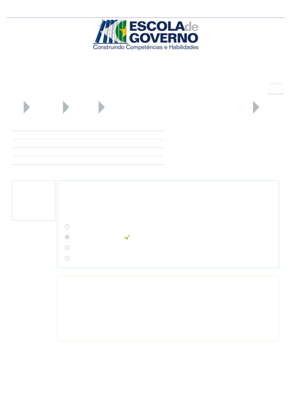 Buscar cursos Questão 1 Correto Atingiu 1,00 de 1,00 Noções de Administração do Trabalho - T3/2022 Iniciado em segunda, 17 Out 2022, 13:56 Estado Finalizada Concluída em segunda, 17 Out 2022, 15:41 Tempo empregado 1 hora 44 minutos Avaliar 9,00 de um máximo de 10,00(90%) Como são denominadas as saídas do sistema de produção em que a transformação é normalmente imaterial com participação do usuário final que recebe prestações que podem ser não físicas: Escolha uma: a. Saídas tangíveis; b. Saídas intangíveis. Resposta correta. c. Saídas em doação; d. Saídas em mútuo; Sua resposta está correta. Resposta correta: Já nos sistemas de operações de serviços, as entradas e saídas podem ser intangíveis e as transformações podem ser não físicas. O cliente ou consumidor faz parte do processo de transformação, posto que os serviços só ocorrem quando o cliente o solicita. Como exemplo podemos citar o atendimento de um plantão médico em um hospital. A resposta correta é: Saídas intangíveis.. Mensagens 4 SERGIO KIYOSHI MATSUOKA 2022 Cursos NADT0322 Unidade 1 - Noções de Sistemas de Trabalho (10/10 a 16/10/2022) Exercício de Fixação 1. Unidade 1. http://eadeg.gestao.mt.gov.br/ http://eadeg.gestao.mt.gov.br/ http://eadeg.gestao.mt.gov.br/course/index.php?categoryid=13 http://eadeg.gestao.mt.gov.br/course/view.php?id=96 http://eadeg.gestao.mt.gov.br/course/view.php?id=96§ion=2 http://eadeg.gestao.mt.gov.br/mod/quiz/view.php?id=4594 Questão 2 Correto Atingiu 1,00 de 1,00 Em relação ao conceito de governança pública no Estado Democrático de Direito, analise as assertivas a seguir e depois assinale a alternativa correta: I – A governança pública é um requisito do modelo de administração pública gerencial, no qual há uma interação entre os diversos níveis de governo, e ainda, entre esses e as demais organizações empresariais e da sociedade civil; II – A governança pública tem como intuito atingir resultados, focado em eficácia, alcançando assim o bem comum, ou seja, é a gestão da capacidade financeira e administrativa em sentido amplo de uma organização implementar suas políticas; III – A governança pública concerne aos meios e processos utilizados para produzir resultados eficazes, o que garante a existência da legitimidade do Estado, uma vez que se associa à capacidade de administrar, seja em termos financeiro, sejam gerenciais, sejam técnicos; IV – A construção da Governança deu-se em razão da necessidade de abarcar todas as formas de gestão dos problemas na sociedade e seus múltiplos atores; V – A governança pública e a administração pública gerencial são incompatíveis com o Estado Democrático de Direito. Escolha uma: a. Somente as assertivas II e IV estão corretas; b. Todas as assertivas estão corretas. c. Somente as assertivas I e III estão corretas; d. Somente a assertiva V está incorreta; Resposta correta. Sua resposta está correta. Resposta correta: A governança pública seria um modelo de administração pública gerencial, no qual há uma interação entre os diversos níveis de governo, e ainda, entre esses e as demais organizações empresariais e da sociedade civil. Nesse sentido, tem como intuito atingir resultados, focado em eficácia, alcançando assim o bem comum, ou seja, é a capacidade financeira e administrativa em sentido amplo de uma organização implementar suas políticas. Sendo assim, a governança concerne aos meios e processos utilizados para produzir resultados eficazes, o que garante a existência da legitimidade do Estado, uma vez que se associa à capacidade de administrar, seja em termos financeiro, sejam gerenciais, sejam técnicos. A construção da Governança deu-se em razão da necessidade de abarcar todas as formas de gestão dos problemas na sociedade e seus múltiplos atores. A resposta correta é: Somente a assertiva V está incorreta;. Questão 3 Correto Atingiu 1,00 de 1,00 Questão 4 Correto Atingiu 1,00 de 1,00 Indique a opção abaixo que contém os princípios constitucionais que se relacionam com conceito de accountability aplicado ao Estado Democrático de Direito: Escolha uma: a. simetria, liberdade, igualdade, ampla defesa e contraditório; b. não confisco, livre trânsito, presunção da inocência e devido processo legal; c. proporcionalidade, razoabilidade, igualdade, anterioridade e noventena. d. legalidade, impessoalidade, moralidade, publicidade e eficiência; Resposta correta. Sua resposta está correta. Resposta correta: Logo, accountability alcança os princípios constitucionais de legalidade, impessoalidade, moralidade, publicidade, bem como eficiência, visto que o administrador público deve responder por todos eles. A resposta correta é: legalidade, impessoalidade, moralidade, publicidade e eficiência; . Indique a opção abaixo que se refere a entradas que são denominadas como recursos de transformação que integram aos sistemas de produção de intangíveis: Escolha uma: a. Instalações e funcionários. Resposta correta. b. Materiais, informações e usuários; c. Dinheiro, fornecedores e matérias primas; d. Créditos, empréstimos e dívidas; Sua resposta está correta. Resposta correta: Os recursos de input podem ser classificados como recursos de transformação (instalações e funcionários) que agem em direção aos recursos transformados (materiais, informações e clientes) que são, de algum modo, transformados pela produção. A resposta correta é: Instalações e funcionários.. Questão 5 Incorreto Atingiu 0,00 de 1,00 Lei atentamente e depois indique a opção correta: I – Nos sistemas de produção, a dimensão do volume de produção se refere ao grau de repetição de procedimentos para obter um mesmo produto ou serviço; II – Nos sistemas de produção, a dimensão da variedade da produção se refere a diversidade de características dos produtos ou serviços; III – Nos sistemas de produção, 