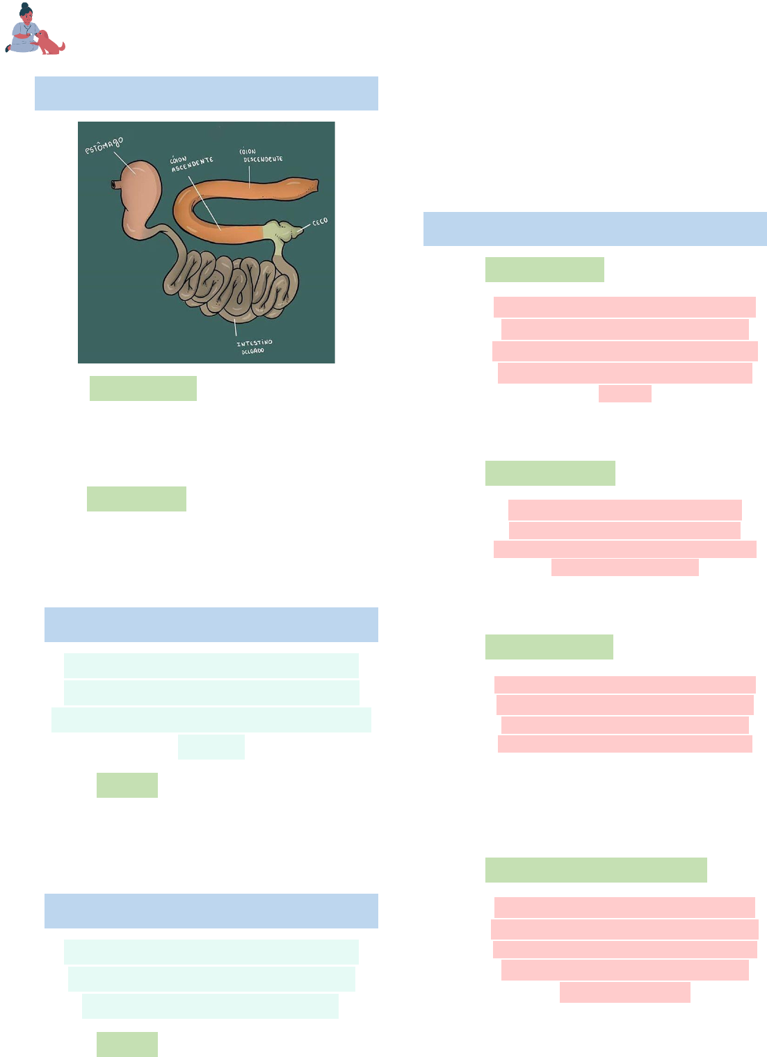 ENTERITES 1 INTRODUÇÃO • O Intestino delgado é composto pelo duodeno, jejuno e o Íleo, é nele que ocorre a finalização do processo de digestão e o início do processo de absorção das moléculas que foram quebradas durante a digestão. • O intestino grosso vai do íleo até́ o ânus, sendo dividido, anatomicamente, em quatro regiões distintas denominadas de ceco, o cólon, reto e ânus. Nele ocorre a maior parte da absorção de água. ENTERITE AGUDA Processo inflamatório da mucosa intestinal, com sinais digestivos de aparecimento abrupto e curso clínico curto, podendo ser auto-limitante, severo ou fulminante • ETIOLOGIA - Parasitismo - Intolerância Alimentar - Fármacos - Doenças Sistêmicas ENTERITE CRÔNICA Processo inflamatório de mucosa intestinal, com curso prolongado e sinais amenos, sendo menos comum, quando comparado a enterite aguda. • ETIOLOGIA - Doenças Inflamatórias Crônicas -> Enterite eosinofílica, granulomatosa - Linfoma - Parasitismo – Giardia spp. - Linfangiectasia (dilatação dos vasos linfáticos da mucosa e submucosa – perda de linfa) FISIOPATOGENIA • DIARREIA OSMÓTICA Absorção reduzida ➔ Acúmulo de solutos não absorvíveis no lúmen ➔ hidrólise a ácidos orgânicos ➔ Atividade osmótica ➔ retenção de H20 ➔ Distensão de alças ➔ Diarreia - Falha digestiva primária - Falha absortiva (doença intestinal) • DIARREIA SECRETÓRIA Vilosidades intestinais ➔ Secreção de fluidos independentes da capacidade absortiva, permeabilidade ou da presença de gradientes osmóticos - Mecanismos normais exacerbados - aumento do fluxo de fluidos e eletrólitos • DIARREIA EXSUDATIVA Aumento da permeabilidade das mucosas ➔ Aumento pressão hidrostática local ➔ Perda de líquido para dentro do lúmen; perda de eritrócitos (quebra da barreira) - Processo inflamatório da mucosa intestinal - ICCD - Obstrução do fluxo linfático (linfoma) • DIARREIA POR MOTILIDADE ANORMAL Hipermotilidade ➔ Aumento e frequência da motilidade ➔ Aceleração do trânsito ➔ contato insuficiente do bolo alimentar com as vilosidades ➔ ausência de digestão e absorção ➔ diarreia - Geralmente consequência de um dos 3 mecanismos anteriores 2 SINAIS CLÍNICOS • Diarreia • Desconforto abdominal • Aumento dos borborigmos • Vômitos • Hematoquezia, melena • Distensão das alças intestinais • Desidratação LOCALIZAÇÃO • Diarreia do intestino delgado – doença do próprio intestino ou das glândulas digestivas acessórias (pâncreas, fígado, vesícula biliar) • Má digestão - Parasitismo - IPE - Supercrescimento bacteriano • Má absorção (mucosa intestinal) - Hipersensibilidade alimentar - Doença Inflamatória Intestinal - Linfoma DIAGNÓSTICO • Exclusão de problemas dietéticos ou doenças sistêmicas • Intestino delgado x Intestino grosso • Verificação das funções secretoras e absortivas (má digestão e má absorção) • Diagnóstico etiológico • Terapêutico • Raio X • Endoscopia: Duodenoscopia, Biopsia intestinal • Hemograma: Proteína, Anemia, Eosinofilia, Leucocitose e Leucopenia • Coproparasitologico • Bioquímica Sérica • Cultura das fezes • Isolamento viral • Pesquisa de sangue oculto TRATAMENTO • Manutenção do equilíbrio hídrico-eletrolítico e ácido-básico • Fluidoterapia oral • Fluidoterapia parenteral - Ringer com lactato + KCl -> 0,5/mEq/kg/hora • Protetores de mucosas – adsorção de bactérias e toxinas • Restrição dietética • Agentes anti-bacterianos • Vermífugos