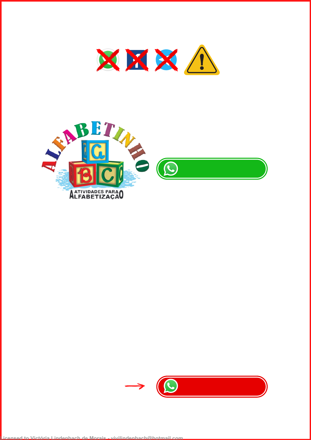 ESSE MATERIAL É PROTEGIDO COM DIREITOS AUTORAIS DE SEU CRIADOR Toda e qualquer divulgação, distribuição, plágio ou venda ilegal, assim que descoberto(a) via rastreamento digital, o responsável será penalizado previsto no código civil e criminalmente por seu ato criminoso! CLIQUE PARA Você adquiriu um dos materiais que pertencem à empresa ALFABETINHO, o nosso material é vendido somente em SITES oficiais autorizados! É válido ressaltar, que não vendemos os nossos produtos via pix no WhatsApp, ou seja, pessoas se passando por nós mandando número de pix no seu particular. Caso isso tenha acontecido com você, denuncie! Pois você caiu num golpe e comprou de uma pessoa que está vendendo sem autorização, além de ser crime compactuar, você não irá receber as nossas atualizações futuras no seu e-mail. Os métodos de pagamento devem ser visualizados e feitos somente no nosso site! ATENÇÃO Contato para denunciar via e-mail: Contato@alfabetinho.com.br DENUNCIAR FALE CONOSCO Alguma dúvida? Licensed to Victória Lindenbach de Morais - vivilindenbach@hotmail.com https://api.whatsapp.com/send?phone=554497031816&text=Ol%C3%A1!%20Gostaria%20de%20conversar%20um%20assunto. https://api.whatsapp.com/send?phone=554497031816&text=Ol%C3%A1%2C%20poderia%20me%20ajudar%3F%20 AVISO DE DIREITOS AUTORAIS ATT: EQUIPE JURÍDICA ALFABETINHO Todo o material desta apostila (incluindo textos e imagens) estão protegidos por direitos autorais de seu criador: ALFABETINHO, sendo proibido toda e qualquer forma de plágio, cópia, venda ilegal, compartilhamento ou qualquer outra forma de uso, não autorizada expressamente, seja ela onerosa ou não, sujeitando- se o transgressor, as penalidades previstas civil e criminalmente. O delito de violação de direito autoral está previsto no artigo 184 do Código Penal, que descreve a conduta criminosa como sendo o ato de infringir direitos inerentes ao autor, ou com eles relacionados. Um exemplo muito corriqueiro são as falsificações, ou os chamados produtos piratas, que são copiados e vendidos sem autorização de quem os idealizou. Toda e qualquer divulgação, distribuição, plágio ou venda ilegal, assim que descoberto(a) o responsável será penalizado previsto no código civil e criminalmente por seu ato criminoso! Licensed to Victória Lindenbach de Morais - vivilindenbach@hotmail.com http://www.planalto.gov.br/ccivil_03/leis/l9610.htm @alfabetinho_ Primeiramente gostariamos de agradecer a sua confiança em nosso trabalho. Obrigado! PARABÉNS PELA COMPRA! Poste uma imagem de alguma folha que você irá usar dos Planejamentos e marque a gente no seu stories do Instagram e ganhe gratuitamente +100 atividades de alfabetização marque @alfabetinho_ Quer ganhar um presente exclusivo gratuitamente? Licensed to Victória Lindenbach de Morais - vivilindenbach@hotmail.com https://www.instagram.com/alfabetinho_/ https://www.instagram.com/alfabetinho_/ PROFISSIONAIS QUE ATUAM MAIS DE 15 ANOS NA ÁREA! QUALIDADE E SUPORTE PARA CLINTES Boas vindas! CONHEÇA OS AUTORES REDE PEDAGÓGICA DE PROFESSORES ESPECIALIZADOS AMOR A EDUCAÇÃO INFANTIL E MATERIAIS EXCLUSIVOS! @redeeduca @alfabetinho_ Licensed to Victória Lindenbach de Morais - vivilindenbach@hotmail.com https://www.instagram.com/redeeduca/ https://www.instagram.com/alfabetinho_/ https://www.instagram.com/redeeduca/ https://www.instagram.com/alfabetinho_/ Licensed to Victória Lindenbach de Morais - vivilindenbach@hotmail.com Licensed to Victória Lindenbach de Morais - vivilindenbach@hotmail.com Licensed to Victória Lindenbach de Morais - vivilindenbach@hotmail.com Licensed to Victória Lindenbach de Morais - vivilindenbach@hotmail.com Licensed to Victória Lindenbach de Morais - vivilindenbach@hotmail.com Licensed to Victória Lindenbach de Morais - vivilindenbach@hotmail.com Licensed to Victória Lindenbach de Morais - vivilindenbach@hotmail.com Licensed to Victória Lindenbach de Morais - vivilindenbach@hotmail.com Licensed to Victória Lindenbach de Morais - vivilindenbach@hotmail.com Licensed to Victória Lindenbach de Morais - vivilindenbach@hotmail.com Licensed to Victória Lindenbach de Morais - vivilindenbach@hotmail.com Licensed to Victória Lindenbach de Morais - vivilindenbach@hotmail.com Licensed to Victória Lindenbach de Morais - vivilindenbach@hotmail.com Licensed to Victória Lindenbach de Morais - vivilindenbach@hotmail.com Licensed to Victória Lindenbach de Morais - vivilindenbach@hotmail.com Licensed to Victória Lindenbach de Morais - vivilindenbach@hotmail.com Licensed to Victória Lindenbach de Morais - vivilindenbach@hotmail.com Licensed to Victória Lindenbach de Morais - vivilindenbach@hotmail.com Licensed to Victória Lindenbach de Morais - vivilindenbach@hotmail.com Licensed to Victória Lindenbach de Morais - vivilindenbach@hotmail.com Licensed to Victória Lindenbach de Morais - vivilindenbach@hotmail.com Licensed to Victória Lindenbach de Morais - vivilindenbach@hotmail.com Licensed to Victória Lindenbach de Morais - vivilindenbach@hotmail.com Licensed to Victória Lindenbach de Morais - vivilindenbach@hotmail.com Licensed to Victória Lindenbach de Morais - vivilindenbach@hotmail.com Licensed to Victória Lindenbach de Morais - vivilindenbach@hotmail.com Licensed to Victória Lindenbach de Morais - vivilindenbach@hotmail.com Licensed to Victória Lindenbach de Morais - vivilindenbach@hotmail.com Licensed to Victória Lindenbach de Morais - vivilindenbach@hotmail.com Licensed to Victória Lindenbach de Morais - vivilindenbach@hotmail.com Licensed to Victória Lindenbach de Morais - vivilindenbach@hotmail.com