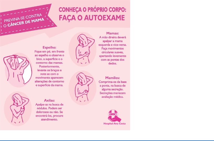 APS; Câncer de mama: medidas de prevenção: Autoexame da mama e exame clinico das mamas Autoexame das mamas o autoexame das mamas é recomendado desde de 1930 e foi introduzido em 1950 nas politicas de saúde publica norte-americanas. O autoexame é muito importante, pois, em 90% dos casos, é a própria paciente que descobre as alterações em sua mama. Com o passar do tempo, é cada vez menor a percentagem de mulheres que continuam realizando mensalmente o autoexame das mamas. Estudos relevam que o autoexame, como técnica de rastreamento, mas não é eficaz, e não há evidencias de redução da mortalidade, porém, é um método mais barato e acessível a população feminina, conseguem diagnosticar tumores em estágios dois que apresentam diâmetro entre 2 a 5 cm. O autoexame das mamas tem recomendação aparti de 20 anos e deve ser realizado uma vez por mês pela própria mulher em suas mamas e o melhor período é de sete a dez dias após a menstruação, quando as mamas estão menos doloridas e inchadas, e quem não menstrua mais deve escolher um dia do mês para realizar o autoexame. A importância da realização mensal do autoexame serve como referencia para a mulher com a relação á palpação habitual normal, lavando ao conhecimento do seu corpo e se haver alguma alteração logo perceberá, a presença de nódulos mamários não é uma indicação necessariamente de neoplasia maligna. Durante o autoexame as mulheres precisam posicionar diante do espelho a procurar alguma deformidade ou alteração no formato das mamas, abaulamentos, retrações e feridas ao redor do mamilo. Durante o banho ou deitada deve procurar por caroços ou nódulos nas mamas ou axilas e saída de secreções pelos mamilos. https://www.novosolhares.com/2020/10/29/a-importancia-do-auto-exame-da-mama/ Exame clinico das mamas No Brasil, as recomendações para a detecção precoce, o exame clinico de mamas (ECM) é uma investigação anual recomendada para as mulheres a partir de 40 anos para as mulheres sem risco e com 35 anos ou mais para as com risco de desenvolve a doença, o ECM segue recomendação anual, assim como a realização da mamografia a cada dois anos. Para as mulheres com risco mais elevado a câncer de mama , a conduta deve ser avaliada pelo medico. De acordo com os dados da pesquisa nacional por amostra domiciliar (PNAD) de 2003, 35% das mulheres quando realizaram exame clinico das mamas (ECM). https://doi.org/10.1590/1980-5497201600010001 O ECM é realizado durante a consulta medica de preferencia uma semana após a menstruação. O exame clinico quando é feito por um medico ou enfermeira treinada, pode detectar-se o nódulo com o tamanho de até 1 cm. A Sociedade Americana de Câncer recomenda que o exame clinico das mamas deve ser realizado acima dos 20 anos de idade, com uma frequência a cada três anos ate os 39 anos, depois deverá passar a ser realizado anualmente. Em mulheres com faixa etária entre as 50 e 59 anos, o ECM apresenta sensibilidade que varia de 57% a 83% e a especificidade entre as 88% a 96%, Mulheres entre 40 a 49 anos a sensibilidade fica em torno de 71% e a especificidade entre 71% a 84%. Os sinais clínicos devem ser observados durante o procedimento do exame que é realizado em duas etapas: inspeção estática e inspeção dimanica. Na inspeção estática o medico procura observar a simetria das mamas, o aspecto das aréolas e papilas mamaria, procurando identificar áreas de ulceração ou eczemas. Na inspeção dinâmica o medico solicita que o paciente eleva os braços lentamente, acima de sua cabeça, de maneira que possa salientar abaulamentos e retrações, após isso pede-se para a paciente colocar os braços sobre a cintura e aperte-se para que através da compressão dos músculos peitorais sejam evidenciados abaulamentos e retrações. A palpação das axilas e regiões supraclaviculares, a paciente deve esta sentada e ser realizado cuidadosamente. A palpação das regiões supraclaviculares pode ser realizado com o medico á frente ou por trás da mulher esse exame tem como finalidade a detecção de linfonodos. A palpação do tecido mamário com a paciente deitada e com as mãos sob a cabeça, o medico vai procurar através de manobra de debilhamento da mama, utilizando as polpas digitais. (BARRO; BUZAID; NIMIR, 2002; DIAS; CALEFFI; SILVA, 2002). REFERENCIAS BARROS, A. C. S. D.; BUZAID, A. C.; NIMIR, C. C. B. A. Fatores Prognósticos e Preditivos de Resposta. In: BARROS, A. C. S. D.; BUZAID, A. C. Câncer de mama: tratamento multidisciplinar. São Paulo: Dendrix Edição e Design, 2007. BRONDI, L. A. G. Breve esclarecimento sobre o câncer da mama. Disponível em: < http://www.sbmastologia.com.br/downloads/entrevista_depoimento/breve.pdf>, acesso em: 17/02/2010.
