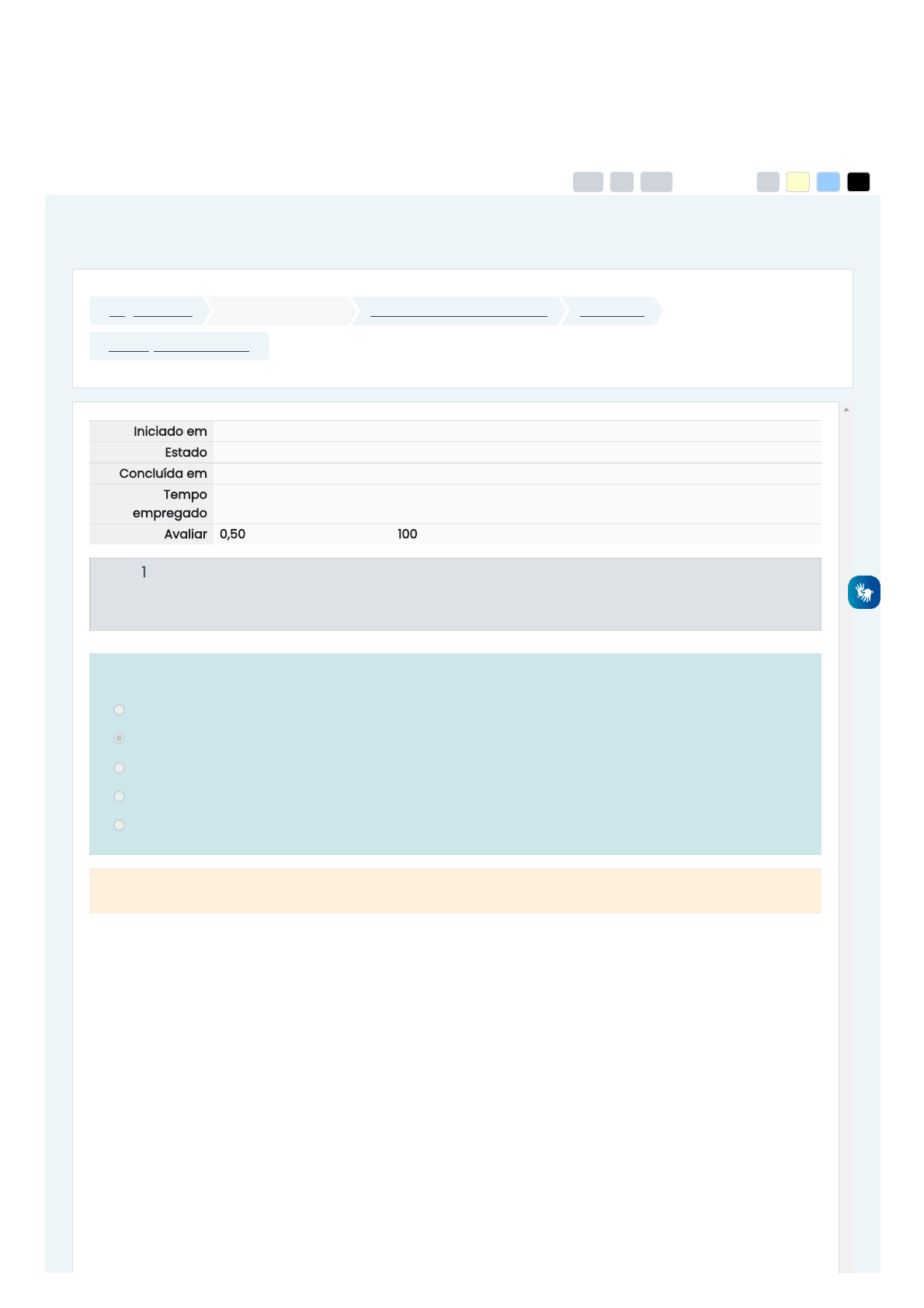 24/10/2022 22:02 Avaliação - Unidade III: Revisão da tentativa Página inicial Minhas disciplinas 2022/4 - Processos Criativos UNIDADE III Avaliação - Unidade III Iniciado em quinta, 13 out 2022, 22:24 Estado Finalizada Concluída em quinta, 13 out 2022, 22:27 Tempo empregado 3 minutos 4 segundos Avaliar 0,50 de um máximo de 0,50(100%) Questão 1 Completo Atingiu 0,05 de 0,05 Ao se perguntar sobre o público-alvo, qual acertiva não é pertinente? a. O ambiente em que o produto é consumido. b. O tipo da mensagem que deve ser comunicada ao público-alvo. c. O hábito de consumo. d. O hábito cultural. e. O perfil sócio-econômico: sexo, renda, faixa-etária. A resposta correta é: O tipo da mensagem que deve ser comunicada ao público-alvo. Tamanho da fonte A- A A+ Cor do site R A A A https://ambienteonline.uninga.br/ https://ambienteonline.uninga.br/course/view.php?id=15000 https://ambienteonline.uninga.br/course/view.php?id=15000§ion=6 https://ambienteonline.uninga.br/mod/quiz/view.php?id=426853 24/10/2022 22:02 Avaliação - Unidade III: Revisão da tentativa Questão 2 Completo Atingiu 0,05 de 0,05 Questão 3 Completo Atingiu 0,05 de 0,05 Das respostas abaixo, qual não está baseada em Bertomeu (2008): a. Descrever os pontos de acomodação dos produtos. b. Descrever a identidade do Cliente/Anunciante. c. Descrever o modo como o produto, serviço ou marca será comunido. d. Descrever o perfil do público-alvo. e. Descrever o feedback da mensagem que será criada. A resposta correta é: Descrever os pontos de acomodação dos produtos. Durante o processo criativo, na etapa do retorno ao problema, o briefing criativo pode ser usado para: a. Revisar o orçamento, com intuito de solicitar mais investimentos na ideia. b. Desenvolver um novo problema que não tenha relação com o que fora apontado pelo cliente/anunciante. c. Verificar as informações sobre o problema, com intuito de fazer uma releitura ou reinterpretação, motivados pelos insights. d. Realizar uma pesquisa sobre o público-alvo. e. Basear os critérios de avaliação do projeto final. A resposta correta é: Verificar as informações sobre o problema, com intuito de fazer uma releitura ou reinterpretação, motivados pelos insights. Tamanho da fonte A- A A+ Cor do site R A A A 24/10/2022 22:02 Avaliação - Unidade III: Revisão da tentativa Questão 4 Completo Atingiu 0,05 de 0,05 Questão 5 Completo Atingiu 0,05 de 0,05 O briefing criativo pode ser definido como aquele: a. Que traz uma solução para o problema. b. Que mostra a totalidade da empresa do cliente/anunciante. c. Que mostra os objetivos de comunicação e os valores do cliente/anunciante. d. Que traz o problema de marketing do cliente. e. Que traz os problemas do cliente/atendimento com intuito de direcionar a criação. A resposta correta é: Que traz os problemas do cliente/atendimento com intuito de direcionar a criação. O briefing criativo, para o processo criativo: a. é um documento somente quando é escrito e organizado pelo criativo. b. é um documento burocrático, para defender o criativo de problemas provocados pelo cliente/anunciante. c. é importante para estabelecer o orçamento para o projeto criativo. d. é fundamental para nortear as perguntas que devem ser feitas ao cliente/anunciante. e. é fundamental para nortear o processo de criação. A resposta correta é: é fundamental para nortear o processo de criação. Tamanho da fonte A- A A+ Cor do site R A A A 24/10/2022 22:02 Avaliação - Unidade III: Revisão da tentativa Questão 6 Completo Atingiu 0,05 de 0,05 Questão 7 Completo Atingiu 0,05 de 0,05 O problema descrito pelo cliente/anunciante, antes de ser descrito no briefing criativo, deve ser: a. Descrito conforme fora relatado pelo cliente/anunciante. b. Revisado, observando-se erros gramaticais e ortográficos e solicitando a sua assinatura por parte do cliente/anunciante. c. Analisado profundamente, buscando uma definição exata do problema. d. Analisado se o tom da comunicação foi adequadamente descrito. e. Verificado se o cliente/anunciante passou todos os dados sobre o público-alvo. A resposta correta é: Analisado profundamente, buscando uma definição exata do problema. Qual é a importância de se conhecer o que as pessoas devem saber depois de ter tido acesso ao projeto ou a algum elemento do projeto? a. Identificar em que momento do processo criativo está a solução. b. Identificar as fontes de pesquisa. c. Identificar o melhor momento para parar e ter um insight. d. identificar e julgar uma boa solução. e. Ter base para formular critérios para avaliar a solução desenvolvida. A resposta correta é: Ter base para formular critérios para avaliar a solução desenvolvida. Tamanho da fonte A- A A+ Cor do site R A A A 24/10/2022 22:02 Avaliação - Unidade III: Revisão da tentativa Questão 8 Completo Atingiu 0,05 de 0,05 Questão 9 Completo Atingiu 0,05 de 0,05 Sobre a aplicação do briefing, assinale a resposta errada: a. Não termina após a primeira reunião com o cliente/anunciante. b. Aplica-se para encontrar o problema do cliente/anunciante. c. Comumente é a aplicado por meio de reuniões. d. Evita-se pegar as informações de contato do cliente/anunciante. e. Contribui para nortear as pesquisas. A resposta correta é: Evita-se pegar as informações de contato do cliente/anunciante. Sobre os Problemas que a comunicação deve/pode/precisa resolver, a assertiva correta é: a. Necessidade de desenvolver a Comunicação Visual. b. Necessidade de obter as informações sobre o cliente/anunciante. c. Necessidade de conhecer o público-alvo. d. Necessidade de desenvolver o feedback da mensagem do cliente/anunciante. e. Necessidade de conhecer orçamento para o desenvolvimento da Comunicação Visual. A resposta correta é: Necessidade de desenvolver a Comunicação Visual. Tamanho da fonte A- A A+ Cor do site R A A A 24/10/2022 22:02 Avaliação - Unidade III: Revisão da tentativa Questão 10 Co