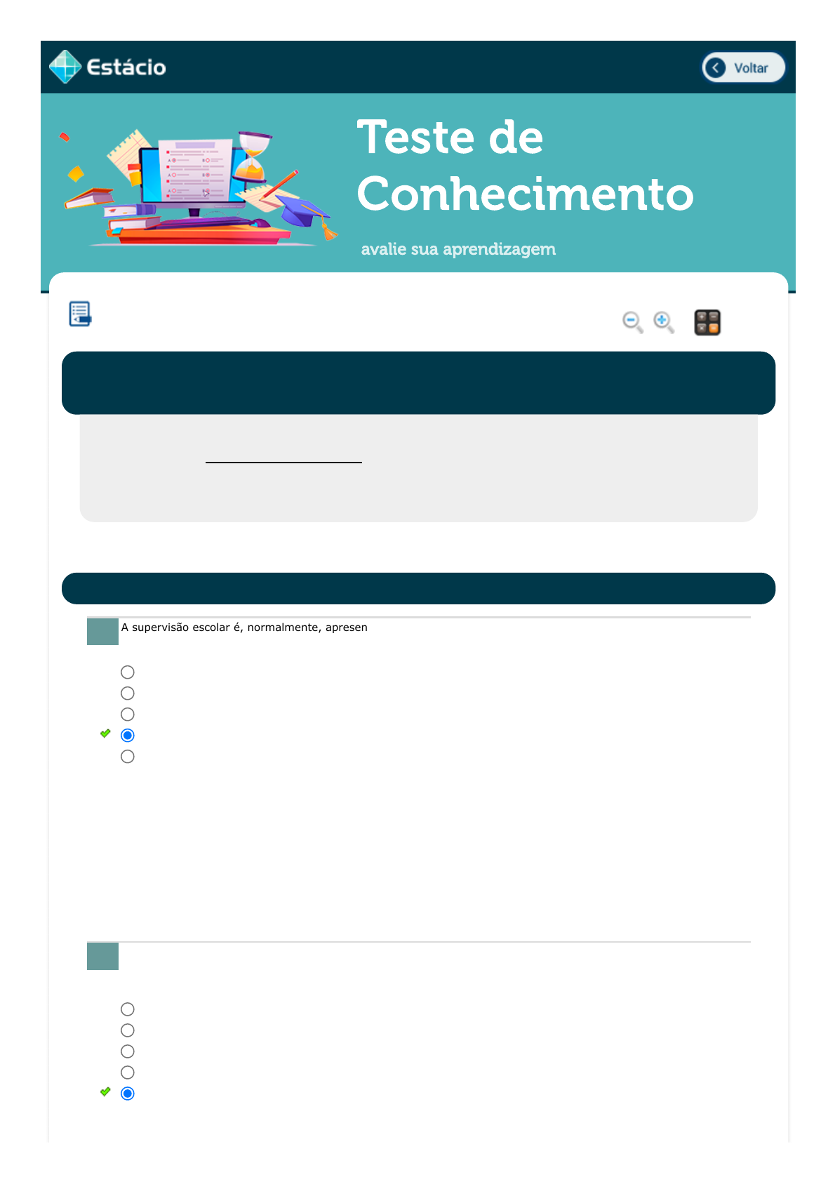 21/10/2022 12:43 Estácio: Alunos https://simulado.estacio.br/alunos/ 1/5 Teste de Conhecimento avalie sua aprendizagem A supervisão escolar é, normalmente, apresentada por meio de problemas, mas é fundamental que ela seja capaz de desenhar e propor soluções. O Supervisor Escolar, para realizar um diagnóstico, deve prioritariamente: A formação do Supervisor para a Educação Básica pode ser realizada em cursos de graduação ou de pós-graduação, desde que a Instituição de Ensino garanta nesta formação a estrutura para que ele compreenda o funcionamento da educação brasileira. Atualmente, por exemplo, não podem faltar direcionamentos relativos a: SUPERVISÃO E ORIENTAÇÃO EDUCACIONAL Lupa Calc. DGT0763_202003488275_TEMAS Aluno: CAROLINA FERREIRA PEREIRA Matr.: 202003488275 Disc.: SUPERVISÃO E ORIEN 2022.3 EAD (G) / EX Prezado (a) Aluno(a), Você fará agora seu TESTE DE CONHECIMENTO! Lembre-se que este exercício é opcional, mas não valerá ponto para sua avaliação. O mesmo será composto de questões de múltipla escolha. Após responde cada questão, você terá acesso ao gabarito comentado e/ou à explicação da mesma. Aproveite para se familiarizar com este modelo de questões que será usado na sua AV e AVS. OBJETOS DE ESTUDO, FORMAÇÃO E ATUAÇÃO 1. conversar com os pais de alunos e mostrar-lhes a escola. coletar somente dados da realidade física da escola. chamar os funcionários da escola e ouvi-los em particular. ouvir todos os segmentos da escola para definir suas necessidades. chamar os pais e responsáveis e ouvir suas queixas a respeito da disciplina. Data Resp.: 21/10/2022 10:27:41 Explicação: Quando se trabalha necessidade de criar mecanismos se discute as portas abertas, como a escola é necessariamente polifônica, composta por muitas vozes. Cabe ao supervisor buscar reconhecer que não basta sua opinião sim a perspectiva de investigar todas as possibilidades possíveis notando formas de transformar os problemas enfrentados em soluções. 2. conhecimentos específicos de gestão de pessoas, recursos humanos e gestão empresarial. matérias eletivas. atividades práticas que permitam a simulação da supervisão. instrumentos pedagógicos a serem aplicados fisicamente. a base nacional comum curricular. Data Resp.: 21/10/2022 10:34:47 javascript:voltar(); javascript:voltar(); javascript:diminui(); javascript:aumenta(); javascript:calculadora_on(); 21/10/2022 12:43 Estácio: Alunos https://simulado.estacio.br/alunos/ 2/5 De acordo com Freire, a ação pedagógica, em qualquer instância, apresenta três dimensões. Essas dimensões também estão apresentadas à supervisão. (FREITAS, A. L. de S. Pedagogia da conscientização: um legado de Paulo Freire à formação de professores. Porto Alegre: EDIPUCRS, 2011.), Quais são estas dimensões descritas por Freire? A Orientação Educacional acompanhou a evolução da Educação. Sobre as tendências educacionais destacadas por Libâneo (LIBÂNEO, J. C. Pedagogia e pedagogos, para quê? 12. ed. São Paulo: Cortez, 2018.) é correto afirmar que: (Japeri - RJ / 2013 - adaptada) Em seu artigo I, a lei prevê que a orientação educacional se destina a assistir ao educando, individualmente ou em grupo, no âmbito das escolas e sistemas escolares de nível médio e primário Explicação: A base nacional comum curricular é hoje um dos grandes desafios da educação no seu processo alimentação não é possível que na formação de professores hoje não esteja prevista por força de lei os elementos pertinentes a base nacional curricular e a suas formas de implementação daí na formação de um supervisor pedagógico ele não pode renunciar a nenhuma forma de ter efetivamente o desenvolvimento deixa o conteúdo. 3. Dimensão epistemológica, formativa e técnica. Dimensão estética, política e disciplinar. Dimensões epistemológica, política e estética Dimensões formativa, política e estética Dimensões política, estética e técnico-pedagógico. Data Resp.: 21/10/2022 10:42:01 Explicação: Para Freire, a ação pedagógica, em qualquer instância, apresenta três dimensões: epistemológica, política e estética. Essas dimensões estão presentes em todas as práticas educativas, mesmo que inconscientemente, muitas vezes, nem percebemos esses caminhos e descaminhos em nossa jornada pedagógica. Ao educar, ensinar, a prática está baseada em uma ou mais teorias, o trabalho é voltado para a manutenção do sistema ou por sua transformação, e sentimentos estão envolvidos nessa ação, sejam eles positivos ou negativos. OBJETOS DE ESTUDO, FORMAÇÃO E ATUAÇÃO 4. na Educação Crítico-social dos conteúdos a função da orientação Educacional é a promoção de meios para a construção do conhecimento. na Educação Tradicional a dificuldade de aprendizagem do aluno está relacionada à falta de didática do professor no processo de ensino. na Educação Libertadora a principal função da Orientação Educacional é levar os discentes a se perceberem como sujeitos históricos. na Educação Libertária a Orientação Educacional é entendida com um viés psicológico, cujo objetivo é o atendimento aos alunos considerados problemáticos. na Educação Construtivista o conhecimento é fruto da ação docente, a partir de práticas sociais motivadas pela Orientação Educacional. Data Resp.: 21/10/2022 10:46:48 Explicação: Gabarito: na Educação Libertadora a principal função da Orientação Educacional é levar os discentes a se perceberem como sujeitos históricos. Justificativa: Ao abordar a evolução da Educação e a Orientação Educacional nesse processo, Libâneo destaca algumas tendências educacionais correlacionando-as com as teorias críticas e não-críticas da Educação. Cada uma dessas tendências tem características próprias, assim como a Orientação Educacional desempenha uma função diferente em cada uma delas. Na Educação Tradicional o problema de 