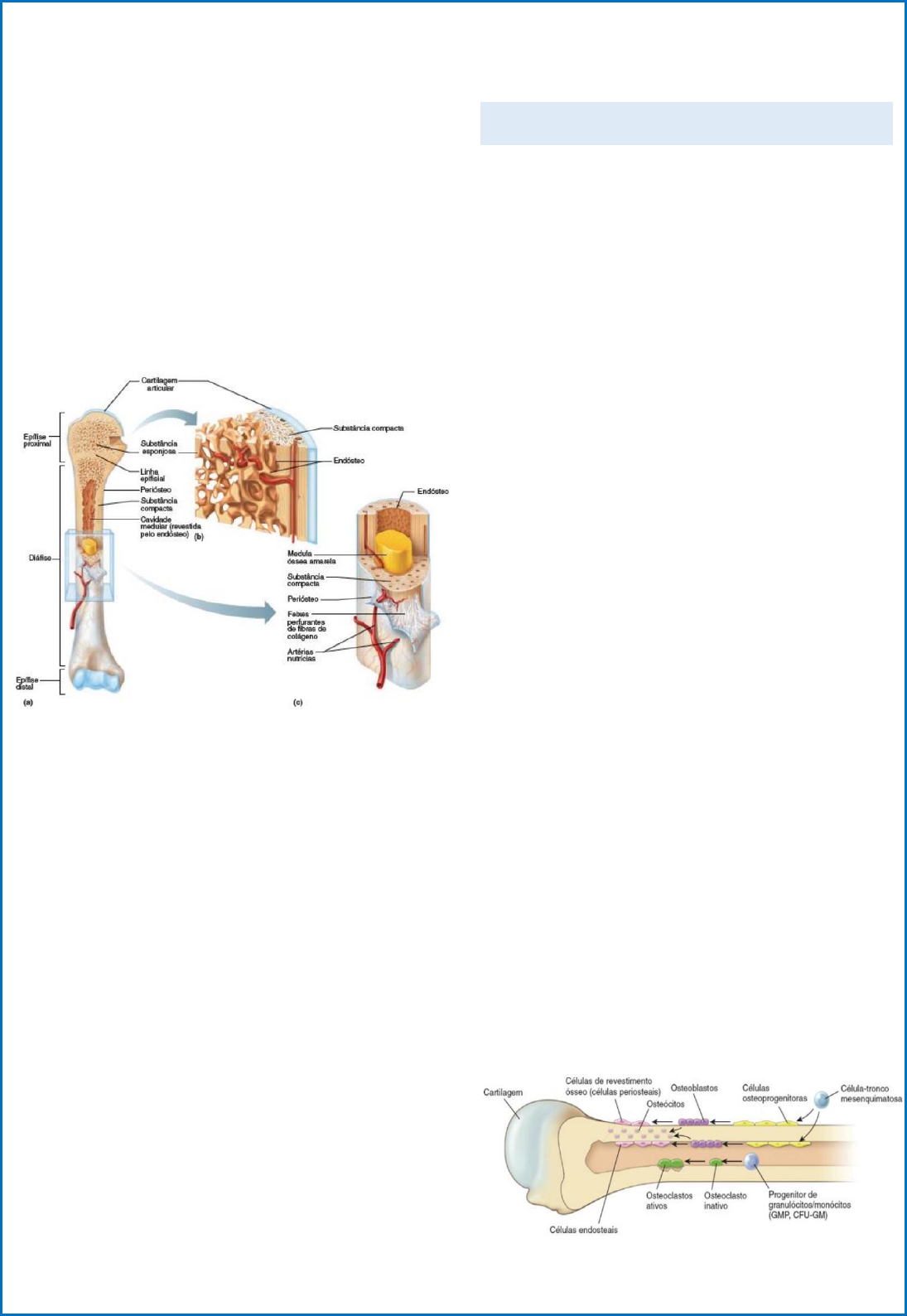 Histofuncionalidade do Tecido Ósseo → O osso como órgão é constituído de vários tecidos, a parte de tecido conjuntivo ósseo, cartilagens articulares, revestimento externo pelo periósteo (tecido conjuntivo que reveste o osso), a parte interna que é o endósteo, medula óssea, vasos sanguíneos e nervos que fazem parte do órgão osso. → O principal componente estrutural e funcional do osso é o tecido conjuntivo ósseo, que confere as principais características e estrutura ao osso → O osso é um tecido multifuncional, metabolicamente muito ativo → Tem como funções: • Reservatório para íons de cálcio (99%) e fosfato - o cálcio é armazenado na forma de hidroxiapatita, dando dureza ao osso • Sustentação e proteção para o corpo e seus órgãos • Proporciona apoio aos músculos esqueléticos • Aloja e protege a medula óssea • Sistema de alavancas → Como todo tecido, ele é constituído de dois componentes principais: células e matriz extracelular. Células do tecido ósseo → O tecido ósseo é constituído por uma população heterogênea de células, em diferentes estágios de diferenciação celular → Células mesenquimais dão origem a células osteoprogenitoras, as quais darão origem aos osteoblastos, que originam uma grande quantidade de matriz e então produz o osso. → Os osteoblastos produzem toda a grande quantidade de matriz óssea. Depois disso, eles param de produzir tanta matriz óssea e podem seguir alguns caminhos diferentes: • Ficar presos na matriz e começar processo de diferenciação, se transformando em um osteócito (célula principal do tecido ósseo secundário - adulto), esse, faz a maturação da matriz • Se diferenciar em um osteócito que fica revestindo a superfície dos ossos, se ele ficar externamente passa a ser chamado de célula de revestimento periosteal e se ficar na parte interna, é célula de revestimento esdosteal. • Essas células de revestimento são osteócitos mas não tem nesse momento capacidade de produzir matriz, está fazendo apenas uma proteção e revestimento, não faz parte diretamente do periósteo → Os osteoclastos (células grandes originadas pela fusão de vários macrófagos) fazem a degradação óssea. Ele entra em um processo chamado de remodelação osteoclástica, quando temos uma baixa de cálcio sérico ou precisamos remodelar o osso, o osteoclasto é ativado e entra em ação. • Células osteoprogenitoras e osteoblastos: Camada interna do periósteo e região do endósteo • Células periosteais e endosteais: abaixo do periósteo (na superfície do osso sem modificações) e formando o endósteo, respectivamente. • Osteócitos: interior das lacunas e canalículos. • Osteoclastos: (presente somente no osso em modificação) região do periósteo, endósteo e interior dos canais de Havers e Volkmann – processo de reabsorção óssea (regiões de superfície) → Então, só vamos ter célula de revestimento se não tiver osteoblasto ativo. Os osteócitos ficam dentro das lacunas, presos pela matriz extracelular e os osteoclastos estão presentes sempre na região mais externa da matriz, nunca dentro da matriz, sempre vai estar na mesma região que os osteoblastos estão Matriz extracelular óssea → Quem produz a matriz extracelular, em maior quantidade são os osteoblastos e em menor quantidade são os osteócitos. → A matriz que o osteócito secreta é chamada de osteóide (parte orgânica) → A parte inorgânica dá dureza ao osso (suporte e proteção) que é formada pela hidroxiapatita (fosfato de cálcio) • O fosfato vem da clivagem das proteínas não colágenas e o cálcio da corrente sanguínea (alimentação) • Essa matriz fica dura e rígida, isso é uma característica diferencial do tecido ósseo Estrutura microscópica do tecido ósseo maduro → Por volta dos quatro anos de idade, começa a substituição do tecido ósseo primário pelo secundário de acordo com a exigência, o peso, a movimentação, vamos ter um maior ou menor deposição de cálcio no tecido ósseo, quanto mais deposito de cálcio maior a dureza desse tecido ósseo → Secundário (lamelar) - tecido ósseo maduro • Matriz extracelular – cálcio em grande quantidade • Fibras de colágeno organizadas formando lamelas paralelas ou concêntricas (camadas de osteócitos e matriz) ao redor dos vasos sanguíneos → Os vasos sanguíneos estão presentes em toda parte compacta do osso, ao redor dessa região tem a formação de lamelas concêntricas, já a região onde não tem o vaso sanguíneo (tecido esponjoso) na periferia do tecido ósseo compacto, as lamelas serão depositadas paralelamente - sistemas de Havers ou Osteons Estrutura macroscópica do osso adulto → Na região do osso compacto, na região central do osso compacto, vamos ter lamelas concêntricas e na periferia do osso compacto e na região do osso esponjoso, nas espículas, vamos ter lamelas paralelas Estrutura microscópica do osso adulto com sistema de havers → O periósteo é onde chegam os vasos sanguíneos, o osso é muito vascularizado → O vaso sanguíneo penetra e a região onde forma um túnel (se for perpendicular se chama canal de Volkmann e se for um túnel que corre longitudinalmente ao comprimento do osso, vai ser chamado de canal de havers) → Passando pelo labirinto, vasos sanguíneos penetram pelo canal de Volkmann, sobem no sentido do comprimento pelo canal de havers, cruzam de novo pelo canal de Volkmann e chegam na parte interna do osso (endósteo) onde serão formadas as artérias nutrícias, outros vasos sanguíneos no meio. → Na região do osso compacto onde temos canal de havers, osteoblastos se depositam ao redor do vaso e formam lamelas concêntricas → Espaço que o osteócito ocupa: lacuna → Esse conjunto do canal de havers e seus componentes, osteócitos e as lamelas concêntricas é chamado de sistema haversiano ou ósteon • Conseguimos ver os osteócitos dentro da