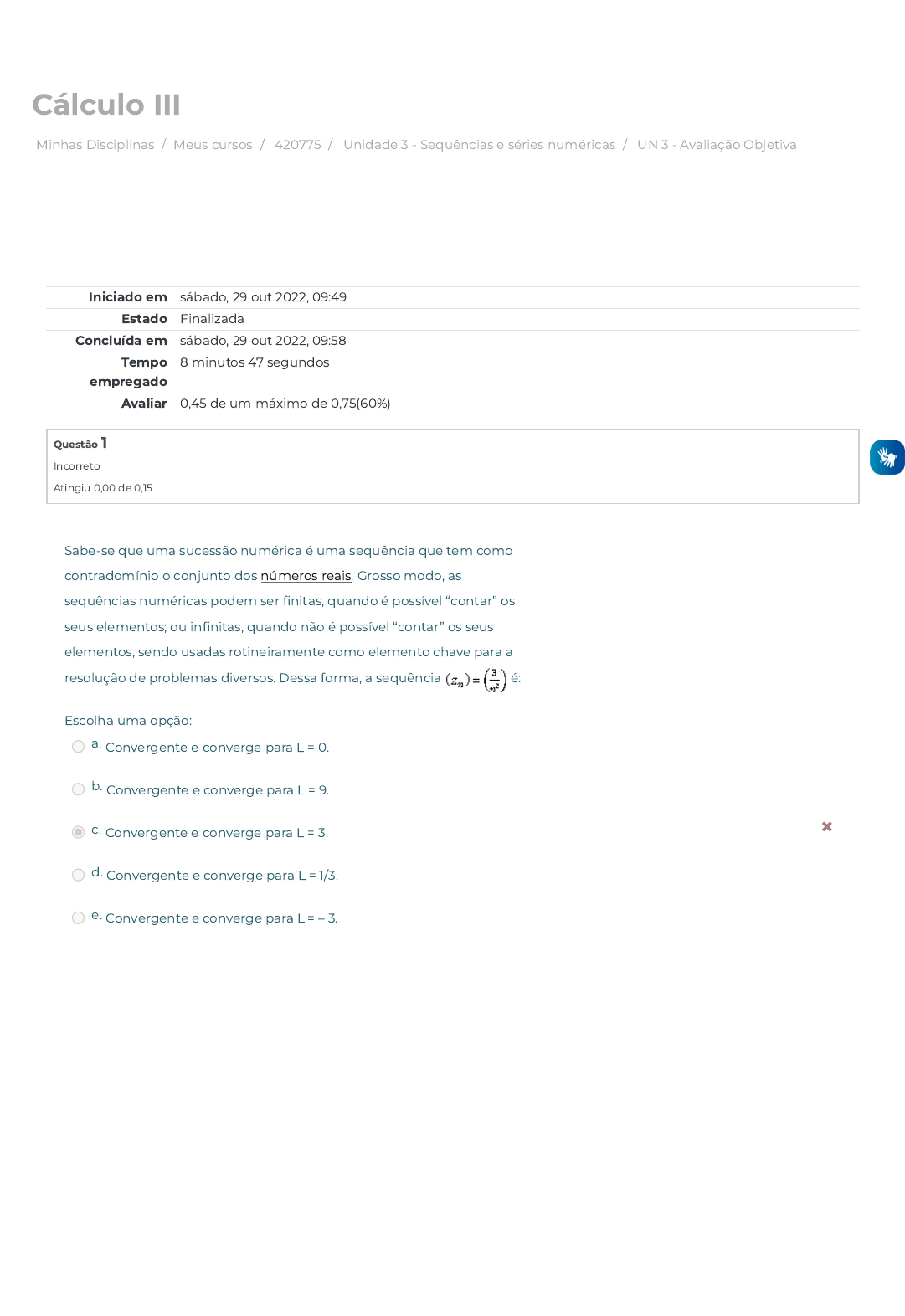 Minhas Disciplinas / Meus cursos / 420775 / Unidade 3 - Sequências e séries numéricas / UN 3 - Avaliação Objetiva Cálculo III Iniciado em sábado, 29 out 2022, 09:49 Estado Finalizada Concluída em sábado, 29 out 2022, 09:58 Tempo empregado 8 minutos 47 segundos Avaliar 0,45 de um máximo de 0,75(60%) Questão 1 Incorreto Atingiu 0,00 de 0,15 Sabe-se que uma sucessão numérica é uma sequência que tem como contradomínio o conjunto dos números reais. Grosso modo, as sequências numéricas podem ser �nitas, quando é possível “contar” os seus elementos; ou in�nitas, quando não é possível “contar” os seus elementos, sendo usadas rotineiramente como elemento chave para a resolução de problemas diversos. Dessa forma, a sequência é: Escolha uma opção: a. Convergente e converge para L = 0. b. Convergente e converge para L = 9. c. Convergente e converge para L = 3. d. Convergente e converge para L = 1/3. e. Convergente e converge para L = – 3. https://avap.multivix.edu.br/my/ https://avap.multivix.edu.br/course/view.php?id=19144 https://avap.multivix.edu.br/course/view.php?id=19144§ion=4 https://avap.multivix.edu.br/mod/quiz/view.php?id=1264855 https://www.infoescola.com/matematica/numeros-reais/ Questão 2 Correto Atingiu 0,15 de 0,15 As sequências e séries numéricas estão de forma natural no nosso cotidiano. Desde situações mais simples, quando visualizamos por exemplo a sequência dos dias da semana, bem como em situações mais complexas a exemplo de células fundamentais para modelos físicos. Neste contexto, considere as seguintes a�rmações relacionadas as séries numéricas. I) O termo geral de uma série convergente não necessariamente tem limite igual a 0. II) A série harmônica é convergente. III) Toda série convergente é necessariamente absolutamente convergente. IV) Toda série absolutamente convergente é convergente. V) A série 1 – 1 + 1 – 1 + 1 – 1 + ... é absolutamente convergente. Assim sendo, a sequência dos valores lógicos que caracterizam as a�rmações descritas anteriormente é dada por: Escolha uma opção: a. V / F / F / V / F. b. F / V / V / V / F. c. F / F / F / V / V. d. F / F / V / V / V. e. F / F / F / V / F. Questão 3 Correto Atingiu 0,15 de 0,15 Questão 4 Incorreto Atingiu 0,00 de 0,15 É sabido que as sucessões numéricas são usadas atualmente em modelagens de algoritmos, seja na computação grá�ca ou na inteligência arti�cial, na descrição de códigos quânticos ou não, simulação de sistemas gerenciais e, na formulação de modelos de cunho da Engenharia para resolução de problemas envolvendo projetos e cálculos estruturais (de�exão de vigas e oscilações). Assinale a alternativa a seguir que apresenta o limite convergente para a sequência Escolha uma opção: a. 3. b. ½. c. 4. d. 1/3. e. 2. Sabe-se que as séries numéricas são ferramentas importantes para a solução de problemas em diversos contextos físicos. Sendo assim, por exemplo, a descrição matemática de um corpo caindo verticalmente sob a in�uência da gravidade leva a uma equação que pode ser solucionado com base na teoria das séries numéricas. Nesse sentido, com relação à série numérica é correto a�rmar que: Escolha uma opção: a. A série é divergente. b. Nada se pode concluir com relação a convergência de . c. A série é convergente para L = 1/7. d. A série é convergente para L = 0. e. A série é convergente para L = 7. Questão 5 Correto Atingiu 0,15 de 0,15 Da literatura, sabe-se que a Matemática é uma ferramenta-chave para outras áreas do conhecimento, especi�camente falando com suas diversas técnicas e métodos. Particularmente falando, as sequências numéricas são utilizadas em algoritmos e modelagens relacionadas aos sistemas de controle, previsão de valores futuros de mercado, bem como em problemas de cunho estrutural. Especi�camente falando, assinale a alternativa que corresponde ao valor do limite da sequência Escolha uma opção: a. 4. b. ½. c. 3. d. – 2. e. 2. ← Conteúdo Online Seguir para... Conteúdo Online → https://avap.multivix.edu.br/mod/scorm/view.php?id=1264854&forceview=1 https://avap.multivix.edu.br/mod/scorm/view.php?id=1264856&forceview=1