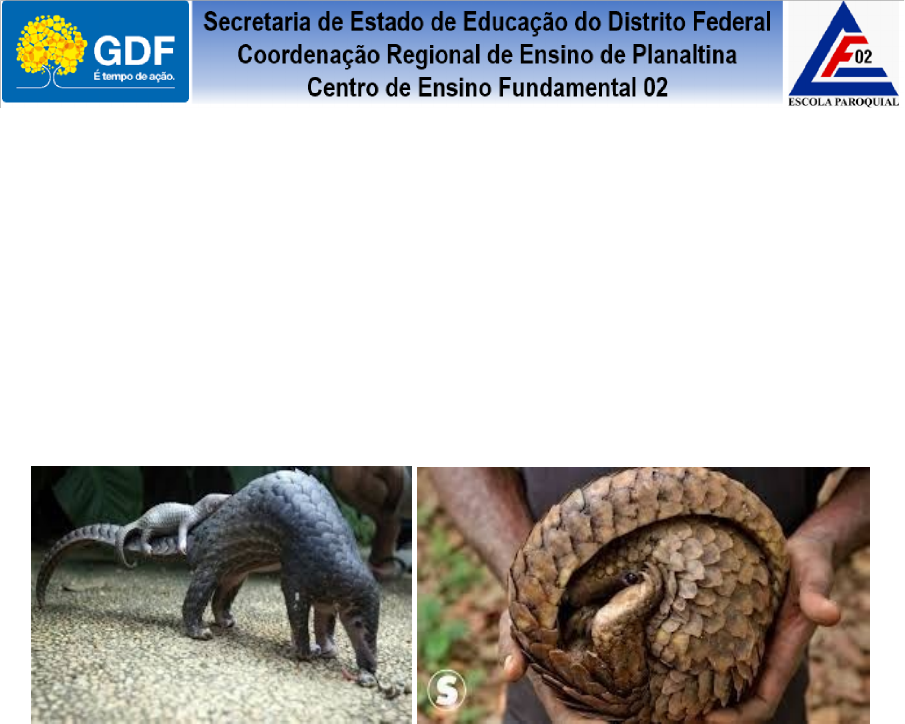 Professor: Valdinea Disciplina: ___________________________ Aluno:__Laura_de Melo Carneiro____________________________nº:_____Ano__7_____Turma:_E_____ Turno: matutino VAMOS DE INTERPRETAÇÃO DE TEXTO? Leia o texto abaixo e responda às questões de 01 a 08. Pangolim: uma fofura em grave perigo de extinção Pangolim (Manis spp.), um mamífero pertencente a uma ordem muito antiga, a Pholidota, que vive em zonas tropicais da Ásia e da África, tem um pequeno corpo escamoso, aparentemente duro e forte, mas que se enrola indefeso quando ameaçado. Essa fofura está seriamente em risco de extinção. […] Talvez esses animais sejam pouco conhecidos, mas eles são os mamíferos mais traficados no mundo. Apesar de parecerem invencíveis com suas armaduras – têm o corpo coberto de escamas compostas de queratina, sobrepostas umas às outras formando uma espécie de escudo protetor – essa sua característica física não é suficiente para afastá-los da crueldade dos caçadores. Há sete espécies diferentes representantes da família Manidae e todas elas sofrem várias ameaças especialmente de caçadores e contrabandistas. Os pangolins vivem em zonas tropicais da Ásia e da África subsaariana (China, Taiwan, norte da Índia, Nepal, Butão, Bangladesh, Myanmar). Todas as espécies são classificadas entre altamente vulneráveis e em risco de extinção. Os pangolins são muito cobiçados porque são considerados uma iguaria da culinária asiática. Mas não só por isso. Eles também são explorados pela medicina tradicional asiática, porque acredita-se que sua pele escamosa pode melhorar a função renal, o tratamento da asma e melhorar os sintomas da psoríase. Disponível em: < https://www.greenme.com.br>. (Fragmento). Questão 1 – O texto lido trata: a) da caça e do contrabando de diferentes espécies da família Manidae. b) das características do pangolim e do sério risco de sua extinção. c) dos mamíferos mais traficados no mundo. d) da presença dos pangolins na culinária e na medicina tradicional asiática. Questão 2 – Identifique os locais onde se registra a presença dos pangolins: Ásia e África subsaariana (China, Taiwan, norte da Índia, Nepal, Butão, Bangladesh, Myanmar). ___________________________________________________________ Questão 3 – Assinale a passagem que não contém uma característica física dos pangolins: a) “[…] têm um pequeno corpo escamoso, aparentemente duro e forte […]” b) “[…] têm o corpo coberto de escamas compostas de queratina […]” c) “[…] têm escamas… sobrepostas umas às outras formando uma espécie de escudo […]” d) “[…] vivem em zonas tropicais da Ásia e da África subsaariana […]” Questão 4 – Segundo o texto, por que os pangolins são tão cobiçados? ___Os pangolins são muito cobiçados porque são considerados uma iguaria da culinária asiática. Mas não só por isso. Eles também são explorados pela medicina tradicional asiática, porque acredita-se que sua pele escamosa pode melhorar a função renal, o tratamento da asma e melhorar os sintomas da psoríase. _______________________________________________________ ___________________________________________________________ Questão 5 – Há uma opinião de quem escreveu o texto em: a) “Pangolim(Manis spp.), um mamífero pertencente a uma ordem muito antiga […]” b) “Essa fofura está seriamente em risco de extinção.” c) “[…] mas eles são os mamíferos mais traficados no mundo.” d) “[…] todas elas sofrem várias ameaças especialmente de caçadores e contrabandistas.” Questão 6 – Foram empregados diferentes termos que retomam o referente “pangolins”. Sublinhe-os nas frases a seguir: a) “Talvez esses animais sejam pouco conhecidos […]” b) “[…] não é suficiente para afastá-los da crueldade dos caçadores.” c) “Eles também são explorados pela medicina tradicional asiática […]” d) “[…] que sua pele escamosa pode a função renal […]” Questão 7 – Na parte “Talvez esses animais sejam pouco conhecidos, mas eles são os , a conjunção “mas” estabelece uma relação de: a) oposição de ideias. b) comparação entre dois fatos. c) conclusão de um pensamento. d) adição de ideias. Questão 8 – No segmento “Os pangolins são muito cobiçados […]”, o advérbio em destaque exprime a ideia de: a) tempo b) lugar c) intensidade d) afirmação