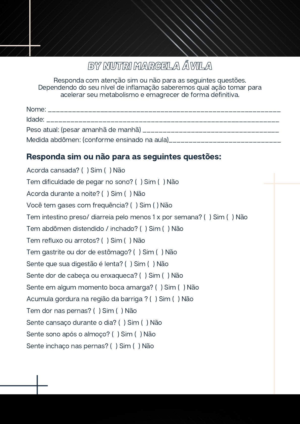 BY NUTRI MARCELA ÁVILA TESTE METABÓLICO HORMONAL Responda com atenção sim ou não para as seguintes questões. Dependendo do seu nível de inflamação saberemos qual ação tomar para acelerar seu metabolismo e emagrecer de forma definitiva. Nome: __________________________________________________________ Idade: __________________________________________________________ Peso atual: (pesar amanhã de manhã) __________________________________ Medida abdômen: (conforme ensinado na aula)____________________________ Responda sim ou não para as seguintes questões: Acorda cansada? ( ) Sim ( ) Não Tem dificuldade de pegar no sono? ( ) Sim ( ) Não Acorda durante a noite? ( ) Sim ( ) Não Você tem gases com frequência? ( ) Sim ( ) Não Tem intestino preso/ diarreia pelo menos 1 x por semana? ( ) Sim ( ) Não Tem abdômen distendido / inchado? ( ) Sim ( ) Não Tem refluxo ou arrotos? ( ) Sim ( ) Não Tem gastrite ou dor de estômago? ( ) Sim ( ) Não Sente que sua digestão é lenta? ( ) Sim ( ) Não Sente dor de cabeça ou enxaqueca? ( ) Sim ( ) Não Sente em algum momento boca amarga? ( ) Sim ( ) Não Acumula gordura na região da barriga ? ( ) Sim ( ) Não Tem dor nas pernas? ( ) Sim ( ) Não Sente cansaço durante o dia? ( ) Sim ( ) Não Sente sono após o almoço? ( ) Sim ( ) Não Sente inchaço nas pernas? ( ) Sim ( ) Não BY NUTRI MARCELA ÁVILA TESTE METABÓLICO HORMONAL Tem metabolismo lento? ( ) Sim ( ) Não Já emagreceu e voltou a engordar (efeito sanfona)? ( ) Sim ( ) Não Você já começou uma dieta e desistiu no meio do caminho? ( ) Sim ( ) Não Você tem dores musculares e ou articulares? ( ) Sim ( ) Não Você tem gordura no fígado? ( ) Sim ( ) Não Você tem pré diabetes ou diabetes? ( ) Sim ( ) Não Tem problema ácido úrico ou gota? ( ) Sim ( ) Não Tem gordura localizada? ( ) Sim ( ) Não Tem pouca gordura, mas não elimina? ( ) Sim ( ) Não Você já consome tudo saudável, porém tem dificuldade de emagrecer? ( ) Sim ( ) Não Vive de verduras legumes e carnes e ovos mas não emagrece? ( ) Sim ( ) Não Tem dificuldade de manter o peso após emagrecer? ( ) Sim ( ) Não Já fez várias dietas e não chega ao peso ideal? ( ) Sim ( ) Não Emagrece um pouco e volta a ganhar peso? ( ) Sim ( ) Não Tem retenção de líquido? ( ) Sim ( ) Não Está na menopausa? ( ) Sim ( ) Não Tem TPM? ( ) Sim ( ) Não Tem compulsão por doces ou salgados? ( ) Sim ( ) Não Tem tristeza ou Depressão? ( ) Sim ( ) Não Tem Síndrome de Ovários Policísticos? ( ) Sim ( ) Não Tem dificuldade de engravidar? ( ) Sim ( ) Não Está precisando eliminar de 5 a 30 quilos de gordura e ganhar saúde? ( ) Sim ( ) Não BY NUTRI MARCELA ÁVILA TESTE METABÓLICO HORMONAL Você tem queda de cabelo? ( ) Sim ( ) Não Sua unha é fraca ou quebradiça? ( ) Sim ( ) Não Você é mau humorada? ( ) Sim ( ) Não Você sofre com ansiedade? ( ) Sim ( ) Não Você sobre Compulsão alimentar? ( ) Sim ( ) Não Tem dificuldade de emagrecer? ( ) Sim ( ) Não Tem baixa libido (desejo sexual)? ( ) Sim ( ) Não Tem alteração triglicerídeos? ( ) Sim ( ) Não Tem alteração na Glicose? ( ) Sim ( ) Não Tem alteração no Colesterol? ( ) Sim ( ) Não Tem alteração na Pressão? ( ) Sim ( ) Não Interprete seus resultados: O respostas sim: Indivíduo saudável 1 a 3 respostas sim: Nível 1 inflamação 3 a 5 respostas sim: Nível 2 de inflamação crônica Acima de 5 respostas sim: Nível 3 de inflamação crônica
