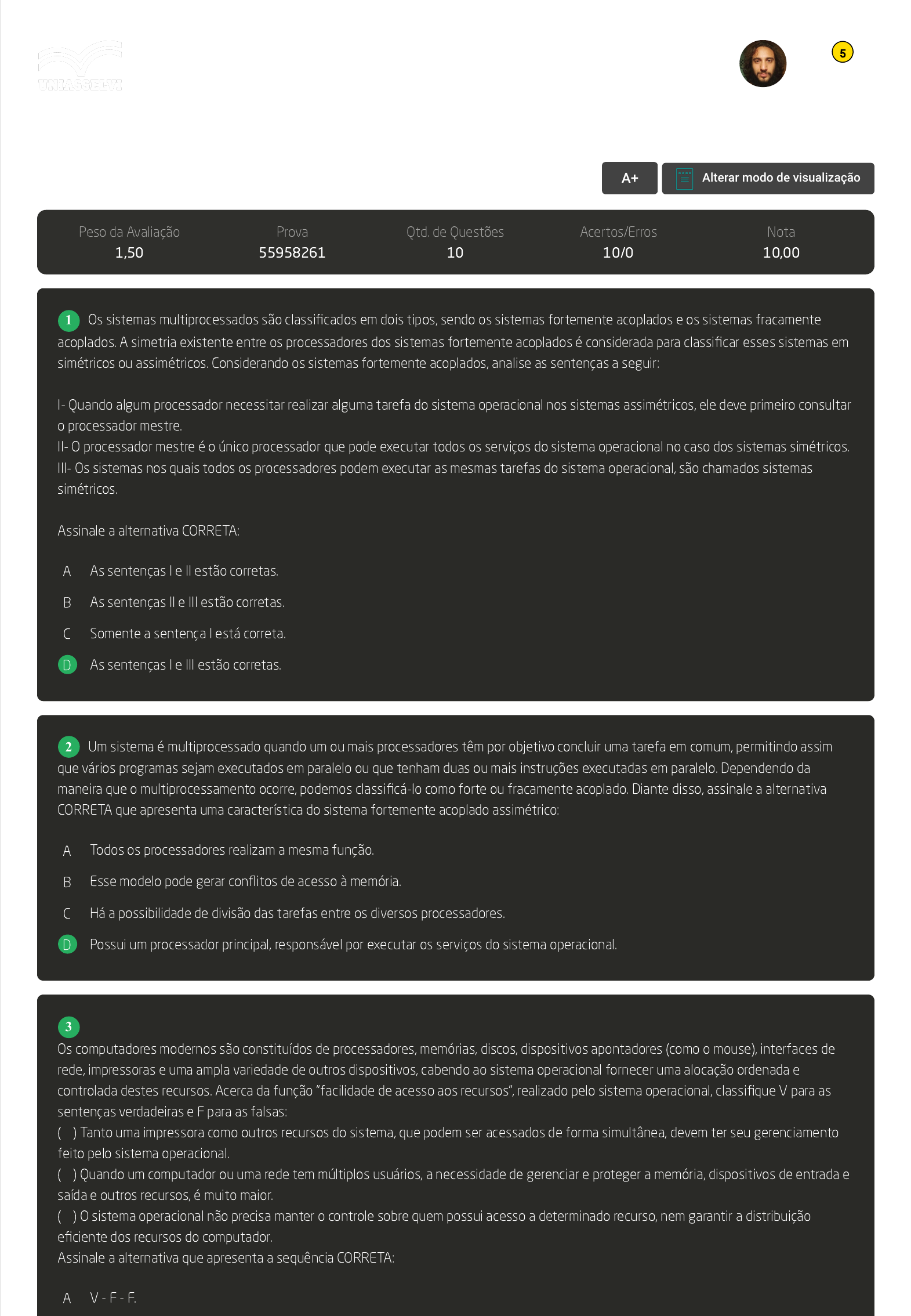 GABARITO | Avaliação I - Individual (Cod.:765737) Peso da Avaliação 1,50 Prova 55958261 Qtd. de Questões 10 Acertos/Erros 10/0 Nota 10,00 Os sistemas multiprocessados são classificados em dois tipos, sendo os sistemas fortemente acoplados e os sistemas fracamente acoplados. A simetria existente entre os processadores dos sistemas fortemente acoplados é considerada para classificar esses sistemas em simétricos ou assimétricos. Considerando os sistemas fortemente acoplados, analise as sentenças a seguir: I- Quando algum processador necessitar realizar alguma tarefa do sistema operacional nos sistemas assimétricos, ele deve primeiro consultar o processador mestre. II- O processador mestre é o único processador que pode executar todos os serviços do sistema operacional no caso dos sistemas simétricos. III- Os sistemas nos quais todos os processadores podem executar as mesmas tarefas do sistema operacional, são chamados sistemas simétricos. Assinale a alternativa CORRETA: A As sentenças I e II estão corretas. B As sentenças II e III estão corretas. C Somente a sentença I está correta. D As sentenças I e III estão corretas. Um sistema é multiprocessado quando um ou mais processadores têm por objetivo concluir uma tarefa em comum, permitindo assim que vários programas sejam executados em paralelo ou que tenham duas ou mais instruções executadas em paralelo. Dependendo da maneira que o multiprocessamento ocorre, podemos classificá-lo como forte ou fracamente acoplado. Diante disso, assinale a alternativa CORRETA que apresenta uma característica do sistema fortemente acoplado assimétrico: A Todos os processadores realizam a mesma função. B Esse modelo pode gerar conflitos de acesso à memória. C Há a possibilidade de divisão das tarefas entre os diversos processadores. D Possui um processador principal, responsável por executar os serviços do sistema operacional. Os computadores modernos são constituídos de processadores, memórias, discos, dispositivos apontadores (como o mouse), interfaces de rede, impressoras e uma ampla variedade de outros dispositivos, cabendo ao sistema operacional fornecer uma alocação ordenada e controlada destes recursos. Acerca da função "facilidade de acesso aos recursos", realizado pelo sistema operacional, classifique V para as sentenças verdadeiras e F para as falsas: ( ) Tanto uma impressora como outros recursos do sistema, que podem ser acessados de forma simultânea, devem ter seu gerenciamento feito pelo sistema operacional. ( ) Quando um computador ou uma rede tem múltiplos usuários, a necessidade de gerenciar e proteger a memória, dispositivos de entrada e saída e outros recursos, é muito maior. ( ) O sistema operacional não precisa manter o controle sobre quem possui acesso a determinado recurso, nem garantir a distribuição eficiente dos recursos do computador. Assinale a alternativa que apresenta a sequência CORRETA: A V - F - F. VOLTAR A+ Alterar modo de visualização 1 2 3 Rodrigo Inacio Lodi da Silva Análise e Desenvolvimento de Sistemas (4327797) 5 B V - F - V. C F - V - F. D V - V - F. Os computadores modernos são constituídos de processadores, memórias, discos, dispositivos apontadores, como mouse, interfaces de rede, impressoras e uma ampla variedade de outros dispositivos, cabendo ao sistema operacional fornecer uma alocação ordenada e controlada destes. Com relação à função "facilidade de acesso aos recursos", promovida pelo sistema operacional, classifique V para as sentenças verdadeiras e F para as falsas: ( ) O funcionamento de forma transparente dos dispositivos do computador somente será possível se o sistema operacional garantir que eles sejam acessados e controlados conforme regras previamente estabelecidas. ( ) Nos sistemas operacionais monousuários, nunca há necessidade de gerenciamento de recursos, já que apenas um usuário utiliza o computador por vez. ( ) Uma importante tarefa do sistema operacional é manter o controle sobre quem está usando determinado recurso, mediando conflitos de requisições entre diferentes programas e usuários. Assinale a alternativa que apresenta a sequência CORRETA: A V - V - F. B F - F - V. C F - V - F. D V - F - V. A utilização de sistemas operacionais multitarefas permite ao usuário executar vários programas de forma simultânea, exigindo, dessa forma, uma quantidade maior de memória primária. Ocorre que, muitas vezes, a memória primária é insuficiente para conter a execução de todos os processos, sendo necessário realizar a troca de processos entre a memória e o disco. Assinale a alternativa CORRETA que apresenta o conceito descrito: A Segmentação. B Swapping. C Memória virtual. D Paginação. A grande evolução do hardware, a partir da II Guerra Mundial, viabilizou o desenvolvimento de componentes eletrônicos cada vez mais rápidos e menores. Em paralelo, os computadores tiveram evolução semelhante com os sistemas operacionais. Estes últimos podem ter sua história dividida em gerações. Diante disso, classifique V para as sentenças verdadeiras e F para as falsas: ( ) A segunda geração é caracterizada pela utilização de transistores no lugar das válvulas, utilização de memórias magnéticas e pelos computadores de grande porte conhecidos por mainframes. ( ) A terceira geração é caracterizada pela capacidade de multiprogramação, onde foi viável o processador executar diversos programas em intervalos de tempo com o conceito de Time-Sharing. ( ) A quarta geração é caracterizada pelo uso de circuitos integrados ULSI e capacidade de processamento distribuído com interfaces gráficas em dispositivos móveis como celulares e tablets. ( ) A geração 2000 até o presente é caracterizada pelo desenvolvimento de circuitos integrados e pela disseminação dos microcomputadores, baseados em microprocessadores. Assinale a alternativa que apresenta a sequência CORRETA: A F - V - F - V. B V - V - F - F