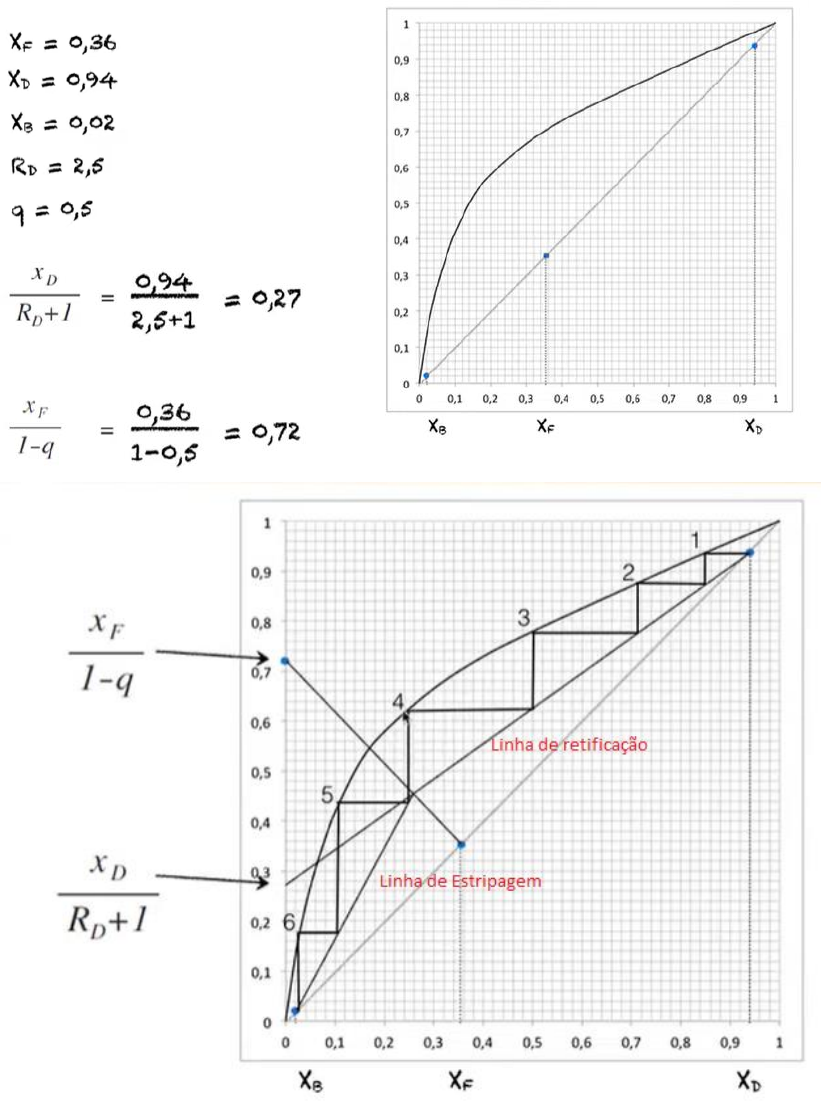 Determinar o número de estágios de uma coluna que deve destilar uma mistura metanol-água 36%. O produto deve ter o teor de metanol de 94% e no produto de fundo apenas 2%. A razão de refluxo é 2,5 e para cada mol de alimentação 0,5 mol permanece na fase líquida dentro da coluna. Prato ideal de alimentação: 4 (Pois passa pelo ponto de intesecção das linhas)