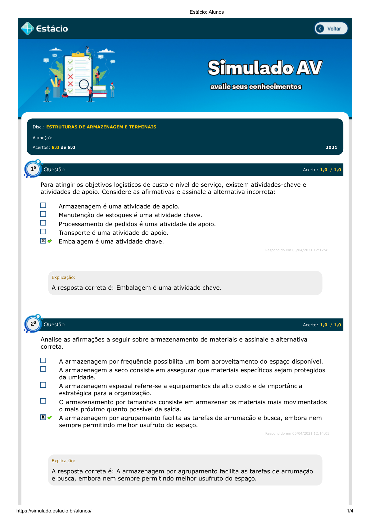 05/04/2021 Estácio: Alunos https://simulado.estacio.br/alunos/ 1/4 Disc.: ESTRUTURAS DE ARMAZENAGEM E TERMINAIS Aluno(a): ALINE DE SOUZA ALVES 202002164239 Acertos: 8,0 de 8,0 05/04/2021 Acerto: 1,0 / 1,0 Para atingir os objetivos logísticos de custo e nível de serviço, existem atividades-chave e atividades de apoio. Considere as afirmativas e assinale a alternativa incorreta: Armazenagem é uma atividade de apoio. Manutenção de estoques é uma atividade chave. Processamento de pedidos é uma atividade de apoio. Transporte é uma atividade de apoio. Embalagem é uma atividade chave. Respondido em 05/04/2021 12:12:45 Explicação: A resposta correta é: Embalagem é uma atividade chave. Acerto: 1,0 / 1,0 Analise as afirmações a seguir sobre armazenamento de materiais e assinale a alternativa correta. A armazenagem por frequência possibilita um bom aproveitamento do espaço disponível. A armazenagem a seco consiste em assegurar que materiais específicos sejam protegidos da umidade. A armazenagem especial refere-se a equipamentos de alto custo e de importância estratégica para a organização. O armazenamento por tamanhos consiste em armazenar os materiais mais movimentados o mais próximo quanto possível da saída. A armazenagem por agrupamento facilita as tarefas de arrumação e busca, embora nem sempre permitindo melhor usufruto do espaço. Respondido em 05/04/2021 12:14:03 Explicação: A resposta correta é: A armazenagem por agrupamento facilita as tarefas de arrumação e busca, embora nem sempre permitindo melhor usufruto do espaço. Questão 1 a Questão 2 a 05/04/2021 Estácio: Alunos https://simulado.estacio.br/alunos/ 2/4 Acerto: 1,0 / 1,0 Analise a afirmativa a seguir e marque a opção a qual a mesma se refere. "Refere-se à administração do espaço necessário para manter estoques. Envolve problemas como localização, dimensionamento de área, arranjo físico, recuperação do estoque, projeto de docas ou baias de atracação e configuração do armazém". qualidade total. pessoas. marketing integrado. armazenagem. melhoria contínua. Respondido em 05/04/2021 12:15:24 Explicação: A resposta correta é: armazenagem. Acerto: 1,0 / 1,0 A armazenagem é amplamente utilizada pela indústria. Neste setor seu papel principal é atender as necessidades de produção. Como os sistemas de armazenagem desempenham esta função? Garantindo uma redução nos custos de transporte e manuseio. Garantindo que o consumidor final tenha à sua disposição uma maior variedade de produtos a qualquer tempo. Permitindo o acesso a materiais com menores preços, contribuindo assim para a lucratividade do negócio. Permitindo a manutenção de estoques de matéria-prima e componentes utilizados na produção. Assegurando, assim, que o processo produtivo não seja interrompido pela falta de materiais. Facilitando o transporte de diferentes locais, resultando assim, em mais agilidade nos processos de entrega. Respondido em 05/04/2021 12:16:26 Explicação: A resposta correta é: Permitindo a manutenção de estoques de matéria-prima e componentes utilizados na produção. Assegurando, assim, que o processo produtivo não seja interrompido pela falta de materiais. Acerto: 1,0 / 1,0 "A armazenagem de mercadorias, prevendo o seu uso futuro, exige investimento por parte da organização. O ideal seria a perfeita sincronização entre _______________ e _______________, de maneira a tornar a manutenção de estoques desnecessária." Assinale a alternativa que completa correta e sequencialmente a afirmativa anterior. a oferta / a demanda o serviço / o preço o preço / a segurança a produção / o serviço a produção / a segurança Respondido em 05/04/2021 12:16:41 Questão 3 a Questão 4 a Questão 5 a 05/04/2021 Estácio: Alunos https://simulado.estacio.br/alunos/ 3/4 Explicação: A resposta correta é: a oferta / a demanda Acerto: 1,0 / 1,0 Armazéns que trabalham com produtos de baixa rotatividade deverão ter atenção ao tipo de layout a ser utilizado. Marque a alternativa que mais se adequa às necessidades desse tipo de produto: Para este tipo de produto as atividades de manuseio são onerosas, devido à necessidade de grande movimentação. Os pontos de armazenagem deverão ser largos e com grande profundidade, permitindo grandes pilhas de produtos. Os corredores deverão ser largos para permitir a movimentação rápida dos produtos. Deverão ser retirados todos os empecilhos à movimentação de carga, uma vez que essa deverá ser desempenhada de forma ágil e frequente. Os locais de armazenagem deverão ter baixa altura e pouca profundidade. Respondido em 05/04/2021 12:17:07 Explicação: A resposta correta é: Os pontos de armazenagem deverão ser largos e com grande profundidade, permitindo grandes pilhas de produtos. Acerto: 1,0 / 1,0 Quanto à acostagem dos veículos nos armazéns, o posicionamento diagonal à plataforma (45 graus) requer que: Dificulta a saída dos veículos uma vez que estes precisam efetuar manobras em locais com espaço restrito. A faixa de descarga deverá ter dimensões inferiores ao posicionamento a 90 graus. O espaço de manobra para os veículos deverá ser menor uma vez que estes já se encontram em posição favorável para a saída. A área de acostagem dos veículos tenha as mesmas dimensões do posicionamento a 90 graus A área de acumulação de carga deverá possuir capacidade superior ao posicionamento a 90 graus. Respondido em 05/04/2021 12:21:00 Explicação: A resposta correta é: O espaço de manobra para os veículos deverá ser menor uma vez que estes já se encontram em posição favorável para a saída. Acerto: 1,0 / 1,0 No armazém na qual se estocam produtos e maquinários pesados e de grande porte, deve-se utilizar prioritariamente o layout estacionário para um melhor aproveitamento do espaço disponível. Escolha a justificativa que mais se adequa a esta afirmação: Questão 6 a Questão 7 a Questão 8 a 05/04/2021 Está