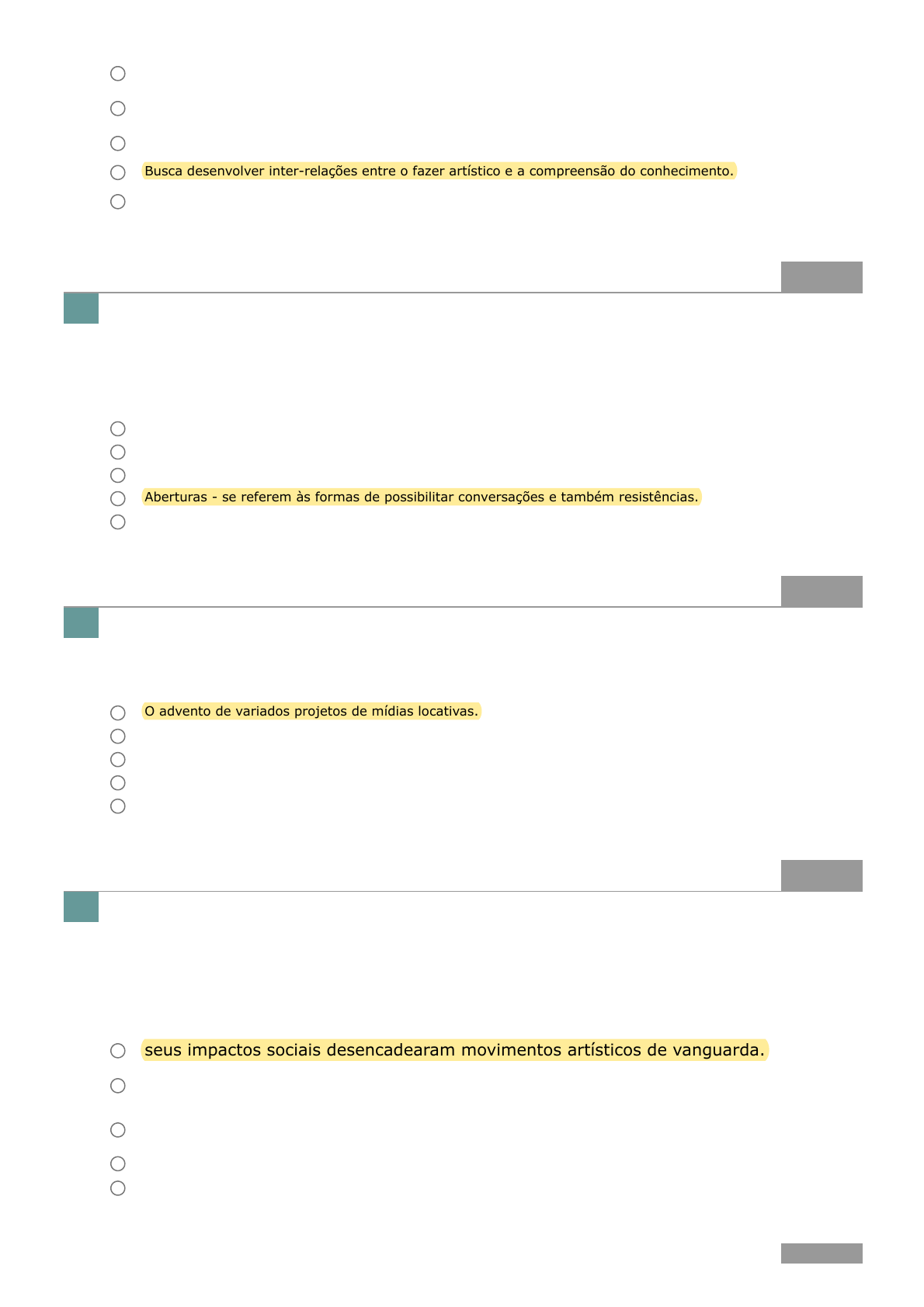 04/11/22, 12:40 Estácio: Alunos https://simulado.estacio.br/alunos/ 5/6 1 ponto A pesquisa a/r/tográfica privilegia a forma artística imagética, promovendo um contato híbrido que, em seu corpo teórico, é chamado de mestiçagem. Ainda sobre a artografia, Springgay (2008, p. 38) estabelece seis conceitos de reflexão: a contiguidade, o questionamento vivo, a metáfora e metonímia, as aberturas, as reverberações e o excesso. Considerando o enunciado, assinale a alternativa que apresenta a correta associação entre conceito de reflexão e sua respectiva definição: (Ref.: 202116605537) 1 ponto Com o surgimento dos aparelhos portáteis, dispositivos móveis sem fio, como os smartphones, a informação sonora, visual e verbal começou a circular por todos os cantos, espalhando-se perto do corpo e distribuindo-se pelo espaço físico. O surgimento de dispositivos digitais móveis, como o smartphone, permitiu: (Ref.: 202117301976) 1 ponto Via de regra, admite-se que no período em torno de 1760 ocorreu, na Inglaterra, a irrupção da chamada Revolução Industrial, quando a convergência de condições políticas favoráveis, de recursos naturais disponíveis e de fatores sociais específicos impulsionaram o desenvolvimento das atividades comerciais do país. Sobre a Revolução Industrial, podemos afirmar que: (Ref.: 202115177712) 1 ponto É um artista especializado em linguagens literárias que busca transmitir seu conhecimento também de maneira imagética, performática. É um cientista que busca partilhar seu conhecimento através de imagens que corroboram com o saber tradicional. Assemelha-se à figura dos tradutores interculturais, e busca criar espaço para o diálogo entre diferentes vivências culturais e cosmológicas. Busca desenvolver inter-relações entre o fazer artístico e a compreensão do conhecimento. É um artista que se dedica às representações cartográficas, priorizando a demonstração dos diferentes contextos socioculturais. 6. Questionamento vivo - constrói o significado através de conexões criativas. Reverberações - são as identidades integradas do artista, professor e pesquisador. Contiguidade - trata da provocação de novos sentidos e significados entrelaçados. Aberturas - se referem às formas de possibilitar conversações e também resistências. Metáfora e metonímia - relações entre coisas que produzem dados qualitativos. 7. O advento de variados projetos de mídias locativas. O apagamento ou pouca importância do papel que os artistas exercem nas mudanças a partir das mídias. O confinamento da informação sonora, visual e verbal aos espaços institucionais. A impossibilidade de se romper com a uniformização dos projetos e traços das artes digitais. O desaparecimento da arte ligada ao contexto em que é gerada e em que se regenera. 8. seus impactos sociais desencadearam movimentos artísticos de vanguarda. não teve impacto sobre a arte, pois se restringiu às mudanças nas atividades comerciais. teve como principal consequência o envolvimento da burguesia nas causas políticas da classe proletária. teve seu início marcado pela Primeira Guerra Mundial. foi um movimento artístico que se traduziu inicialmente pela arte do ferro.