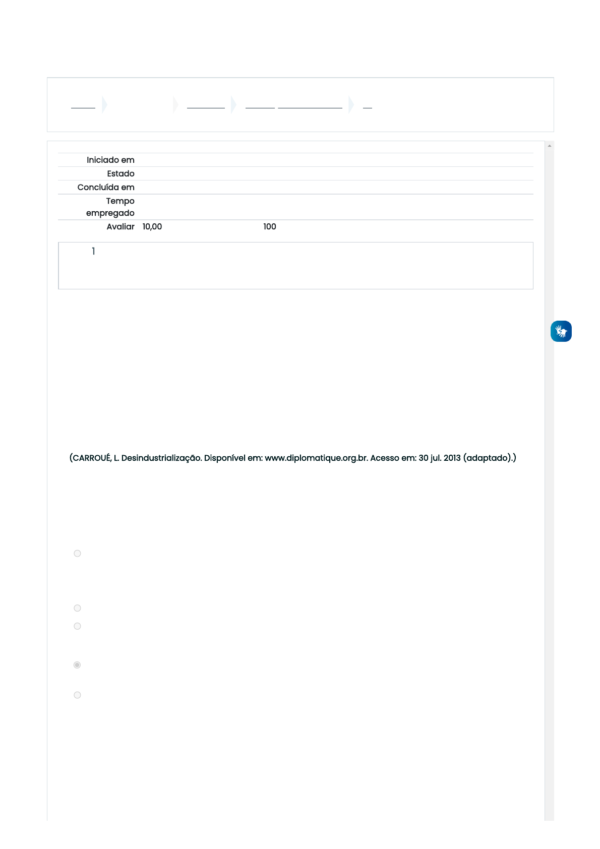 06/11/2022 10:49 T2: Revisão da tentativa https://ead.universo.edu.br/mod/quiz/review.php?attempt=1762718&cmid=430608 1/10 Painel Meus cursos N20722N1 AVALIAÇÃO A DISTÂNCIA T2 Iniciado em sábado, 5 nov 2022, 20:41 Estado Finalizada Concluída em sábado, 5 nov 2022, 20:45 Tempo empregado 4 minutos 33 segundos Avaliar 10,00 de um máximo de 10,00(100%) Questão 1 Correto Atingiu 1,00 de 1,00 A geografia mundial da inovação sofreu uma reviravolta que mobiliza fatores humanos, financeiros e tecnológicos. Esforço humano: com 1,15 milhão de pesquisadores, a China dispõe de um potencial equivalente a 82% da capacidade norte-americana e 79% da europeia; segundo a National Science Foundation norte-americana, o país deverá concentrar 30% de todos os pesquisadores do mundo até 2025. Esforço financeiro: em 2009, pela primeira vez, a China apresentou um orçamento para pesquisa que a colocou em segundo lugar no mundo - ainda bastante longe dos Estados Unidos, mas à frente do Japão. Esforço tecnológico: em 2011, o país se tornou o primeiro depositante mundial de patentes, graças a uma estratégia nacional que visa passar do Made in China (produzido na China) para o Designedin China (projetado na China). (CARROUÉ, L. Desindustrialização. Disponível em: www.diplomatique.org.br. Acesso em: 30 jul. 2013 (adaptado).) O texto apresenta um novo fator a ser considerado para refletir sobre o papel produtivo entre os países, representado pela Escolha uma opção: a. Transnacionalização do capital industrial, que eleva os lucros em escala planetária. b. Ampliação da capacidade da indústria de base, que coopera para diversificar os níveis produtivos. c. Exploração da mão de obra barata, que atrai fluxo de investimentos industriais para os países. d. Aplicação da ciência e tecnologia no desenvolvimento produtivo, que aumenta o potencial inventivo. e. Inserção de pesquisas aplicadas ao setor financeiro, que incentiva a livre concorrência. Sua resposta está correta. A resposta correta é: Aplicação da ciência e tecnologia no desenvolvimento produtivo, que aumenta o potencial inventivo. https://ead.universo.edu.br/my/ https://ead.universo.edu.br/course/view.php?id=6756 https://ead.universo.edu.br/course/view.php?id=6756#section-7 https://ead.universo.edu.br/mod/quiz/view.php?id=430608 06/11/2022 10:49 T2: Revisão da tentativa https://ead.universo.edu.br/mod/quiz/review.php?attempt=1762718&cmid=430608 2/10 Questão 2 Correto Atingiu 1,00 de 1,00 Estima-se que no Brasil mais de 20% da população tenha algum tipo de dificuldade de locomoção, seja por deficiência física, motora, sensorial ou mesmo por uma condição específica transitória. Para que essa parcela da população exerça plenamente o seu direito constitucional de ir e vir, os sistemas de transporte têm de apresentar características adequadas de acessibilidade, dentro dos conceitos do desenho universal. (IPEA. Políticas de melhoria das condições de acessibilidade do transporte urbano no Brasil. Rio de Janeiro: Ipea, 2015.) No meio urbano, o atendimento da proposta de inclusão social apresentada no texto demanda um conjunto de intervenções técnicas que promovam o(a) Escolha uma opção: a. alargamento da malha de rodovias. b. monitoramento de fluxos populacionais c. expansão de sistemas de comunicação d. democratização do espaço público. e. ocupação de áreas periféricas Sua resposta está correta. A resposta correta é: democratização do espaço público. 06/11/2022 10:49 T2: Revisão da tentativa https://ead.universo.edu.br/mod/quiz/review.php?attempt=1762718&cmid=430608 3/10 Questão 3 Correto Atingiu 1,00 de 1,00 A globalização é, de certa forma, o ápice do processo de internacionalização do mundo capitalista. [...] No fim do século XX e graças aos avanços da ciência, produziu-se um sistema de técnicas presidido pelas técnicas da informação, que passaram a exercer um papel de elo entre as demais, unindo-as e assegurando ao novo sistema técnico uma presença planetária. Só que a globalização não é apenas a existência desse novo sistema de técnicas. Ela é também o resultado das ações que asseguram a emergência de um mercado dito global, responsável pelo essencial dos processos políticos atualmente eficazes. ” SANTOS, Milton. Por uma outra globalização: do pensamento único à consciência universal. Rio de Janeiro: Record, 2000, p. 23-24. Considerando o enunciado anterior, sobre o processo de globalização na sociedade contemporânea, assinale a alternativa correta. Escolha uma opção: a. A globalização é um processo exclusivamente baseado no desenvolvimento das novas técnicas de informação e sua origem está diretamente relacionada com a difusão e universalização do uso da internet, que se deu a partir do final da década de 1990. b. Atualmente, as relações econômicas mundiais, compreendendo a dinâmica dos meios de produção, das forças produtivas, da tecnologia, da divisão internacional do trabalho e do mercado mundial, são amplamente influenciadas pelas exigências das empresas, corporações ou conglomerados multinacionais. c. Sobre as ações que asseguram a emergência do mercado global, o autor está se referindo à doutrina econômica neoliberal que, entre outros princípios, defende o fortalecimento do Estado e a intervenção estatal como reguladora direta dos mercados – industrial, comercial e financeiro d. As estratégias protecionistas tomadas pelos governos em todo o mundo, dificultando a entrada de produtos estrangeiros em seus mercados nacionais, são consideradas como características marcantes do processo de globalização. e. Entre as características próprias da globalização temos a alteração profunda na divisão internacional do trabalho, em que a distribuição das funções produtivas tende a se concentrar cada vez mais em poucos países, como é o caso dos Estados Unidos e do Japão. Sua resposta est