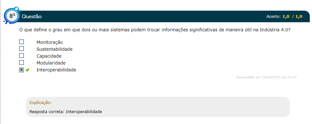 QuestãoAcerto 1,0 1,0 O que define o grau em que dois ou mais sistemas podem trocar informações significativas de maneira útil na Indústria 4.0? Monitoração Sustentabilidade