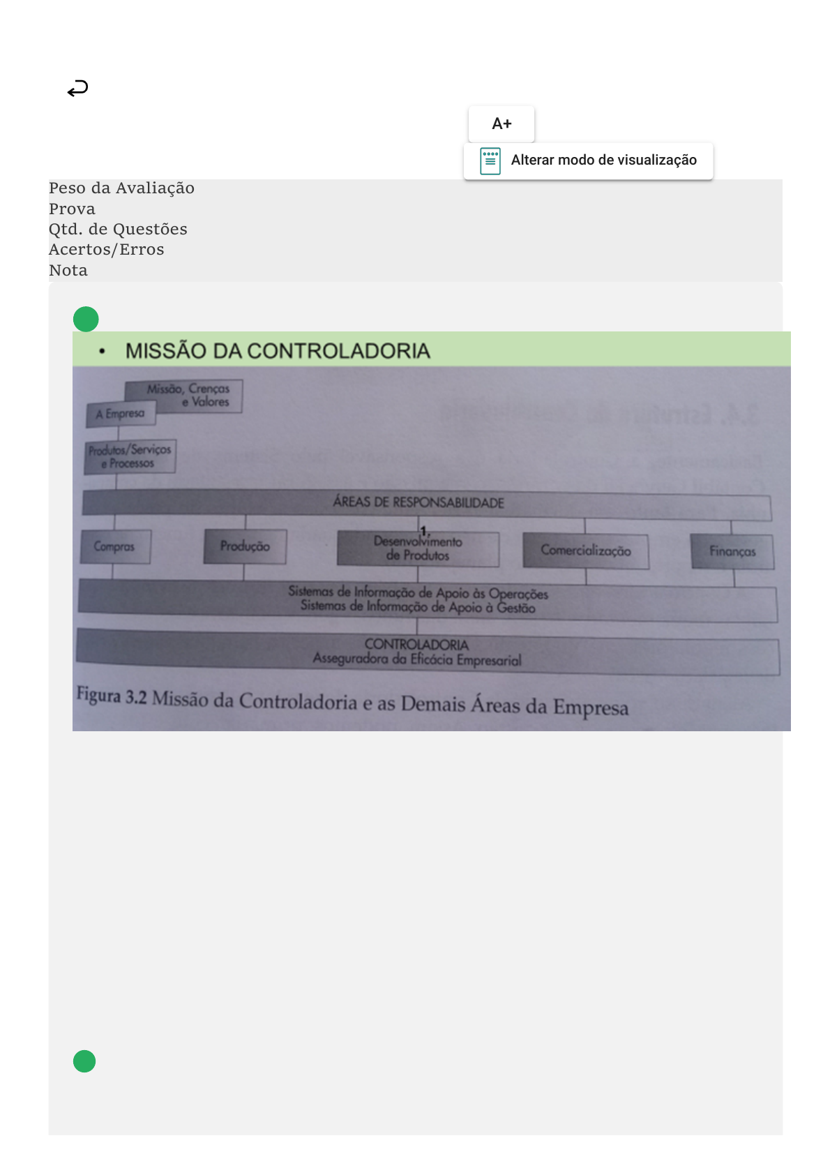 06/11/2022 22:04 Avaliação I - Individual about:blank 1/5 Prova Impressa GABARITO | Avaliação I - Individual (Cod.:766649) Peso da Avaliação 1,50 Prova 56744756 Qtd. de Questões 10 Acertos/Erros 10/0 Nota 10,00 FONTE: O autor (2021) A figura demonstra a missão que a controladoria possui dentro de uma organização, onde ela é a asseguradora da eficácia empresarial. Sobre o exposto, analise as sentenças a seguir: I- Sendo a controladoria a asseguradora da eficácia empresarial, e para atingir esse objetivo, todas a informações devem medir se os processos estão sendo eficientes, e com isso gerar feedback e ações para isso. II- A controladoria é responsável pelas informações sistêmicas que apoiam o processo de gestão. III- É o papel da controladoria assegurar quais serão as estratégias futuras da empresa. Assinale a alternativa CORRETA: A As sentenças II e III estão corretas. B As sentenças I e II estão corretas. C Somente a sentença II está correta. VOLTAR A+ Alterar modo de visualização 1 06/11/2022 22:04 Avaliação I - Individual about:blank 2/5 D As sentenças I e III estão corretas. Borinelli (2006) criou Estrutura Conceitual Básica de Controladoria (ECBC), dividindo-a em três perspectivas, assim denominadas: (i) perspectiva 1: aspectos conceituais; (ii) perspectiva 2: aspectos procedimentais e (iii) perspectiva 3: aspectos organizacionais. Assinale a alternativa CORRETA sobre o conceito de perspectiva dos aspectos procedimentais: A A controladoria e qual o seu objeto de estudo, em que área do conhecimento humano está inserida e suas ramificações e subdivisões, que são incorporadas ou tomam forma nas organizações. B Referem-se a abordagens das atividades e funções que são reconhecidas como as de controladoria, além dos artefatos ou instrumentos utilizados na execução das suas atividades. C Considera então em relação à área de controladoria a sua missão, objetivos, posição na estrutura organizacional e forma de organização interna. D Os aspectos da controladoria enquanto órgão formal, ou seja, as atividades e funções exercidas por área de controladoria formalmente constituída, dentro da estrutura organizacional. Fernandes (2010) afirma que a contabilidade financeira assumiu um papel regulatório voltado aos usuários externos, enquanto a contabilidade gerencial assumiu papal de gestão. Sobre para que essa contabilidade era voltada, assinale a alternativa CORRETA: FONTE: FERNANDES, L. Contabilidade gerencial. Indaial: Grupo UNIASSELVI, 2010. A Usuários internos, funcionário e administradores. B Mercado de capitais. C Usuários internos, bancos e sindicatos. D Agências reguladoras e governo. Compreende as atividades relativas ao desenvolvimento da contabilidade societária (ou financeira), dentre elas: gerenciar as atividades de contabilidade, implementar e manter todos os registros contábeis (processamento contábil), elaborar as demonstrações contábeis, atender aos agentes de mercado. Sobre a que se refere o conceito, assinale a alternativa CORRETA: A Função de custos. 2 3 4 06/11/2022 22:04 Avaliação I - Individual about:blank 3/5 B Função contábil. C Função tributária. D Função gerencial - estratégica. Assim como qualquer outra área organizacional, a controladoria deve ter sua missão, caso contrário não haveria sentido em sua existência na empresa. Acerca do conceito e da missão de controladoria, assinale a alternativa INCORRETA: A A controladoria presta contribuições importantes ao progresso organizacional, pois tem como missão a identificação dos culpados pelo insucesso da organização, das dificuldades existentes no ambiente operacional, dos responsáveis por roubos e desperdícios, além de efetuar a contratação e demissão de todos os funcionários/servidores. B A controladoria é um segmento da contabilidade ou da administração, podendo ser dividida em controladoria administrativa e controladoria contábil, mas, na prática profissional, ambas costumam ficar sob a égide de um único gestor, chamado de controller ou controlador. É uma área de staff, ou seja, de assessoria e consultoria. C É na gestão de situações estratégicas da organização que está a controladoria, cuja missão é otimizar o processo decisório garantindo informações adequadas aos gestores em busca de uma eficácia gerencial, assegurando a continuidade do negócio da empresa. D Nos dias atuais é imprescindível para uma grande organização um serviço contínuo da controladoria, pois é o setor que detém todas as informações gerenciais da instituição. Planejando, organizando, controlando e dirigindo todos os risco e custos, de forma a maximizar o resultado para garantir o sucesso da mesma. Dentre as qualificações desejáveis para que um controller possa realizar suas atividades, talvez a proatividade fosse a mais importante, pois um controller sempre deve antever situações possíveis com relação ao ambiente controlado, minimizando as incertezas. Entretanto, várias qualificações podem ser percebidas e determinantes como perfil de um controller para executar suas atividades com excelência, como a perspicácia, iniciativa, comunicativo, capacidade analítica, proatividade, agilidade, persistência, prestativo, imparcialidade, convincente e humildade. Sobre a agilidade, assinale a alternativa CORRETA: 5 6 06/11/2022 22:04 Avaliação I - Individual about:blank 4/5 A Insistir na análise e estudo de determinados problemas, mesmo que os executivos das áreas envolvidas não estejam dando a devida atenção para os fatos reportados pela controladoria. O controller não deve forçar uma tomada de decisão, porém poderá conseguir a correta conscientização dos responsáveis, ao manter o assunto presente, até que a decisão seja de fato tomada. B Ser imparcial e justo em suas críticas e comentários, ao desempenhar as funções de controle e avaliação do desempenho dos demais departa