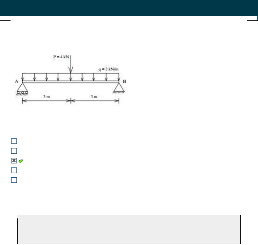 1a Questão Acerto: 1,0 / 1,0 Considere a viga simplesmente apoiada da figura, submetida a uma carga uniformemente distribuída ao longo do vão de 2 kN/m e a uma carga concentrada de 4 kN no meio do vão. Para o comprimento da viga de 6 m, o momento de fletor máximo, em kN.m, é 6 12 15 9 24 Respondido em 07/11/2022 17:40:22 Explicação: A resposta correta é: 15