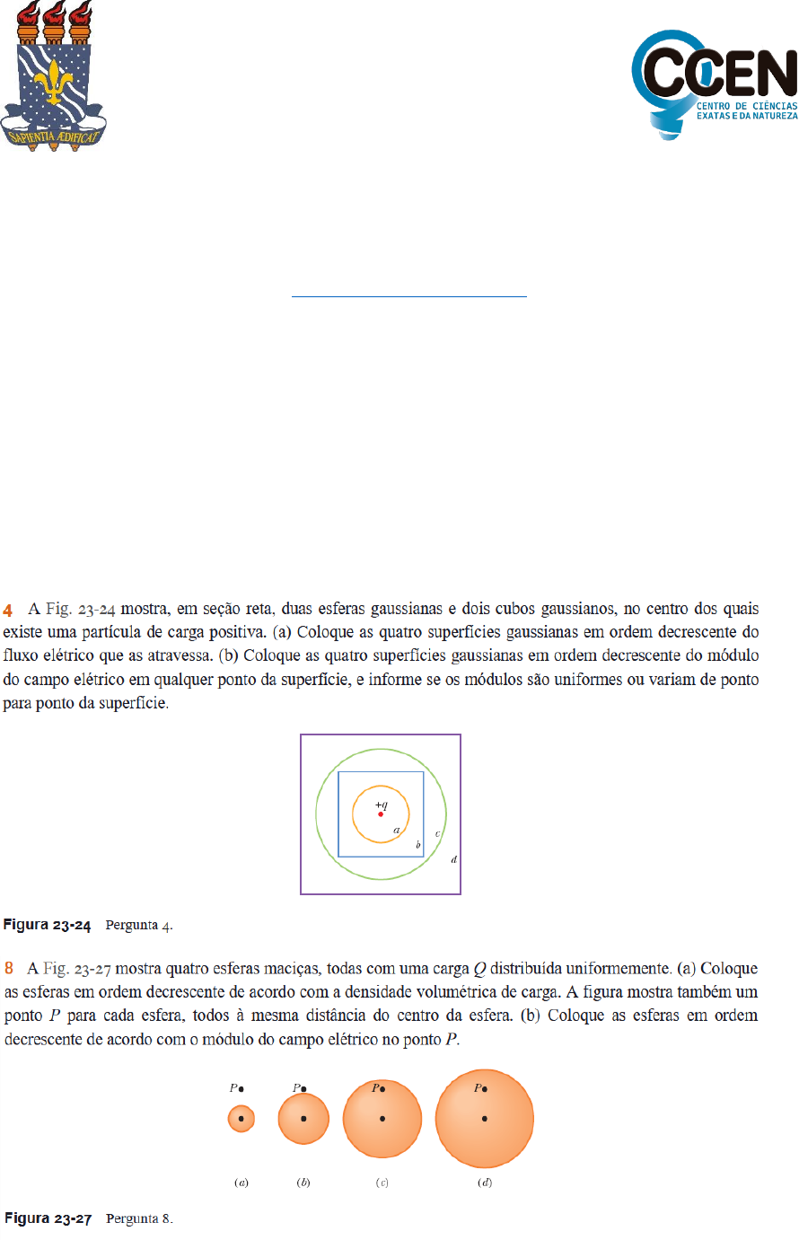 Universidade Federal da Paraíba Centro de Ciências Exatas e da Natureza Departamento de Física Curso: 1101164 - Física Geral III - Turmas 14 (Manhã – 24M45) e 17 (Tarde – 24T23) Professor: Márcio Medeiros Soares (marcio.soares@fisica.ufpb.br) Lista 3: Capítulo 23 Tarefa com pontuação: Sim. Prazo de entrega: 05/10/2020 Entrega pelo SIGAA e excepcionalmente pelo e-mail marcio.soares@fisica.ufpb.br Perguntas: Explique seu raciocínio. mailto:marcio.soares@fisica.ufpb.br Problemas: Explique seu raciocínio.