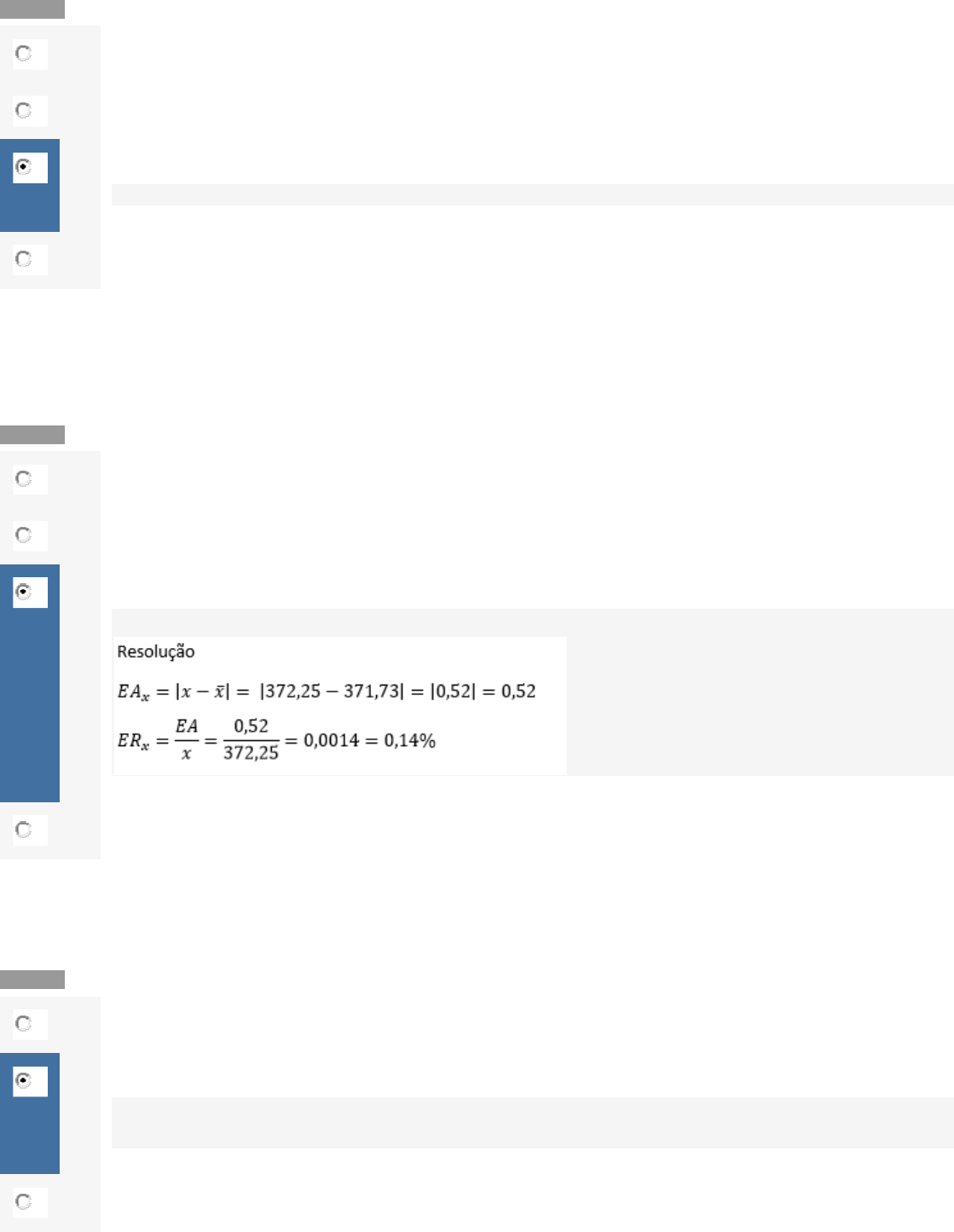 Questão 1/10 - Cálculo Numérico Quais as condições para a regra 3/8 de Simpson ser utilizada? Nota: 10.0 A h= constante e n= par B h= constante e n= qualquer C h= constante e n= múltiplo de 3 Você acertou! D h= variável e n= qualquer Questão 2/10 - Cálculo Numérico Sabendo que o valor exato para algum cálculo é de 372,25 e foi obtido por algum método numérico o valor de 371,73, determine o erro absoluto e o erro relativo Nota: 10.0 A 0,52 e 1,4% B -0,52 e 0,00014% C 0,52 e 0,14% Você acertou! D -0,52 e 1,4% Questão 3/10 - Cálculo Numérico Para os processos de integração numérica, é possível afirmar: Nota: 10.0 A Um aumento no número de divisões do intervalo de integração, ocasiona um erro maior no resultado da integral. B Um aumento no número de divisões do intervalo de integração, ocasiona um erro menor no resultado da integral. Você acertou! Quanto maior o número de divisões, melhor será o resultado obtido. C O erro relativo ocorrido em uma avaliação de integração numérica, não depende da quantidade de divisões do intervalo de integração. D Um aumento ou diminuição na quantidade de divisões do intervalo de integração não tem influência na precisão da resposta. Questão 4/10 - Cálculo Numérico . Nota: 10.0 A 19,432754 B 16,538594 Você acertou! C 33,077188 D 21,354891 Questão 5/10 - Cálculo Numérico . Nota: 10.0 A B C Você acertou! D Questão 6/10 - Cálculo Numérico Quais as condições para o método do trapézio ser utilizada na integração numérica? Nota: 10.0 A h= constante e n= par B h= constante e n= qualquer C h= constante e n= múltiplo de 3 D h= qualquer e n= qualquer Você acertou! Questão 7/10 - Cálculo Numérico Em relação aos métodos numéricos para integração, quais deles podem ser utilizados com passo variável. Nota: 10.0 A Regra 1/3 de Simpson B Regra 3/8 de Simpson C Somente o Método dos Trapézios D Método dos Trapézios e dos Retângulos. Você acertou! Somente as Regras de Simpson tem condição de passo constante. Questão 8/10 - Cálculo Numérico Quais as condições para a regra 1/3 de Simpson ser utilizada na integração numérica? Nota: 10.0 A h= constante e n= par Você acertou! B h= constante e n= qualquer C h= constante e n= múltiplo de 3 D h= variável e n= qualquer Questão 9/10 - Cálculo Numérico A solução do sistema de equações abaixo pode ser realizada por quais procedimentos numéricos? Nota: 10.0 A Método de Newton Você acertou! O sistema é não linear, então deve ser resolvido pelo método de Newton. B Método de Gauss-Jordan C Método de Eliminação de Gauss D Método de Gauss-Jacobi ou Gauss-Seidel Questão 10/10 - Cálculo Numérico . Nota: 10.0 A B C Você acertou! D Não é possível resolver por Gauss-Seidel.