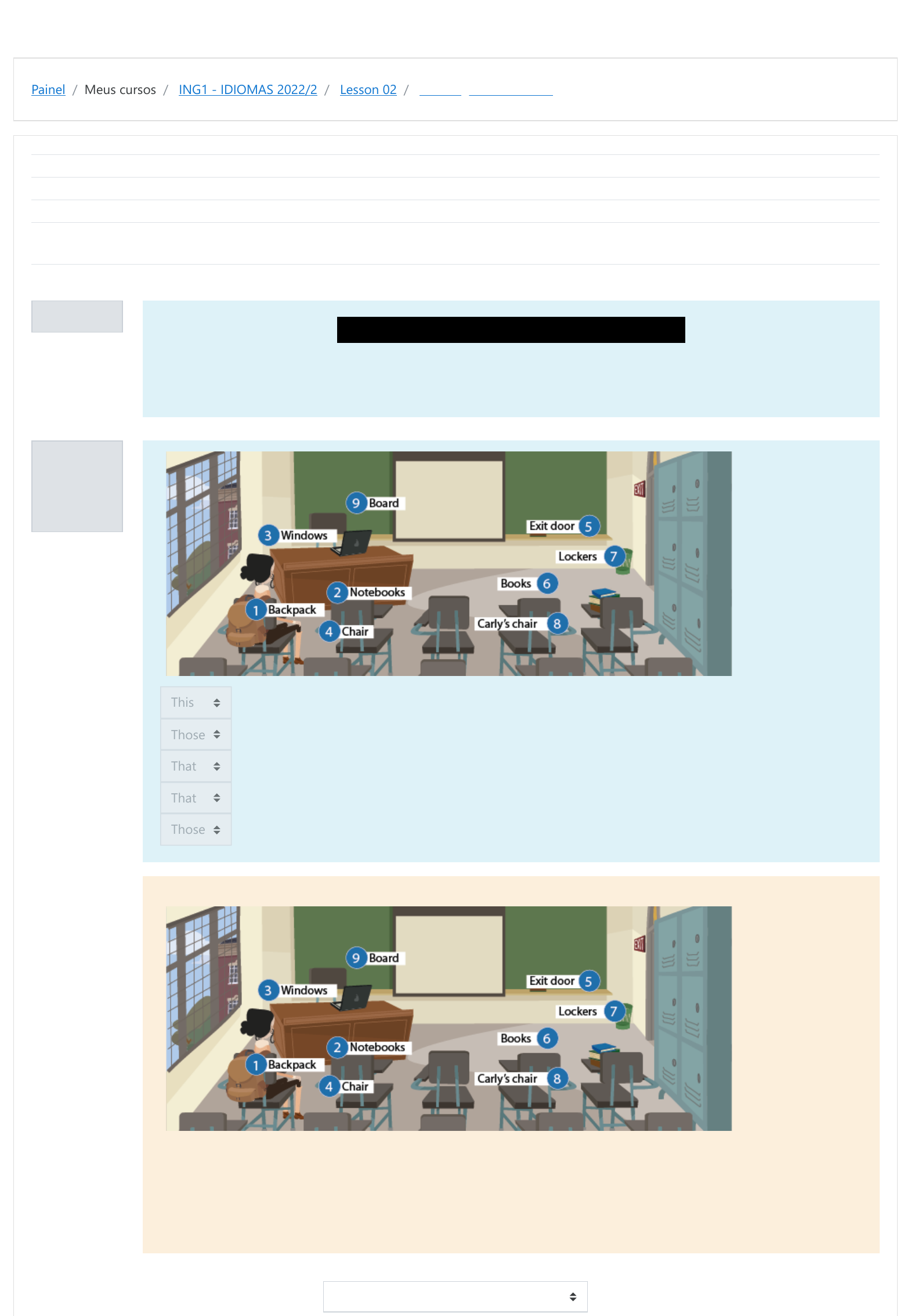Painel / Meus cursos / ING1 - IDIOMAS 2022/2 / Lesson 02 / Showing the classroom Informação Questão 1 Correto Atingiu 10,00 de 10,00 Iniciado em quinta, 13 out 2022, 12:53 Estado Finalizada Concluída em quinta, 13 out 2022, 12:53 Tempo empregado 23 segundos Avaliar 10,00 de um máximo de 10,00(100%) Rosa is showing us her classroom. Can you help her by completing sentences with the demonstrative pronouns? Pay attention to singular or plural objects and also to the distance of the objects considering Rosa's position. is my backpack. are the lockers. is Carly's chair. is the exit door. are the books. This Those That That Those A resposta correta é: [This] is my backpack. [Those] are the lockers. [That] is Carly's chair. [That] is the exit door. [Those] are the books. ◄ Meeting new friends (apostila) Seguir para... Plural Words ► https://moodle.ifsul.edu.br/novohamburgo/my/ https://moodle.ifsul.edu.br/novohamburgo/course/view.php?id=320 https://moodle.ifsul.edu.br/novohamburgo/course/view.php?id=320#section-4 https://moodle.ifsul.edu.br/novohamburgo/mod/quiz/view.php?id=52766 https://moodle.ifsul.edu.br/novohamburgo/mod/resource/view.php?id=52764&forceview=1 https://moodle.ifsul.edu.br/novohamburgo/mod/quiz/view.php?id=52767&forceview=1