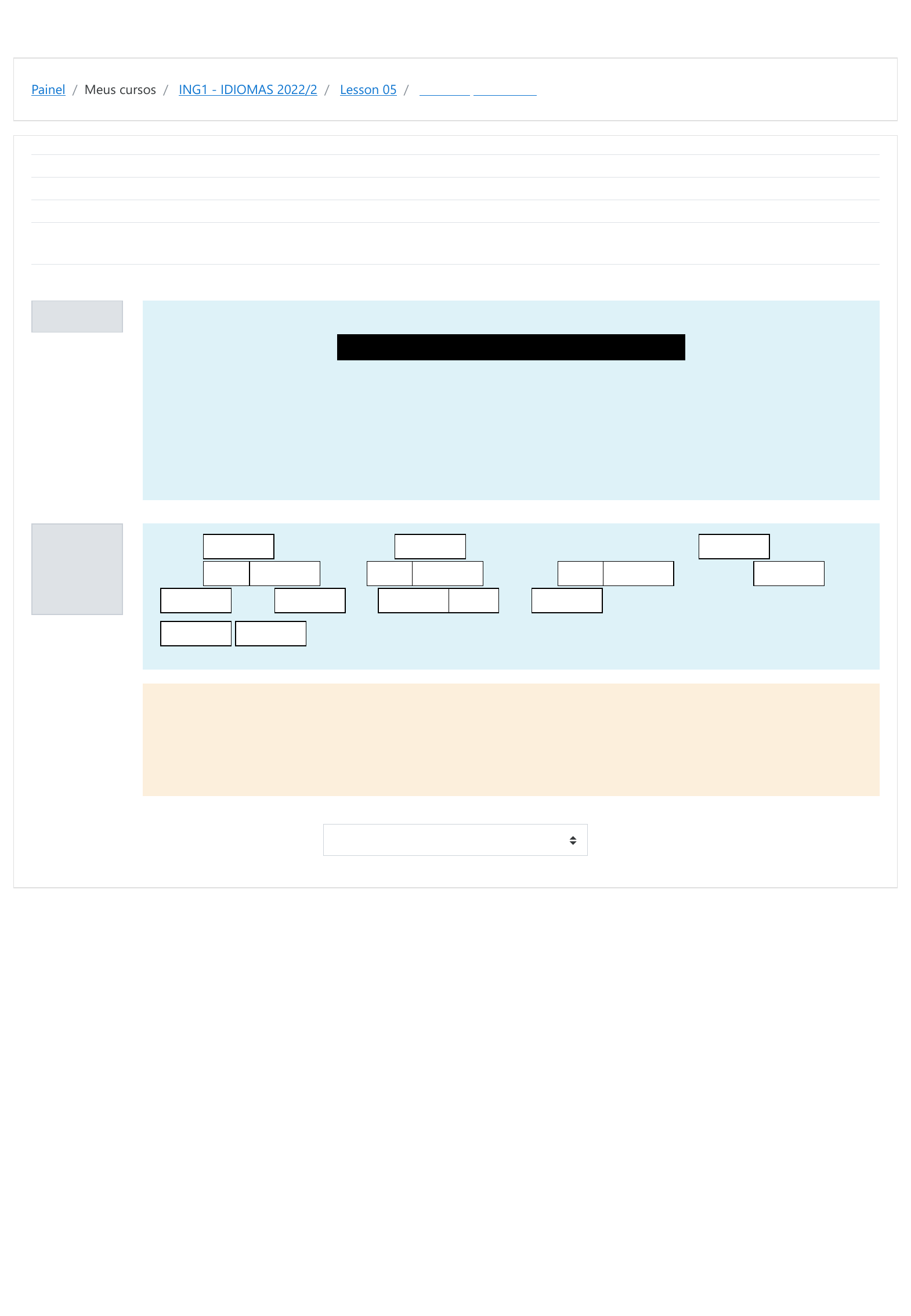 Painel / Meus cursos / ING1 - IDIOMAS 2022/2 / Lesson 05 / To be or possessive? Informação Questão 1 Correto Atingiu 10,00 de 10,00 Iniciado em quarta, 2 nov 2022, 18:56 Estado Finalizada Concluída em quarta, 2 nov 2022, 18:57 Tempo empregado 1 minuto 2 segundos Avaliar 10,00 de um máximo de 10,00(100%) The following sentences have 's. Can you identify if 's means “is” or “possessive's”? Read the sentences and select “possessive” if it has the idea of possessive, or “to be” for verb to be. Example: Vincent's Victor's father. Vincent's (to be) Victor's (possessive) father. Rosa's ( ) host brother's ( ) nice.Amanda and Carly are Rosa's ( ) friends. Rosa's ( ) country's ( ) Brazil. Victor's ( ) favorite sport's ( ) soccer. Catherine's ( ) Victor's ( ) mother. Sua resposta está correta. A resposta correta é: Rosa's ([possessive]) host brother's ([to be]) nice.Amanda and Carly are Rosa's ([possessive]) friends. Rosa's ([possessive]) country's ([to be]) Brazil. Victor's ([possessive]) favorite sport's ([to be]) soccer. Catherine's ([to be]) Victor's ([possessive]) mother. ◄ Victor's relatives Seguir para... The Glenn ► possessive possessive possessive possessive possessive possessivepossessivepossessivepossessive to be to be to be to be to beto beto beto beto be https://moodle.ifsul.edu.br/novohamburgo/my/ https://moodle.ifsul.edu.br/novohamburgo/course/view.php?id=320 https://moodle.ifsul.edu.br/novohamburgo/course/view.php?id=320#section-7 https://moodle.ifsul.edu.br/novohamburgo/mod/quiz/view.php?id=52838 https://moodle.ifsul.edu.br/novohamburgo/mod/quiz/view.php?id=52837&forceview=1 https://moodle.ifsul.edu.br/novohamburgo/mod/quiz/view.php?id=52839&forceview=1