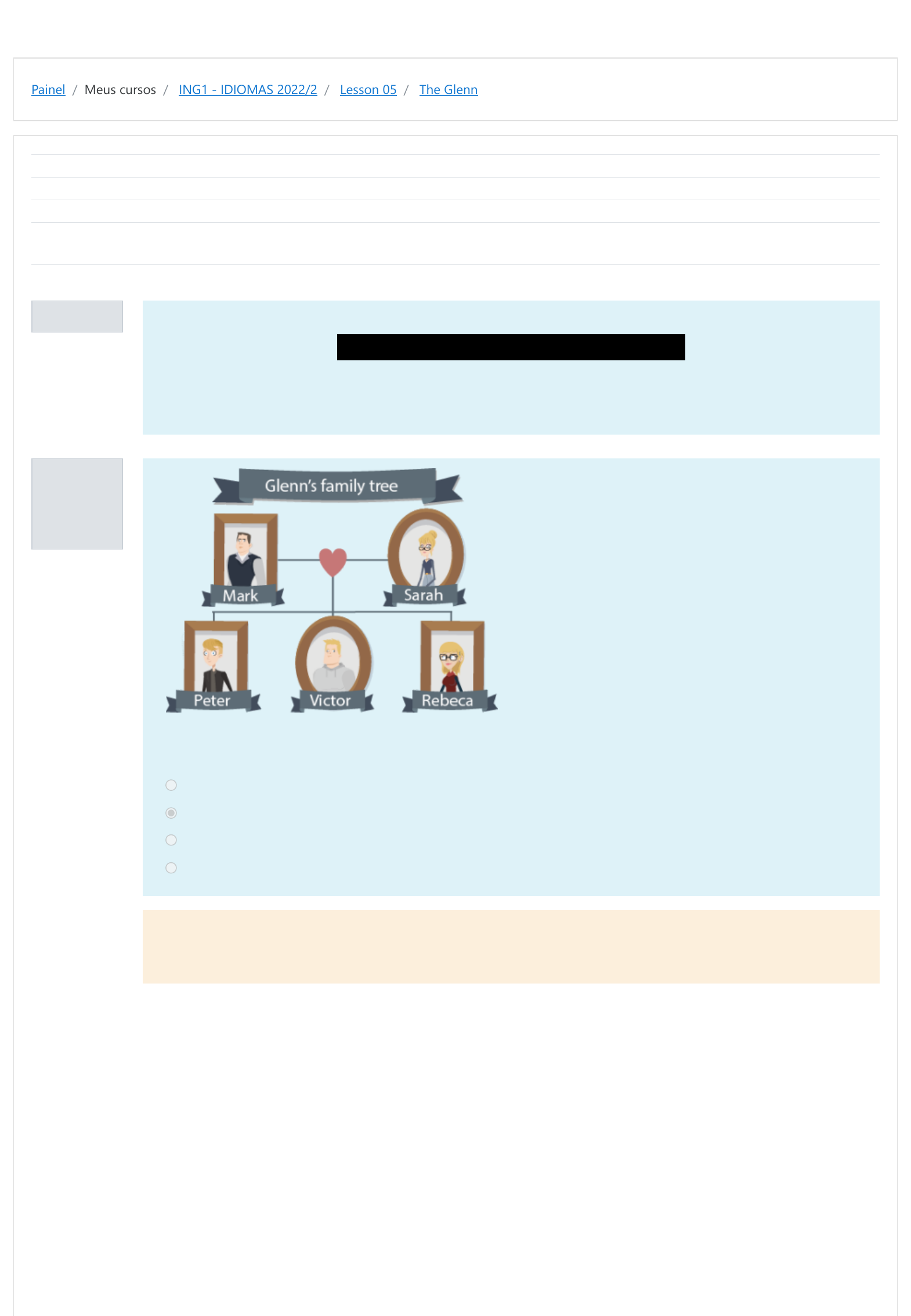 Painel / Meus cursos / ING1 - IDIOMAS 2022/2 / Lesson 05 / The Glenn Informação Questão 1 Correto Atingiu 2,00 de 2,00 Iniciado em quarta, 2 nov 2022, 18:58 Estado Finalizada Concluída em quarta, 2 nov 2022, 18:59 Tempo empregado 1 minuto 46 segundos Avaliar 10,00 de um máximo de 10,00(100%) Victor belongs to the Gleen family and this is their family tree. Read the sentences and select the correct based on the kinship among Victor and his relatives. Use possessive pronouns, verb TO BE, and possessive 'S. Escolha uma opção: a. That's Sarah. Her children names are Victor, Rebeca and Peter. b. That's Sarah. Her children's names are Victor, Rebeca and Peter. c. That's Sarah. Her children is names' Victor, Rebeca and Peter. d. That's Sarah. They children's names are Victor, Rebeca and Peter. Sua resposta está correta. A resposta correta é: That's Sarah. Her children's names are Victor, Rebeca and Peter. https://moodle.ifsul.edu.br/novohamburgo/my/ https://moodle.ifsul.edu.br/novohamburgo/course/view.php?id=320 https://moodle.ifsul.edu.br/novohamburgo/course/view.php?id=320#section-7 https://moodle.ifsul.edu.br/novohamburgo/mod/quiz/view.php?id=52839 Questão 2 Correto Atingiu 2,00 de 2,00 Questão 3 Correto Atingiu 3,00 de 3,00 Escolha uma opção: a. These three are Victor, Rebeca and Peter. He is Mark and Sarah's children. b. These three are Victor, Rebeca and Peter. They are Mark and Sarah is children. c. These three are Victor, Rebeca and Peter. They are Mark's and Sarah's children. d. These three are Victor, Rebeca and Peter. They are Mark and Sarah's children. Sua resposta está correta. A resposta correta é: These three are Victor, Rebeca and Peter. They are Mark and Sarah's children. Escolha uma opção: a. This is Rebeca. His father's name is Mark. b. This is Rebeca. His father is name is Mark. c. This is Rebeca. They father's name are Mark. d. This is Rebeca. Her father's name is Mark. Sua resposta está correta. A resposta correta é: This is Rebeca. Her father's name is Mark. Questão 4 Correto Atingiu 1,50 de 1,50 Questão 5 Correto Atingiu 1,50 de 1,50 Escolha uma opção: a. This is Victor. His sister's name is Rebeca. b. This is Victor. Her sister name is Rebeca. c. This is Victor. His sisters' names are Rebeca and Peter. d. This is Victor. Her sister's name is Rebeca. Sua resposta está correta. A resposta correta é: This is Victor. His sister's name is Rebeca. Escolha uma opção: a. Those two are Mark and Sarah. They are Victor's, Rebeca's and Peter's parents. b. Those two are Mark and Sarah. They are Victor, Rebeca and Peter're parents. c. Those two are Mark and Sarah. They are Victor, Rebeca and Peter's parents. d. Those two are Mark and Sarah. They're Victor, Rebeca and Peter's parents. Sua resposta está correta. As respostas corretas são: Those two are Mark and Sarah. They are Victor, Rebeca and Peter's parents., Those two are Mark and Sarah. They're Victor, Rebeca and Peter's parents. ◄ To be or possessive? Seguir para... Question words ► https://moodle.ifsul.edu.br/novohamburgo/mod/quiz/view.php?id=52838&forceview=1 https://moodle.ifsul.edu.br/novohamburgo/mod/quiz/view.php?id=52840&forceview=1