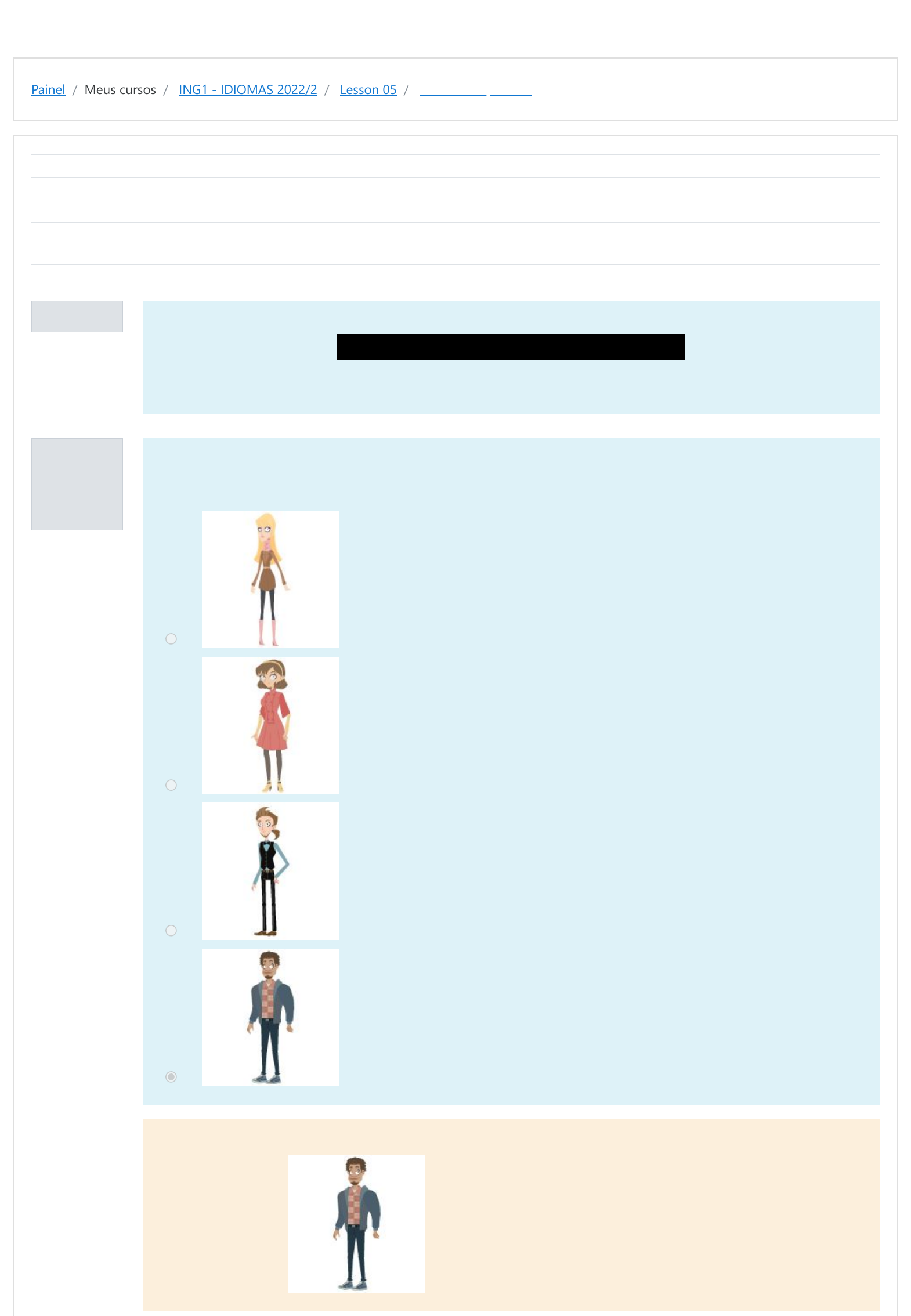 Painel / Meus cursos / ING1 - IDIOMAS 2022/2 / Lesson 05 / Who is this person? Informação Questão 1 Correto Atingiu 2,50 de 2,50 Iniciado em quarta, 2 nov 2022, 19:04 Estado Finalizada Concluída em quarta, 2 nov 2022, 19:05 Tempo empregado 52 segundos Avaliar 10,00 de um máximo de 10,00(100%) Are you observant? Read the descriptions and click on the character described. This person is tall and strong. He/she has short, wavy brown hair and brown eyes. Escolha uma opção: Sua resposta está correta. A resposta correta é: https://moodle.ifsul.edu.br/novohamburgo/my/ https://moodle.ifsul.edu.br/novohamburgo/course/view.php?id=320 https://moodle.ifsul.edu.br/novohamburgo/course/view.php?id=320#section-7 https://moodle.ifsul.edu.br/novohamburgo/mod/quiz/view.php?id=52842 Questão 2 Correto Atingiu 2,50 de 2,50 This person is short and thin. He/she has shoulder-length hair. This person is young Escolha uma opção: Sua resposta está correta. A resposta correta é: Questão 3 Correto Atingiu 2,50 de 2,50 This person is tall and skinny. He/she has shoulder-length hair. This person has fair skin. Escolha uma opção: Sua resposta está correta. A resposta correta é: Questão 4 Correto Atingiu 2,50 de 2,50 This person is medium-height and thin. He/she has long blond hair. This person has freckles. Escolha uma opção: Sua resposta está correta. A resposta correta é: ◄ Who's or whose? Seguir para... Carly's Family ► https://moodle.ifsul.edu.br/novohamburgo/mod/quiz/view.php?id=52841&forceview=1 https://moodle.ifsul.edu.br/novohamburgo/mod/quiz/view.php?id=52844&forceview=1