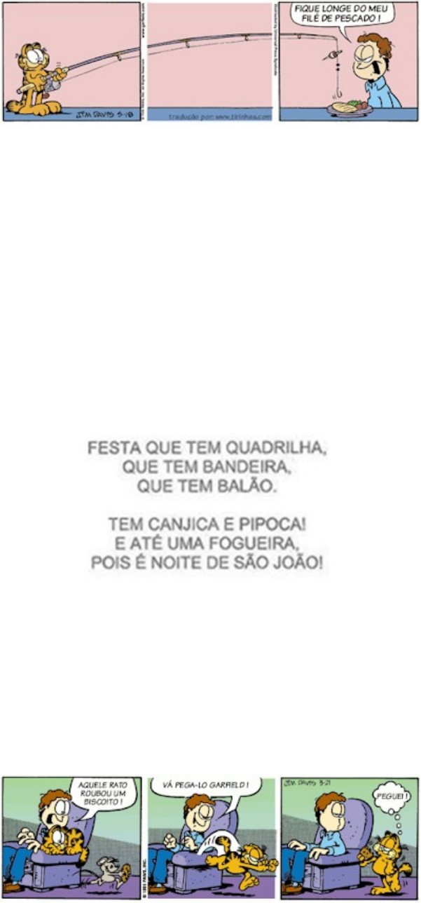 Observe a tirinha abaixo para responder as questões 1 e 2: 1. O que o gato pretende fazer com a vara de pescar? a) Brincar com o homem. b) Dar um susto no homem. c) Chamar seu dono para brincar. d) Pegar o peixe do prato. 2. Pela tirinha anterior podemos concluir que os gatos gostam muito de comer... a) Frutas b) Verduras. c) Peixes d) Carne Leia o texto abaixo: 3. Que festa é essa? a) Festa de Natal. b) Festa Junina. c) Festa das Mães. d) Festa da Páscoa. O humor só tem graça porque ele traz muitas informações implícitas. Observe a tirinha: 4. O que John esperava que Garfield fizesse? a) Comesse o rato. b) Pegasse o rato. c) Comesse o biscoito. d) Trouxesse o biscoito para ele. Leia o texto: 5. Que presente ele ganhou? a) Um celular. b) Uma bicicleta. c) Um carrinho de mão. d) Um velocípede. Observe o texto abaixo: 6. O assunto do texto é: a) Brincadeiras na praia. b) Cuidado com a natureza. c) Restos de comida. d) Lixeiras. Leia esta piada: 7. Por que o pai se escondeu embaixo da cama? a) Estava sonhando. b) Queria brincar com o filho. c) Queria dar um susto no filho. d) Teve medo de ladrão. Leia o texto para responder as questões 8 e 9: 8. Este é um texto sobre como... a) Comprar persianas. b) Fazer cortinas. c) Economizar energia elétrica. d) Usar filtro solar. 9. Ainda sobre o texto anterior, o que é “LUZ NATURAL” ? a) É a luz do sol. b) É a luz da lâmpada. c) É a luz da vela. d) É a luz da lanterna. 10. Na frase “André é o meu filho menor”, qual a informação que a mãe deixou implícita? a) Que seu filho André é baixinho. b) Que seu filho André é o mais novo. c) Que seu filho André é o que ela menos gosta. d) Que seu filho André é o mais alto. GABARITO 1D / 2C / 3B / 4B / 5C / 6B / 7D / 8C / 9A / 10B · · · Leia o texto e resolva as questões: A GALINHA DOS OVOS DE OURO Havia uma galinha que conseguia pôr ovos de ouro. O seu dono, ganancioso, começou a achar que havia uma pilha de ouro na sua barriga e resolveu matá-la. Foi aí que descobriu que o animal, por dentro, era igual a todos os outros. Assim, ele perdeu o animal que lhe trazia lucros, na ambição de aumentar rapidamente a sua riqueza. Moral: Quem tudo quer, tudo perde. Esopo 1. O texto é: a) um bilhete. b) um poema. c) uma notícia. d) uma fábula. 2. Quem é o personagem principal do texto? _______________________________________ _______________________________________ 3. O que a galinha da história fazia de diferente das outras galinhas? _______________________________________ _______________________________________ 4. Conforme o texto, o dono da galinha era: a) feliz. b) triste. c) ganancioso. d) inteligente. 5. O dono achava que havia uma pilha de ouro: a) no ninho da galinha. b) na barriga da galinha. c) dentro do ovo da galinha. d) no seu galinheiro. 6. O que acabou acontecendo com a galinha? _______________________________________ _______________________________________ _______________________________________ 7. É possível perceber que no final a galinha: a) era igual as outras. b) possuía muito ouro. c) ficou doente e morreu. d) era diferente dos outros animais. 8. A palavra ambição significa: a) desculpas. b) ganância. c) rapidez. d) riqueza. 9. No trecho: “Assim, ele perdeu o animal...”, a palavra grifada se refere: a) à galinha. b) ao animal. c) ao dono. d) ao ovo. 10. Porque o homem matou a galinha? _______________________________________ _______________________________________ _______________________________________ 11. O texto tem a finalidade de: a) vender um produto. b) narrar uma história. c) informar uma notícia. d) ensinar uma receita. 12. A moral da história é: a) “Quem tudo perde, tudo ganha.” b) “Quem tudo pode, tudo perde.” c) “Quem tudo quer, tudo pode.” d) “Quem tudo quer, tudo p