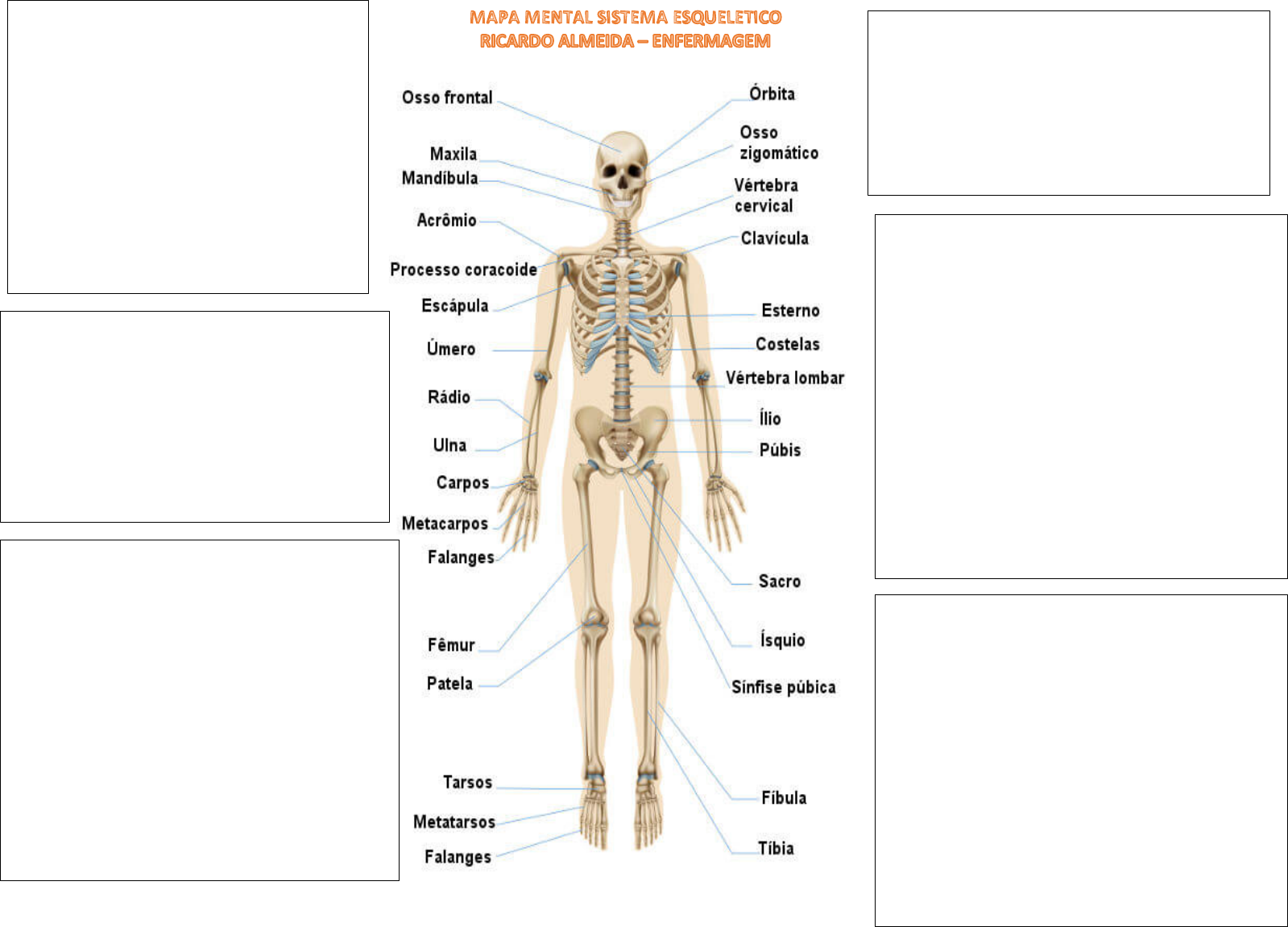 Cabeça: Crânio (8 ossos): Frontal, Perental, Temporais, occipital, esfenoide, etmoides Face (14 osso): Maxilares, zigomáticos, nasais, lacrimais, palatinos, conchas nasais inferiores, Vomer, mandíbula Coluna vertebral: 33 Vertebras Formado pela superposição de ossos denominados de vértebras, entre suas funções temos de suportar o peso do tronco e distribuir para os membros inferiores, proteger a medula espinhal ou espinal ponto entre as vértebras encontra-se discos intervertebrais, formados por tecido fibrocartilaginoso - Cervical (região do pescoço) 7 vertebras - Toráxica 12 vertebras - Lombar 5 vertebras - Sacral 5 Vertebras Fundidas - Coccígea 4 Vertebras Membros Superiores: - Cintura ou cíngulo escapula - Clavícula - Escapulas -Ossos dos braços -Úmero - Radio e Ulna (antebraço) - Ossos da mão Carpos 8 Metacarpos 5 Falanges 14 Região Toráxica: - 12 pares de Costelas 7 pares verdadeiras 3 pares falsas 2 pares flutuantes - Externo ( osso de da massagem cardíaca) Membros Inferiores: - Cintura Pélvica - Osso da cocha (fêmur) - Patela (antiga rotula) - Ossos das pernas - Tíbia -Fíbula - Ossos dos pés - 7 tarsos - 5 metatarsos - 14 falanges A ciência que estuda os ossos é a osteologia, o indivíduo adulto possui 206 ossos. As funções dos ossos são sustentação proteção dos órgãos movimentação do corpo armazenamento de sais minerais e cálcio e a hematopoese que é a produção de células sanguíneas. São formados por um tipo de tecido conjuntivo que possuem uma matriz intercelular mineralizadas São órgãos esbranquiçados muito duros Unidos uns aos outros por intermédio das articulações.