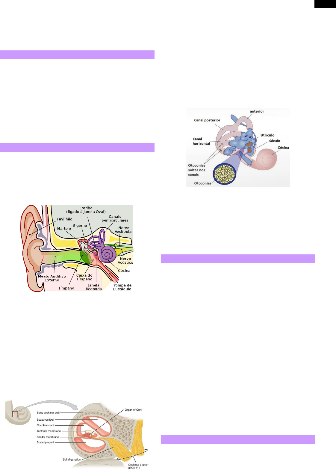 1 Louyse Jerônimo de Morais Anatomia e fisiologia da orelha+ otite externa Referência: aula da prof. Maria José Introdução Aqui, teremos uma mudança grande, pois sairemos do meio da face e iremos para as laterais, entrando em um sistema que, apesar de fazer parte das vias aéreas unidas, tem suas particularidades. Veremos o motivo pelo qual o osso temporal tem 208 acidentes anatômicos e o tamanho da complexidade desse órgão. Observação aleatória: não chama mais ouvido, e sim orelha. Panorâmica do aparelho auditivo Começa com o pavilhão auricular, o meato acústico externo, a membrana do tímpano, a caixa do tímpano, a tuba auditiva, passa pelo ouvido interno, onde vamos encontrar dois órgãos de extrema importância, do ponto de vista neurossensorial – a cóclea e o labirinto. A orelha interna tem o labirinto, responsável pelo equilíbrio, e a cóclea, responsável pela audição. Isso faz parte do sistema neurossensorial das orelhas. A cóclea é uma volta em espiral, isto é, “em caracol”. Dentro dessa volta, ela tem um ducto membranoso e, dentro dele, tem regiões denominadas “órgãos de Corti”, que são elevações de células, onde se faz análise do som. Já os canais semicirculares têm estruturas diferentes, chamadas de ampola. É nela que vai ter a coisa do cílio ir para lá e para cá e fazer corrente centrípeta e centrífuga, uma ativa e outra desativa e é isso que nos mantém equilibrados. • Concreções calcáreas: vai dar uma VPPB – vertigem postural paroxística benigna. Um traumatismo descola essas membranas de calcáreo, então elas ficam balançando e movimentando anormalmente os cílios da crista ampolar, desencadeando tonteira. Nessa imagem, as otoconias correspondem às concreções calcáreas que a prof. falou Acima disso, temos o córtex, onde os nervos que saíram da cóclea, a partir do orifício do meato acústico interno, vão fazer conexão com o cérebro. O cérebro, no lobo temporal, vai nos dar a impressão da audição. Divisão do aparelho auditivo • Orelha externa: vai da ponta do pavilhão até a membrana timpânica. • Orelha média: vai da membrana do tímpano até a membrana da janela oval ou platina do estribo. Quando esta última faz movimento de pistão, que joga onda auditiva dentro do líquido do ouvido interno, já é orelha interna. • Orelha interna: tudo neurossensorial, depois da membrana da janela oval. O ouvido é formado pelos três folhetos do embrião. Na segunda semana de vida embrionária, o polo cefálico do embrião invagina e forma o otocisto. Quando ele faz essa invaginação, forra o meato acústico externo com ectoderma, lá dentro da membrana do tímpano, tem mesoderma e, quando passa, vai ter endoderma. Desde a sua origem, o aparelho auditivo tem uma complexidade enorme, então existem distintas doenças em cada segmento. Otite externa O que forra a parte externa? O ectoderma, que consiste em epitélio. As doenças da orelha externa são 2 Louyse Jerônimo de Morais muito mais dermites do que doenças próprias daqui. Quando vamos para a orelha média, a mucosa da tuba e da orelha média é mucosa respiratória das vias aéreas unidas [doenças respiratórias]. • Meato acústico externo: doenças de pele; • Orelha média: doença respiratória; • Orelha interna: doença neurossensorial; • Tronco cerebral: problemas neurológicos no próprio nervo auditivo – tumor neurinoma do acústico é o principal. O aparelho auditivo se divide em orelha externa, média, interna, com sistema nervoso auditivo e sistema do equilíbrio. Pavilhão auricular • Trago: muito importante, porque se usa muito a sua cartilagem para fazer enxerto da membrana timpânica perfurada. Por que a cartilagem é tão sensível? Ela não tem vasos próprios, nutrindo-se por embebição. Se infectar, vai ter complicação; se necrosar, o destroço está feito. O meato acústico externo não é reto, mas sim um “S”. Ele vai terminar a nível da membrana timpânica. A nível de orelha externa, 2/3 do conduto auditivo externo é ósseo e 1/3 é cartilaginoso. Na frente, tem as vibrissas e as células produtoras de cerúmen. Essas glândulas ceruminosas ficam por baixo dos pelos, os quais têm função filtrativa. O cerúmen é importante porque ele mantém a umidade do fundo do conduto, bem como a sua hidratação. Quando um conteúdo maior entra em um menor, entra sob pressão. Fazendo um comparativo, quando a massa de ar entra, entra sob pressão. Assim, gente sem cera tem muita coceira no ouvido, porque a pele descama, uma vez que não está hidratada e lubrificada – não há proteção de impacto. Os cílios são treinados para jogar a cera fora. Se enfiar cotonete, vai enfiar a cera dentro do conduto. A tendência é fazer uma bola e sair. Não devemos empurrar a cera para dentro. Ainda, o osso timpânico impede que se vá até a estrutura sensível – membrana e ossículos – para não destruir. Função do pavilhão auricular • Captação do som • Localização do som • Ganho auditivo de 5 dB • Proteção Conduto auditivo externo • 26 mm de comprimento por 7 mm de diâmetro; forma “S”. • Revestido com glândulas ceruminosas [1/3 externo] • Protege o tímpano • Aumenta a pressão sonora devido à ressonância acústica [ganho auditivo de 10 dB]. Ligamento estilo-hióideo – creio que seja essa pontinha da imagem acima A ponta do ligamento estilo-hióideo segura o osso hioide. Em uma pessoa de pescoço magro, você sente uma elevação; para saber se é patológico, basta mover. 3 Louyse Jerônimo de Morais • Síndrome de Eagle: calcificação do ligamento estilo-hioideo. Inicialmente, ele é ósseo, mas quando passa para o pescoço, é só ligamento. Calcifica em algumas pessoas, dando uma dor “inexplicada”, sendo mais comum em mulheres após os 30 anos. Osso timpânico e membrana timpânica Veja que temos uma vista do conduto. Vocês estão vendo esse osso timpânico – 