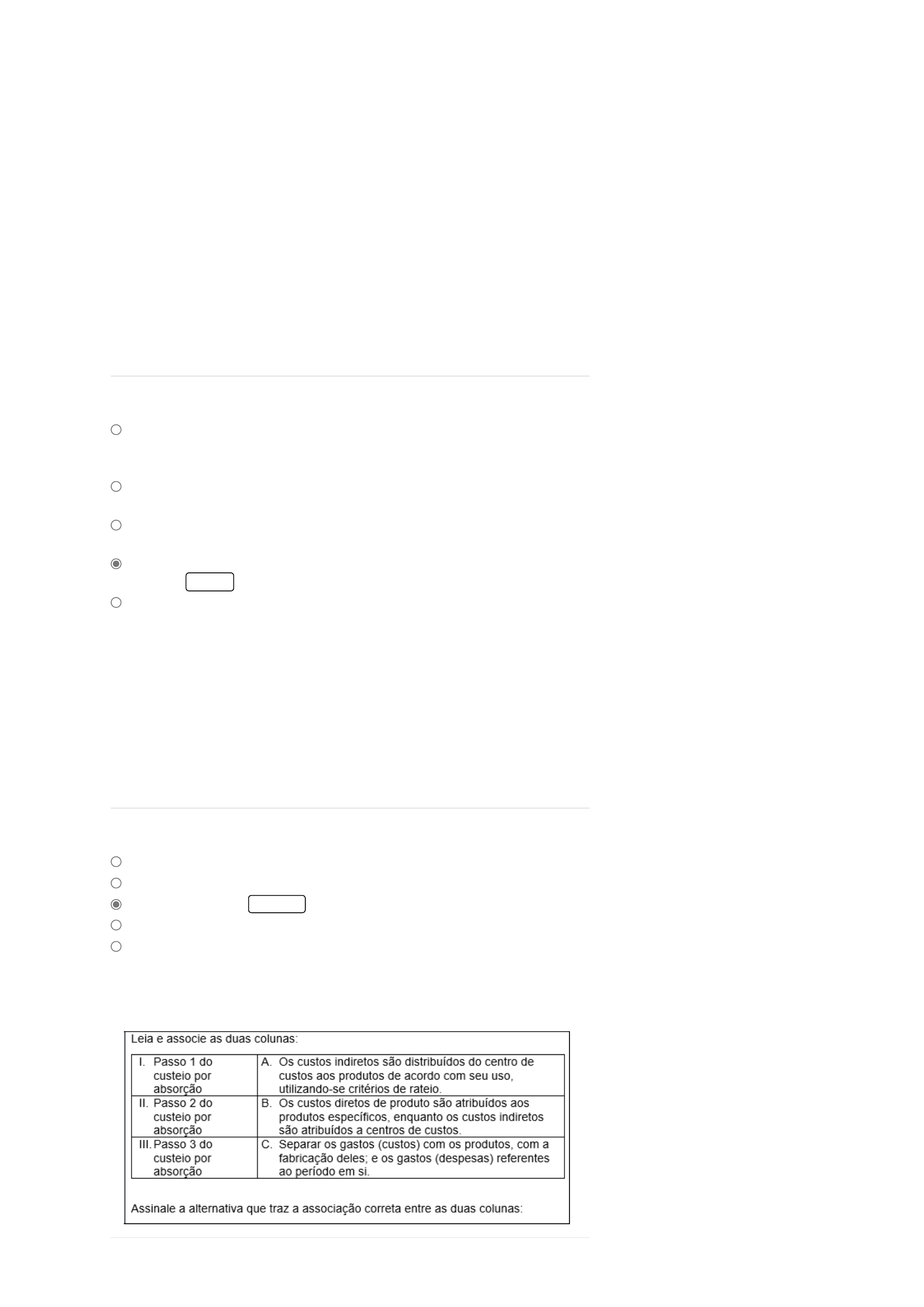 15/11/2022 16:34 Cosmos · Cosmos https://kroton.platosedu.io/lms/m/aluno/disciplina/index/2747327/5516395 1/4 Contabilidade gerencial Professor(a): Nelson Bueno de Oliveira (Mestrado acadêmico) 1) 2) 3) Prepare-se! Chegou a hora de você testar o conhecimento adquirido nesta disciplina. A Avaliação Virtual (AV) é composta por questões objetivas e corresponde a 100% da média final. Você tem até cinco tentativas para “Enviar” as questões, que são automaticamente corrigidas. Você pode responder as questões consultando o material de estudos, mas lembre-se de cumprir o prazo estabelecido. Boa prova! Sobre o custeio ABC (Activity Based Costing), pode-se afirmar o seguinte. “O custeio ABC ao analisar a cadeia de valor do produto rastreia os custos, sejam eles fixos ou variáveis, no intuito de reduzir o máximo possível a classificação de custos como indiretos. Logo, o custeio ABC se propõe a tornar os gastos, no máximo possível, classificados como se fossem custos diretos alocados aos produtos, reduzindo-se, como se disse, a subjetividade, julgamento e arbitramento no cálculo de custos.” Tendo em vista isso, assinale a alternativa que NÃO contém uma afirmação verdadeira sobre o custeio ABC. Alternativas: Código da questão: 56636 O custeio ABC analisa as __________ e os processos de fabricação que se utilizam dessas atividades. Assim, permite aos gestores visualizar as causas geradoras de custos e evidenciar __________, tais como processos desnecessários ou injustificadamente caros, que não agregam __________ ao produto. Assinale a alternativa que completa adequadamente as lacunas acima: Alternativas: Código da questão: 56632 Alternativas: O custeio ABC descreve as atividades realizadas em uma empresa e calcula o seu custo, que depois será alocado aos produtos, dependendo da utilização dessa mesma atividade O custeio ABC reduz a subjetividade, julgamento e arbitramento do cálculo de custos, em comparação ao custeio por absorção e ao custeio variável. O custeio ABC diagnostica as atividades praticadas pela empresa e que atividades são demandadas pelos produtos em sua fabricação. O custeio ABC contempla procedimentos como o de rateio de custos indiretos aos produtos. CORRETO O custeio ABC investiga todos os custos e até mesmo algumas despesas que suportem as atividades. Atividades; Ineficiências; Valor. Falhas; Pontos fortes; Design. Falhas; Rateios; Valor. INCORRETO Atividades; Eficiências; Design. Atividades; Rateios; Valor. 15/11/2022 16:34 Cosmos · Cosmos https://kroton.platosedu.io/lms/m/aluno/disciplina/index/2747327/5516395 2/4 4) 5) 6) Código da questão: 56620 A _____________ pode ser conceituada como o conjunto de princípios, procedimentos e métodos oriundos das ciências de Administração, Economia, Psicologia, Estatística e Contabilidade, entre outras, que se ocupam da gestão econômica das empresas, com o fim de orientá-las para a ____________. Assinale a alternativa que completa adequadamente as lacunas acima: Alternativas: Código da questão: 56611 Sobre a contabilidade gerencial e o planejamento estratégico, podemos afirmar que: I. A contabilidade gerencial se utiliza de informações geradas pela contabilidade financeira ou societária e pela contabilidade de custos. II. Há uma atuação estratégica da controladoria, no sentido de o sucessivo atingimento das metas orçamentárias conduzir a entidade ao atingimento dos objetivos do longo prazo. III. A atividade de orçamento empresarial pode ser desenvolvida independentemente do planejamento estratégico. IV. A atividade de orçamento empresarial pode ser desenvolvida sem a utilização de informações geradas pela contabilidade gerencial. V. O ambiente competitivo contemporâneo demanda acuidade, perspicácia e sensibilidade dos sistemas corporativos de contabilidade gerencial em poder captar tendências do ambiente. São verdadeiras: Alternativas: Código da questão: 56614 I-B; II-A; III-C. INCORRETO I-C; II-A; III-B. I-C; II-B; III-A. I-B; II-C; III-A. I-A; II-B; III-C. Auditoria; Sustentabilidade. Controladoria; Eficácia. CORRETO Tesouraria; Sustentabilidade. Diretoria comercial; Vendas. Diretoria de marketing; Eficácia. I - II - V. CORRETO III - IV. I - III. I - II - III - IV - V. I - II - IV. 15/11/2022 16:34 Cosmos · Cosmos https://kroton.platosedu.io/lms/m/aluno/disciplina/index/2747327/5516395 3/4 7) 8) 9) Alternativas: Código da questão: 56634 Sobre os conceitos de custos, considere as seguintes afirmações: ( ) As empresas podem definir seus preços apenas de acordo com os custos incorridos, não sendo importante a referência dos preços praticados pelos concorrentes no mercado em que atuam. ( ) O conhecimento dos custos é vital para saber se, dado o preço praticado no mercado, o produto é rentável. ( ) O conhecimento dos custos é vital para saber se é possível otimizar os custos, para viabilizar o lançamento de um produto, caso o preço praticado no mercado seja menor do que os custos a incorrer. Assinale a alternativa que contenha a sequência correta: Alternativas: Código da questão: 56619 O custeio variável ou custeio direto é o sistema de custos que considera custo de produção de um período apenas os custos __________ ou __________ incorridos, não se apropriando, como custos, os custos fixos, os quais são tratados como se fossem __________ do período. Assinale a alternativa que completa adequadamente as lacunas acima: Alternativas: Código da questão: 56625 Os custos diretos são custos diretamente apropriados ou imputáveis aos produtos, sendo necessário haver uma medida de consumo. Os custos indiretos não podem ser estimados com base em seu consumo por produto, objetivamente, logo, sua alocação é feita por critérios de rateio. Por sua vez, os custos fixos independem do volume produzido e os custos variáveis dependem do volume de atividade numa unidade de tempo. As expressões fixos e variáveis são uma classific