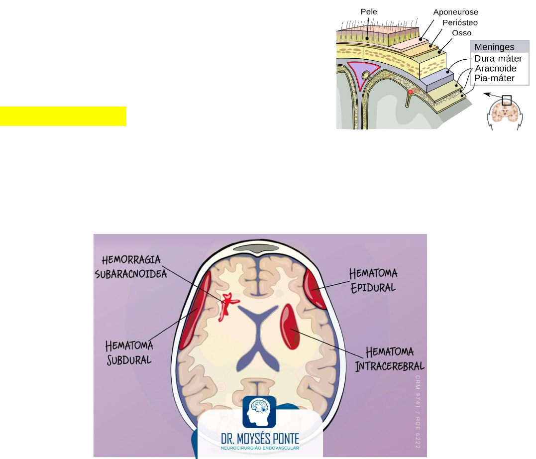 Mariana M. de Almeida 2022.2 Trauma Crânioencefálico É o tipo de trauma mais encontrado nas emergências. Além disso, grande parte dos sobreviventes do TCE apresentam dano neurofisiológico que resulta em invalidez. Por isso, o objetivo do atendimento de suspeita de TCE é PREVINIR LESÃO CEREBRAL SECUNDÁRIA e a melhor forma de fazer isso é: • Oxigenação adequada • Manter PA suficiente para perfusão cerebral • Enviar o paciente para centro do trauma urgentemente Locais de sangramento: 1. Hematoma subgaleal – sangramento entre a pele e o osso (famoso galo) 2. Hematoma extradural – sangramento entre o osso e acima da dura-máter 3. Hematoma subdural – sangramento abaixo da dura-máter e acima da aracnoide 4. Hematoma subaracnoide – sangramento abaixo da aracnoide 5. Sangramento intraparenquimatoso – sangramento no tecido encefálico Pressão intracraniana x Doutrina de MonroKellie A calota craniana é fixa e não temos grandes variações do espaço ósseo, por isso, se temos aumento de PIC, o líquor e o sangue venoso vão fazer alterações para tentar compensar, porque o volume total do conteúdo intracraniano se mantém CONSTANTE. O paciente vítima de trauma morre principalmente de choque hemorrágico, partindo disso, a pressão arterial média dele estará diminuída. O paciente com hematoma intracraniano, tem pressão intracraniana aumentada. Resultado: pressão de perfusão cerebral diminuída e para diminuir a injúria do TCE é preciso evitar danos secundários. Mariana M. de Almeida 2022.2 • PIC normal – 10mmHg • PIC > 20mmHg – piores desfechos • PPC (pressão de perfusão cerebral) = PAM – PIC TCE – lesões cerebrais traumáticas Primária: corresponde as lesões que ocorrem no momento do trauma. 1. Fraturas de crânio → avaliar se foi em calota x base, linear x estrelada, aberta x fechada 2. Fraturas de base crânio (se atentar a battle, guaxinim, otorreia) → precisamos realizar uma TC com janela óssea e não podemos subestimar, até porque para ocorrência dessa fratura é necessária uma força considerável 3. Lesões cerebrais difusas (a clínica é perda de consciência): → Concussões (lesão cerebral traumática leve): caracteriza-se por um distúrbio neurológico não focal transitório com perda de consciência, sem nenhuma lesão identificada. O paciente retorna e não tem alterações radiológicas, muito comum em lutas. → Lesão axonal difusa: Ocorre por lesões de alta velocidade/desaceleração/lesões por cisalhamento. O paciente apresenta alteração difusa, não focal, com alterações radiológicas, além disso, é grave com prognóstico ruim e grandes chances para morte encefálica. 4. Lesões cerebrais focais: → Hematomas subdurais • São mais comuns; • Ocorre geralmente uma dilaceração de vasos superficiais relacionados com vasos venosos; • Tem formato de meia lua que contorna o cérebro; • O comprometimento cerebral costuma ser mais grave do que nos epidurais, pois está em maior contato com o parênquima cerebral. → Hematomas epidurais • São raros; • Tem forma biconvexa e sangramento de origem arterial; • A maioria resulta da ruptura da artéria meníngea; • Regiões temporal ou temporo-parietal; • A clínica é o paciente apresentar um intervalo de lucidez e de repente rebaixar o nível de consciência. Mariana M. de Almeida 2022.2 CUIDADO! CUIDADO! CUIDADO! CUIDADO! → Contusões e hematomas intracerebrais: • São mais comuns que os epidurais e a maioria acontece nos lobos frontal e temporal • Podem evoluir para hematomas com efeito de massa (20% dos casos) • Diante da grande possibilidade de evolução, é necessário repetir a TC para avaliar mudança nos padrões Caso clinico: JAS, 16 anos, vítima de colisão moto x carro; estava na moto sem capacete. 1. Segurança da cena; 2. Paramentação; 3. X – verificar presença de lesão exsanguinante; 4. Restrição manual do movimento da coluna + avaliação da via aérea; 5. I(inspeção)P(palpação)A(ausculta - presença/ausência de MV)P(percussão) 6. 1H6P (conter sangramento, checar pulso, pele, perfusão e lugares de armazenamento de sangue (pança, pelve, pernas), expansão volêmica com ringer lactato e jelco 18) 7. Glasgow (varia entre 3-15) + avaliação pupilar (feita por REATIVIDADE À LUZ) 8. Exposição do paciente, avaliação do dorso, prevenção de hipotermia Obs1: Hematoma em expansão e inalação de fumaça são indicações de via aérea definitiva precoce na letra A para que o nosso paciente não perca a patência. Obs2: Lembrar que pegamos acesso com o jelco 18 e começamos a infundir o ringer em 250ml podendo fazer até 4 ciclos = 1000ml. Se não resolver, podemos fazer hemoderivados (1 de hemácia: 1 de plasma: 1 de plaquetas), além disso podemos fazer ácido tranexâmico (1g em bolus) até 03 horas do trauma. Obs3: Ex: Glasgow 9 e Glasgow p -1 significa que Glasgow p = 8 e Glasgow = 9, portanto não intubamos (para intubação glasglow < 8) Obs4: Glasgow P indica prognóstico, mas não define conduta. Obs5: Se durante a avaliação o paciente tiver resposta assimétrica, consideramos o melhor desempenho do paciente. Obs6: Principais indicações de IOT: 1. Incapacidade de manutenção da perviedade da via aérea (GCS ≤ 8) 2. Risco iminente de obstrução de VA (ex: inalação de fumaça) 3. Incapacidade/prejuízo da ventilação (uso de musculatura acessória) 4. Acidose metabólica (tendência a hiperventilação) Mariana M. de Almeida 2022.2 Relembrando... A pupila é só prognostico, não muda o Glasgow terapêutico. Então um paciente com Glasgow 9, mas tem uma pupila não reagente, ele perde um ponto, mas não é indicativo de IOT!!!!! Se houver diminuição de 2 pontos ou mais da escala de Glasgow → PRECISA INTUBAR O PACIENTE. Pois ele está piorando. Classificação do TCE 1. Leve: glasgow 13-15 2. Moderado: glasgow 9-12 3. Grave: glasgow ≤ 8 A lesão cerebral é agravada por agress