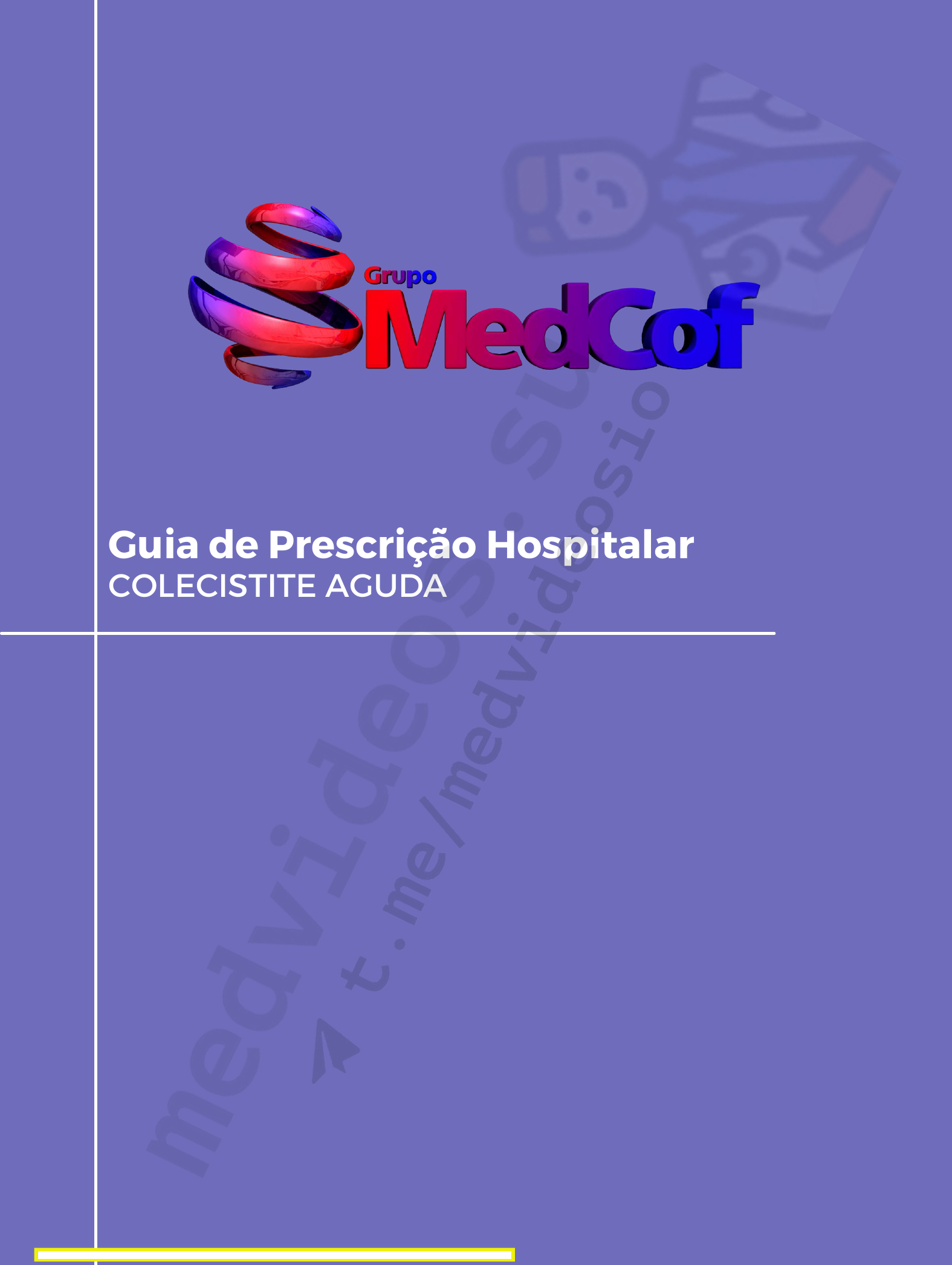 Guia de Prescrição Hospitalar COLECISTITE AGUDA medvideos.su medvideos.su 3 Guia de Prescrição Hospitalar COLECISTITE AGUDA Guia de Prescrição Hospitalar | Colecistite Aguda 1. Considerações iniciais LEVE MODERADA GRAVE Sem nenhum critério positivo Leucocitose > 18.000 Massa palpável Duração > 72h Complicações locais Disfunção orgânica Hipotensão, IRA, Rebaixamento do nível de consciência Coagulopatia, IRpA CLASSIFICAÇÃO LEVE MODERADA GRAVE COLECISTECTOMIA PRECOCE Repensar em caso de: - ASA ≥ III / CCI ≥ 6 = ATB + Suporte e cirurgia tardia - ATB - pode ser suspenso se caso simples e resolvido com cirurgia ATB + SUPORTE Inicialmente: fazer ATB + jejum + analgesia + hidratação venosa + suporte - Sucesso (paciente bem?) = fazer CIRURGIA ASA ≥ III / CCI ≥ 6 = ATB + Suporte e cirurgia tardia - Não resolveu (houve piora?) = fazer DRENAGEM (Colecistostomia) ATB + SUPORTE Inicialmente: internação em UTI + avaliar droga vasoativa + avaliar IOT ATB + Jejum + analgesia + HV + suporte - Sucesso (paciente favorável) = fazer CIRURGIA - Paciente desfavorável = fazer DRENAGEM (Colecistostomia) O ideal é operar sempre que possível! Paciente de alto risco, mas que respondeu ao tratamento --> fazer a cirurgia tardia (operar em condições melhores) Paciente de alto risco, mas sem condições cirúrgicas --> optar pela drenagem (colecistostomia percutânea, drenagem endoscópica, drenagem cirúrgica) Para o manejo da Colecistite aguda, precisamos primeiro classificá-la (Tokyo Guidelines, 2018). ASA I Paciente saudável, sem comorbidades Paciente com doença sistêmica leve Classificação ASA ASA V ASA IV ASA VI ASA III ASA II Paciente com doença sistêmica grave Paciente com doença sistêmica que apresenta risco eminente a vida. Paciente moribundo, que não sobreviverá se não for operado Paciente com morte cerebral Escore Comorbidades Infarto do miocárdio Insuficiência cardíaca congestiva Doença vascular periférica Doença cerebrovascular Demência Doença pulmonar crônica Doença do tecido conjuntivo Doença ulcerosa péptica Doença hepática leve Diabetes mellitus (sem complicações) Charlson comorbidity index (CCI) 3 2 4 1 Doença hepática moderada ou grave Tumor sólido metastático Síndrome da imunodeficiência adquirida Hemiplegia Moderate or severe chronic kidney disease Diabetes mellitus with end-organ damage Any solid tumor Leukemia Malignant lymphoma medvideos.su 4 Guia de Prescrição Hospitalar | Colecistite aguda 5. Colecistite aguda Moderada Monoterapia: - Ampicilina + sulbactam Unasyn® Pó para solução injetável: 1,5g (1g de Ampicilina sódica + 0,5g de Sulbactam sódico) 3,0g (2g de Ampicilina sódica + 1g de Sulbactam sódico) Dose: 1,5g IV de 6/6h Associações empíricas: Ceftriaxona + Metronidazol ou Ciprofloxacina + Metronidazol - Ceftriaxona Rocefin®, Ceftriax®, Triaxon®, Keftron®, Ceftriona® Pó para solução injetável: 500mg + ampola diluente com 2 ou 5ml 1000mg + ampola diluente com 3,5 ou 10ml Dose: 1g IV de 24/24h - Ciprofloxacino Cipro®, Hifloxan®, Ciprobacter® Solução injetável: 2mg/ml - bolsa com 100 ou 200 ml Dose: 400mg IV de 12/12h - Metronidazol Solução injetável: 5 mg/mL - Bolsa plástica 100 mL (Flagyl®, Metroniflex®); - Frasco 100 mL (Endonidazol®, Nidazofarma®); - Frasco-ampola 100 ou 300 mL (Metronack®). Dose: 50mmg IV de 8/8h 4. Colecistite aguda Leve Monoterapia: - Piperacilina + Tazobactam Tazocin®, Tazpen®, Piperazam®, Tazomaz® Pó para solução injetável: 2,25 (2g de Piperacilina + 250mg de Tazobactam) 4,5g (4g de Piperacilina + 500mg de Tazobactam) Dose: 4,5g IV de 6/6h Associações empíricas: Ceftriaxona + Metronidazol ou Ciprofloxacina + Metronidazol Cefepime + Metronidazol - Ceftriaxona Rocefin®, Ceftriax®, Triaxon®, Keftron®, Ceftriona® Pó para solução injetável: 500mg + ampola diluente com 2 ou 5ml 1000mg + ampola diluente com 3,5 ou 10ml Dose: 1g IV de 24/24h - Ciprofloxacino Cipro®, Hifloxan®, Ciprobacter® Solução injetável: 2mg/ml - bolsa com 100 ou 200 ml Dose: 400mg IV de 12/12h - Cefepima Unifepim®, Clocef® Pó para solução injetável: 1000mg e 2000mg Dose: 1g IV de 12/12h - Metronidazol Solução injetável: 5 mg/mL - Bolsa plástica 100 mL (Flagyl®, Metroniflex®) - Frasco 100 mL (Endonidazol®, Nidazofarma®) - Frasco-ampola 100 ou 300 mL (Metronack®) Dose: 500mg IV de 8/8h 2. Dieta e hidratação - Dieta oral zero - Hidratação a depender do estado volêmico do paciente Em geral, SF 0,9% 20 a 30 ml/kg/dia EV Checar eletrólitos e corrigir, se necessário. 3. Oxigênio suplementar - Avaliação inicial das vias respiratórias - Providenciar oxigênio suplementar, se necessário. 6. Colecistite aguda Grave Monoterapia: - Piperacilina + Tazobactam Tazocin®, Tazpen®, Piperazam®, Tazomaz® Pó para solução injetável: 2,25 (2g de Piperacilina + 250mg de Tazobactam) 4,5g (4g de Piperacilina + 500mg de Tazobactam) Dose: 4,5g IV de 6/6h - Meropenem Meronem®, Mepenox®, Zylpen®, Meromax® Pó para solução injetável: 500mg, 1g e 2g Dose: 1g IV de 8/8h medvideos.su 5Guia de Prescrição Hospitalar | Colecistite aguda 7. Analgésicos e antitérmicos Lembre-se: no paciente internado, dê preferência à via endovenosa. - Dipirona Novalgina®, Dipifarma®, Alivdip®, Lisador dip®, Dorflex uno® Solução injetável 500mg/ml - ampola com 2ml Dose: 1 a 2g IV até de 4/4h - Paracetamol Comprimido: 500-750 mg Solução oral (gotas): 200mg/ml Dose: 500-750 mg VO até de 6/6h ou 35-55 gotas VO até de 6/6h - Tramadol Tramal®, Tramadon®, Tramaliv® Solução injetável: 50 mg/mL - frasco-ampola com 1 ou 2 mL Cápsula dura: 50 mg Cápsula de liberação prolongada: 50 mg e 100 mg Comprimido de liberação prolongada: 100 mg (Tramal retard®); Solução oral: 100 mg/mL Dose: 50 a 100mg IV de 6/6h - Morfina Solução injetável: 10mg/ml (Dimorf®) Diluição: morfina 1ml + AD 9 ml (concentração: 1mg/ml) Dose: fazer 2 - 5 mg (2 a 5ml da solução des